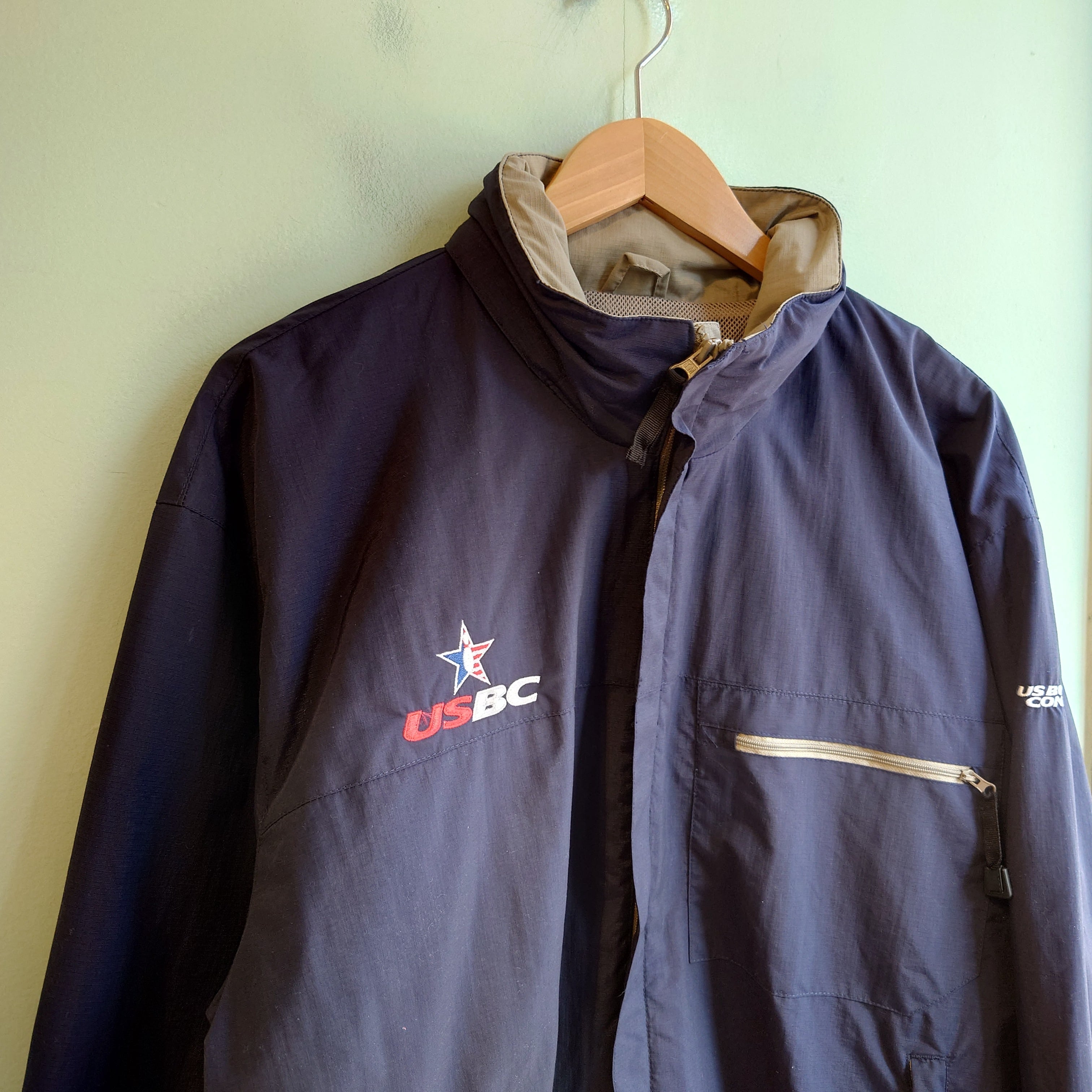 薄手ながら風を通さず保温性が高い、硬めのリップストップナイロン素材のスウィングトップ。ネイビー×ベージュのマルチカラーで、切り替えのセンスも独特、一味違うデザイン。USBC、全米ボウリング協会のDEADSTOCKアイテム。収納可能なフード付き。