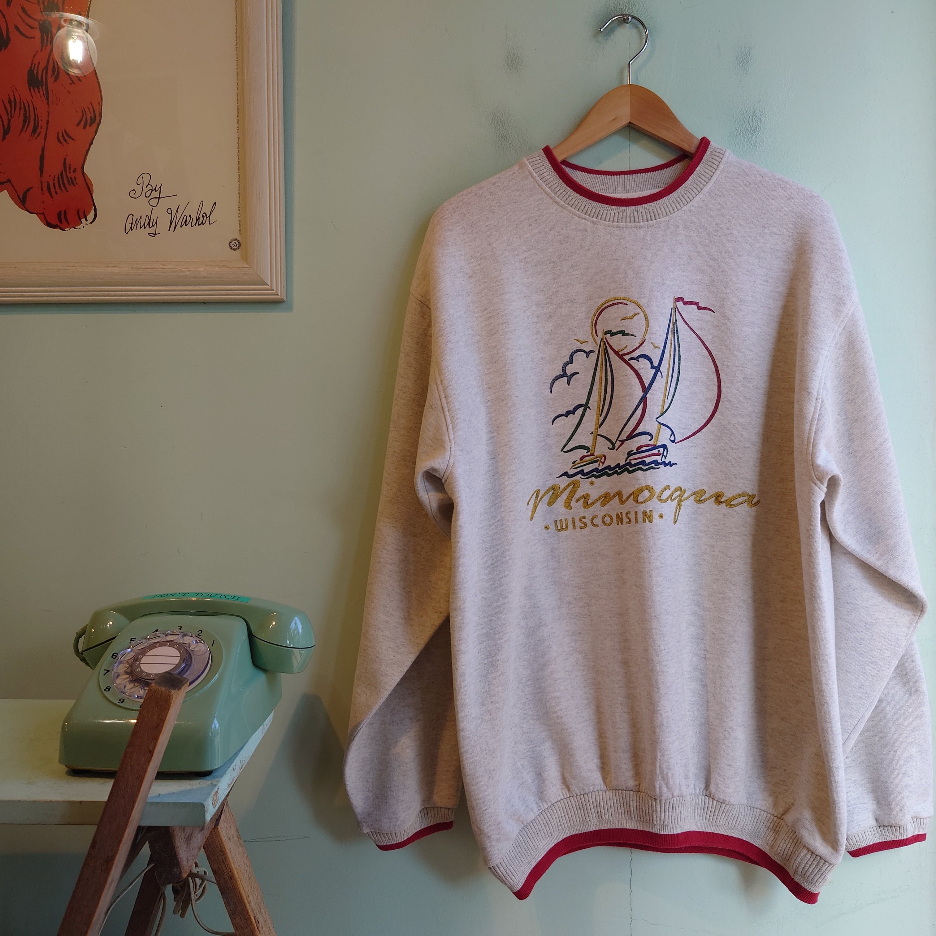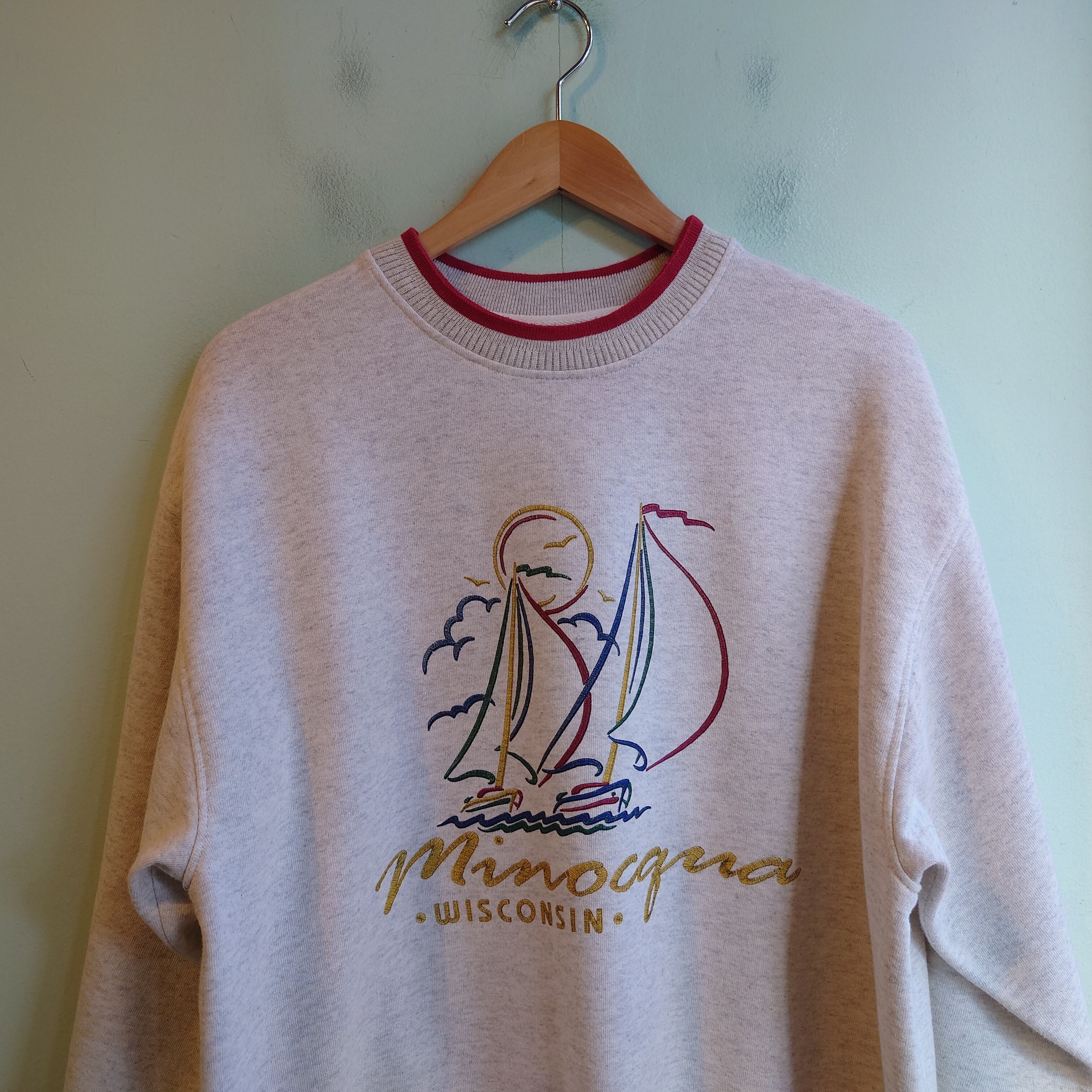 ウィスコンシン州、ミノクア湖のスーベニアスウェット。ニットを思わせるリンガー付きのリブに、手書き風タッチのヨットがリゾートライクでかわいい。ちょこんとした袖リブもユニセックスな雰囲気。王道スウェットとは違う肩の力が抜けたオールドアイテムです◎
