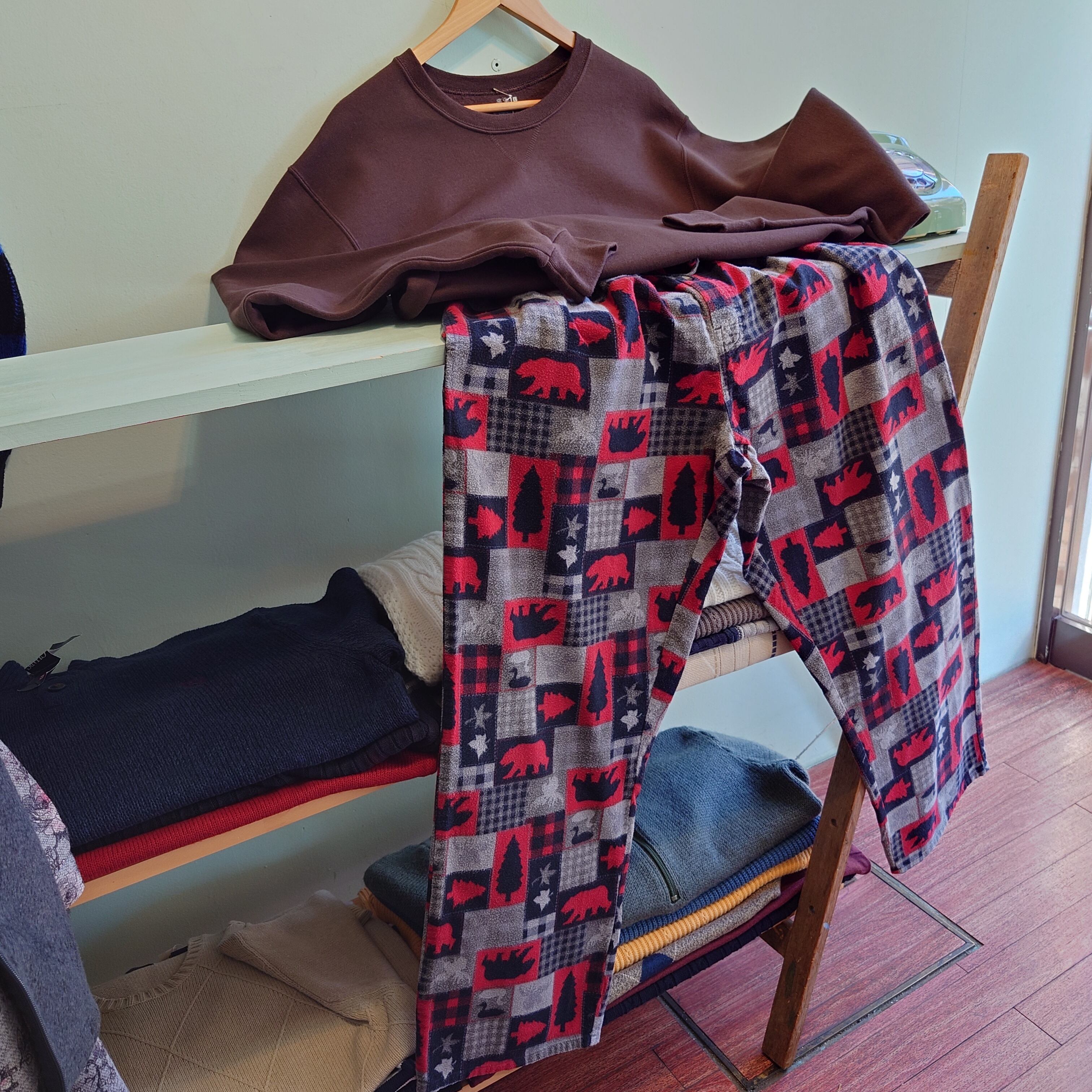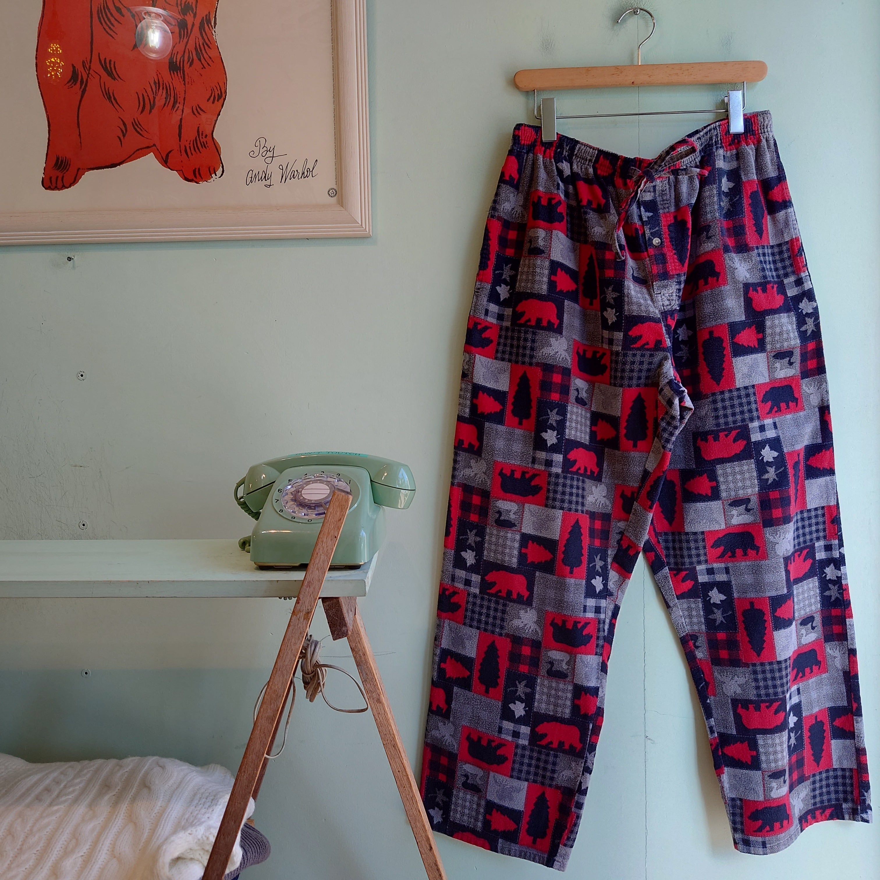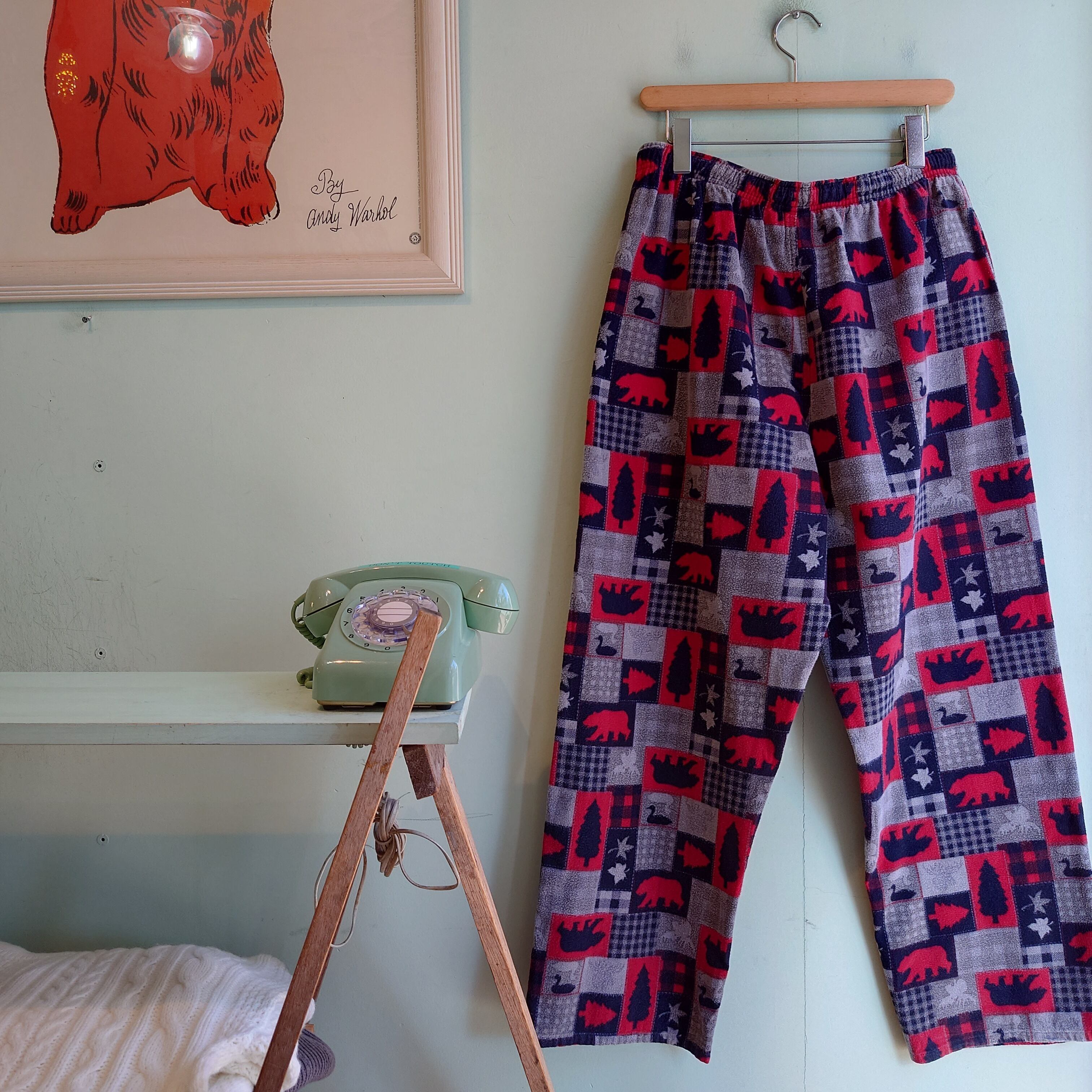 ウォルマート系ブランド、Faded Gloryの総柄パジャマパンツ。イージーパンツの中でもかなりワイドなシルエットがかわいい一本。影絵のようなアニマルモチーフと、フランネルの毛羽立ち感が冬らしい。