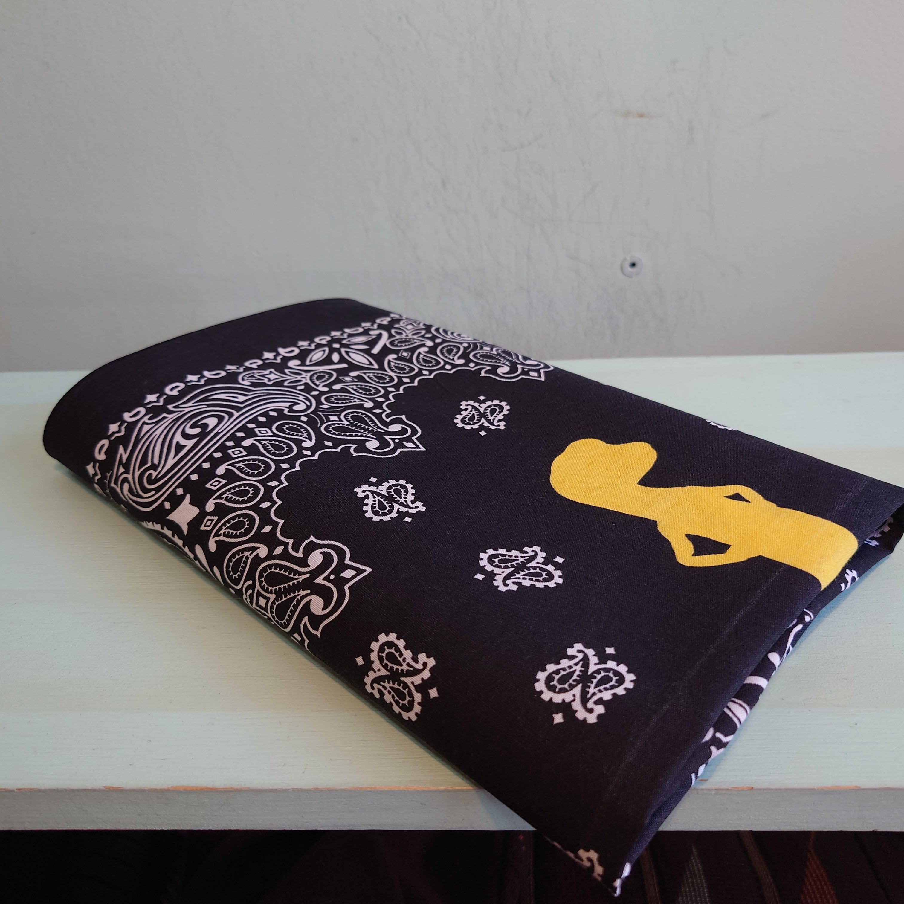 米国、オートバイ保険大手"ガイコ"のノベルティ系バンダナ。バイカーらしい黒のペイズリーながら、企業ロゴとトカゲのイエローがかっこいい。