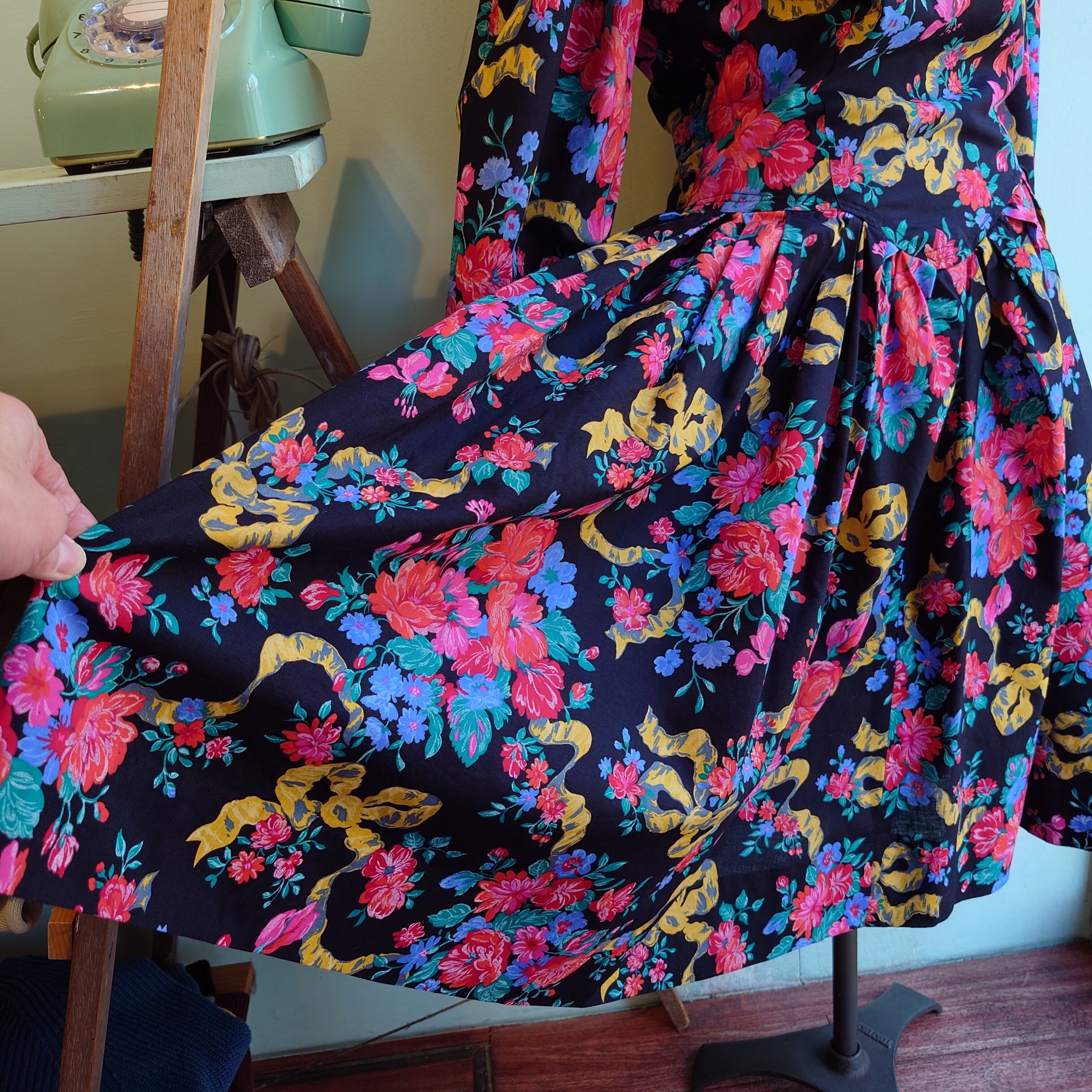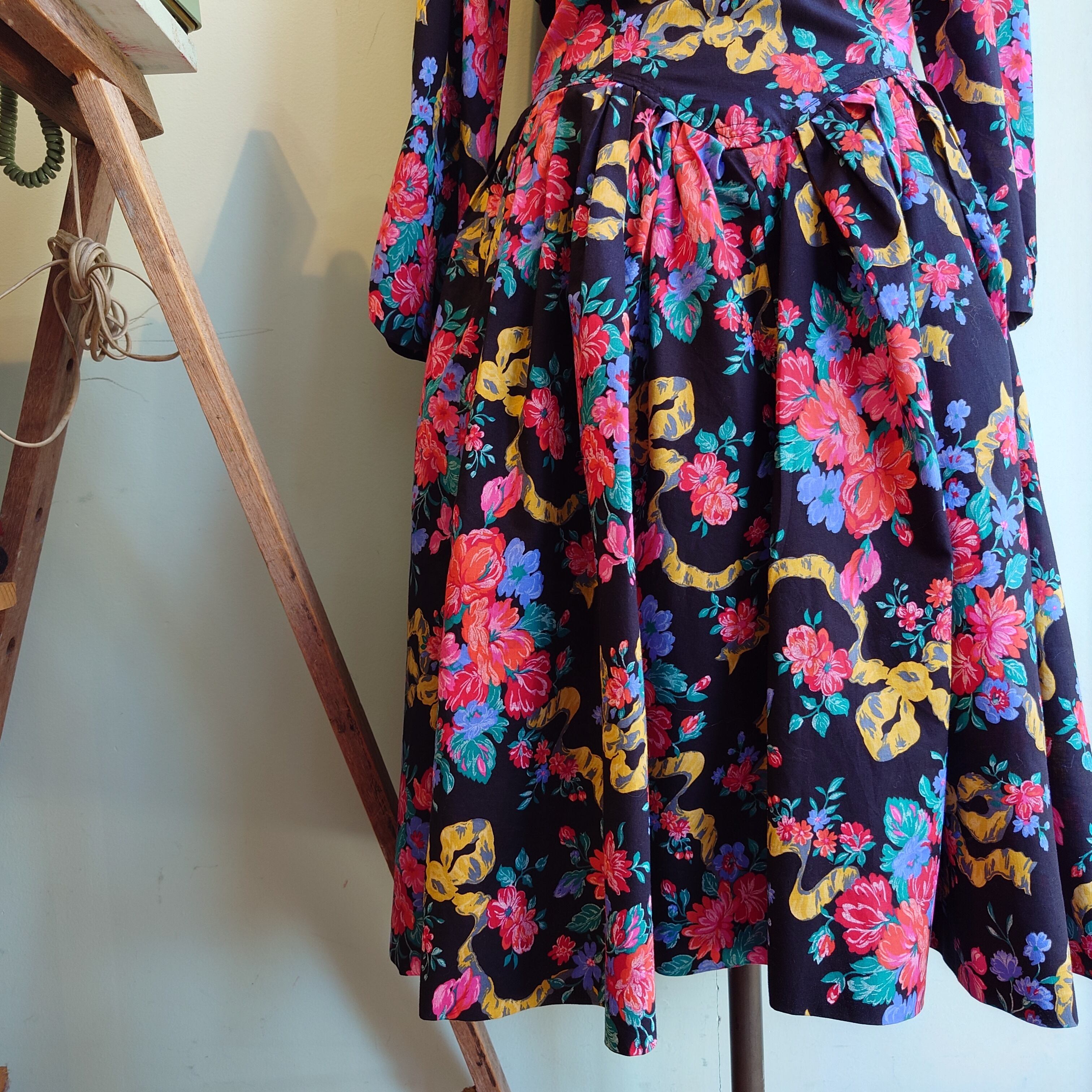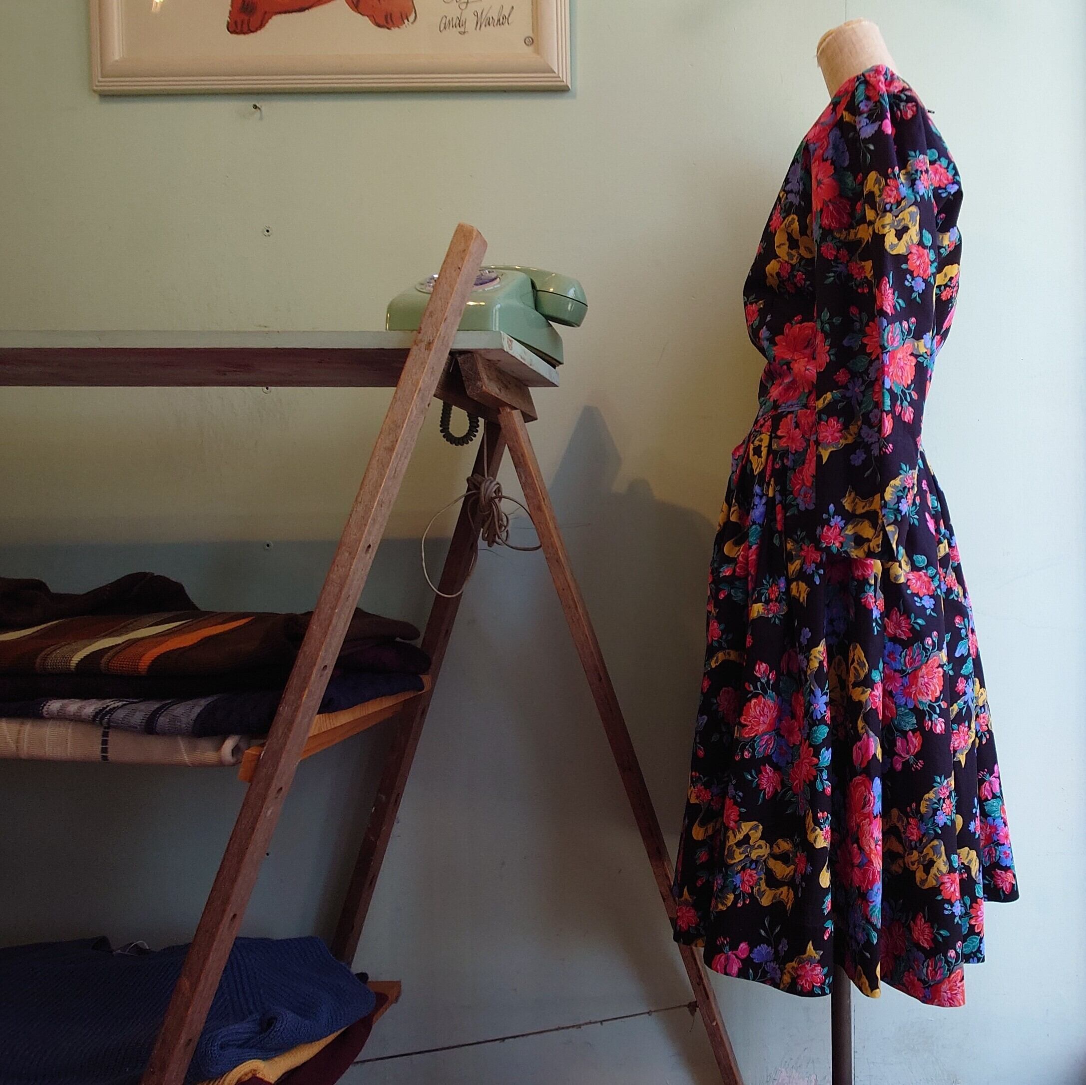 〜80s vintage フラワードレス 総柄ワンピース パフスリーブドレス 黒 花柄 ハンドメイド系