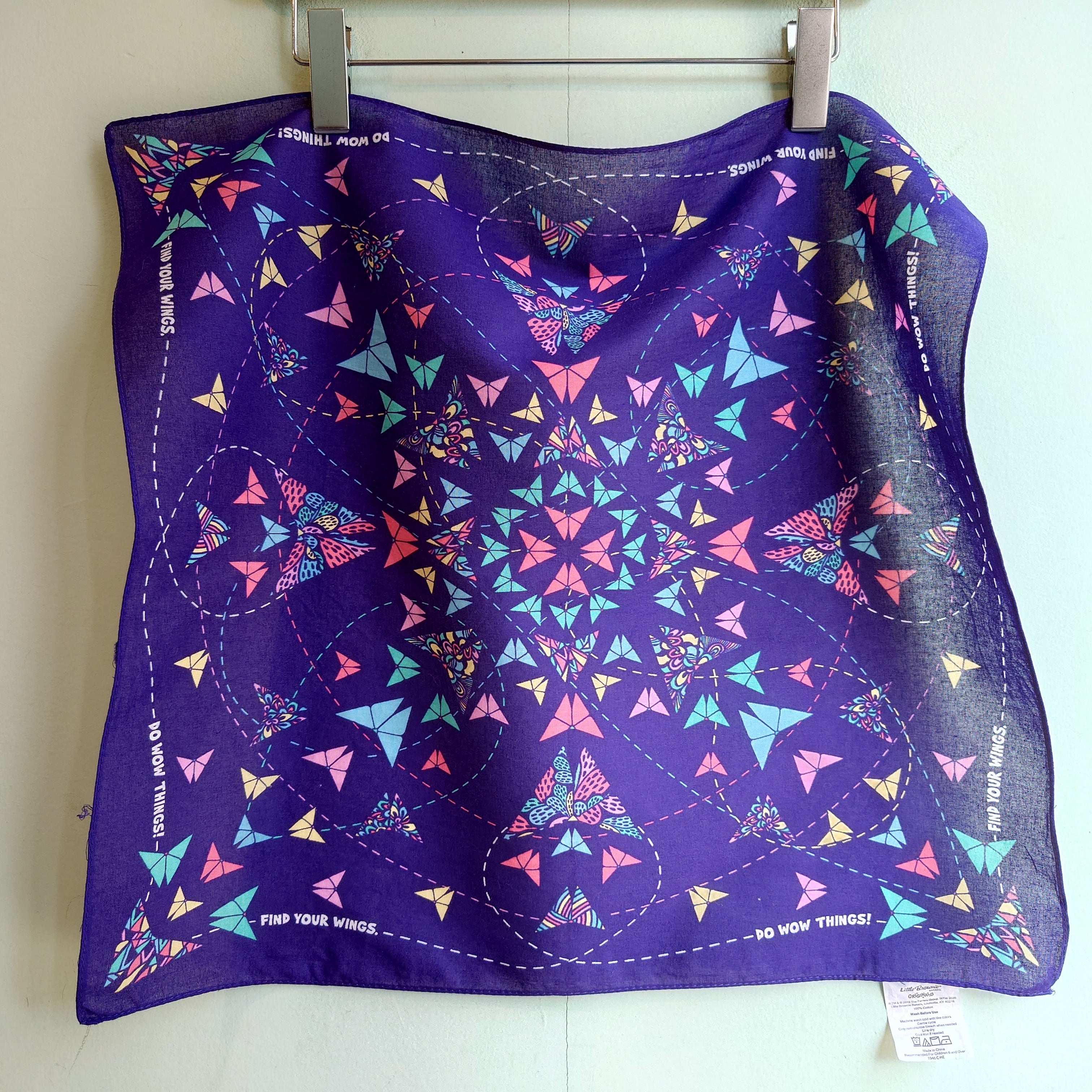 ガールスカウトのイベント、ガールスカウトクッキーと密接な関係があるベーカリーのアドバタイジングバンダナ。紫をベースに、抽象画のような蝶々がガーリー。スカーフかわりに巻くのもおすすめです。
