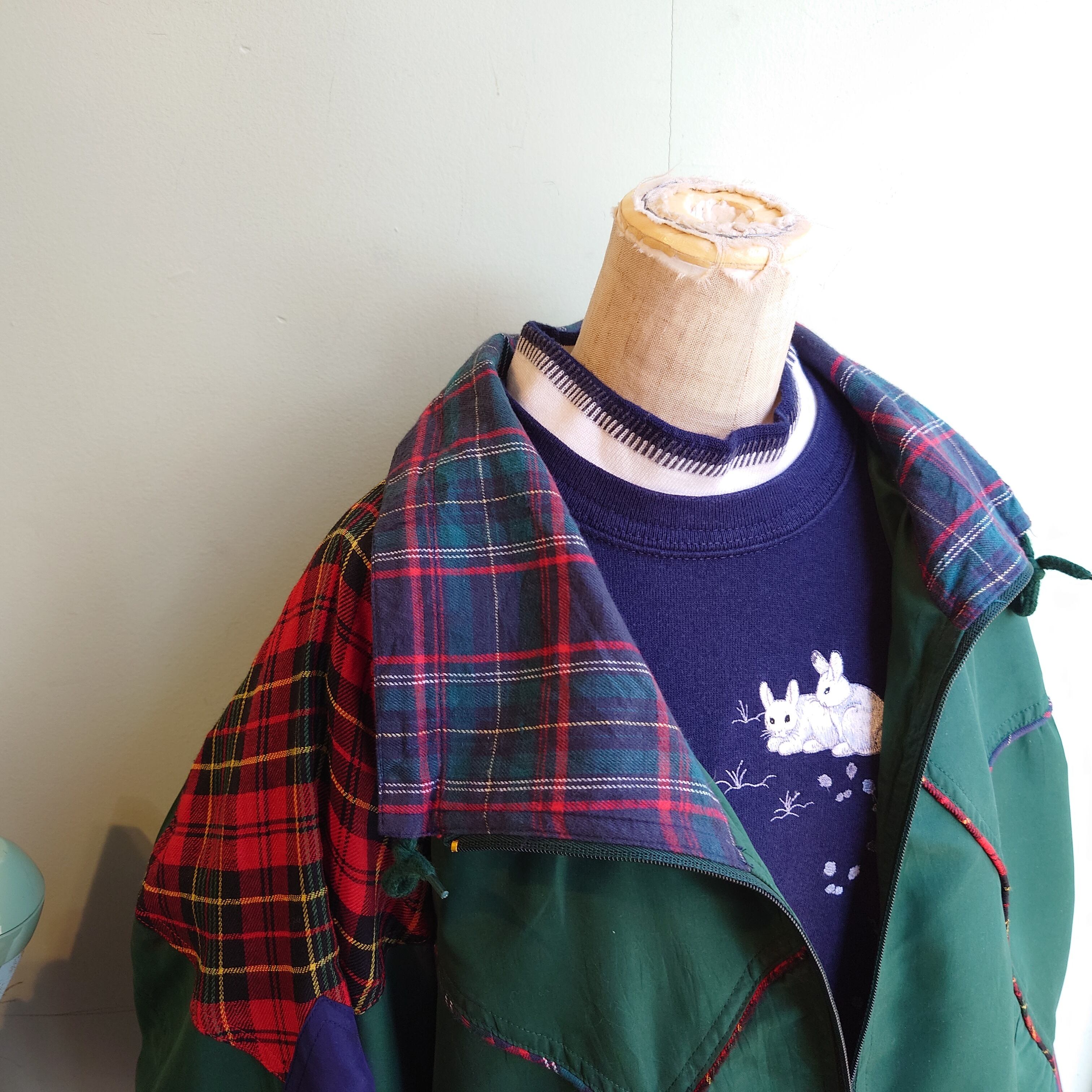 レディース/ユニセックス系のマルチカラージャケット。コロンと丸みのある80s 的シルエットに、紐付きの大きな襟がかわいい。2種類のタータンチェックをパイピングと切り替えで取り入れたセンスにも注目。ふわっと軽めな素材感ながら、裏地付きなので意外な保温性の高さ。タグ付きのデッドストックアイテムとなります。