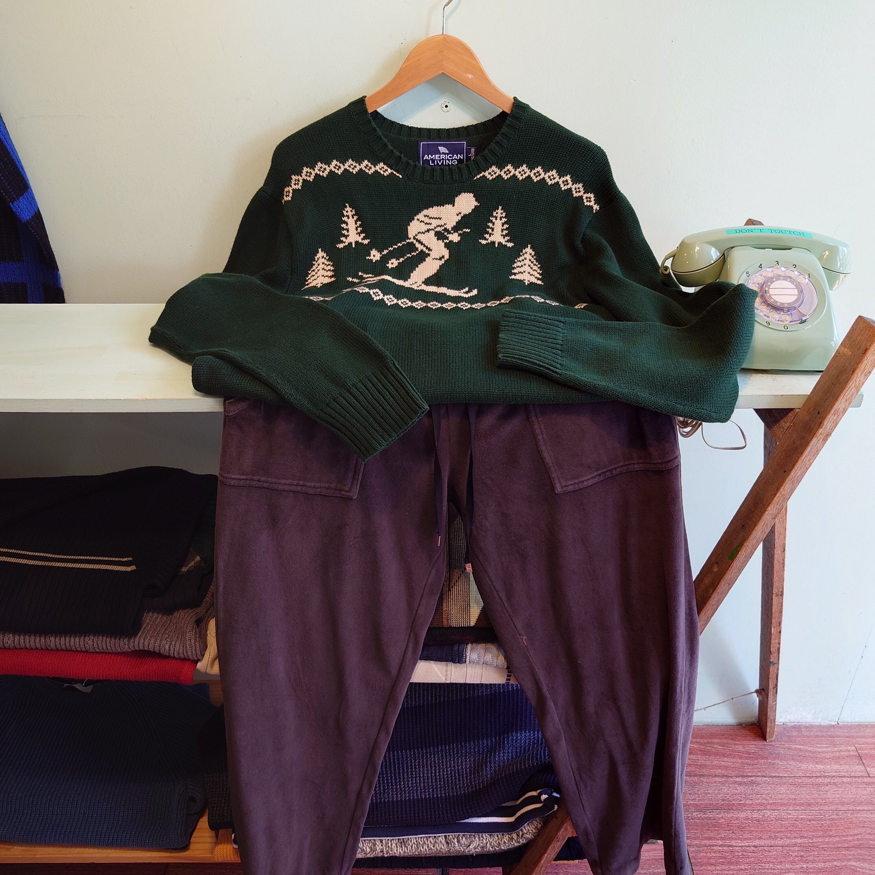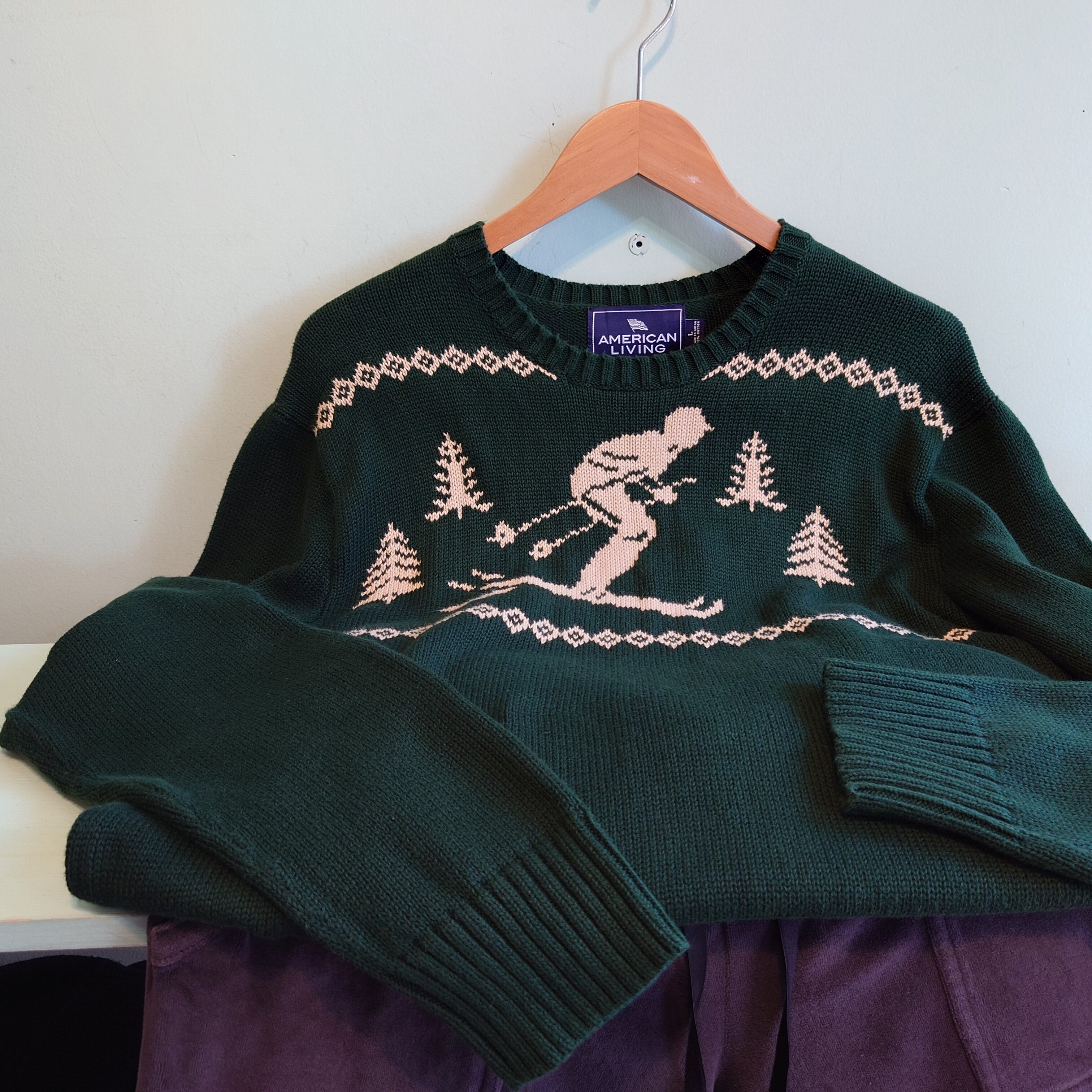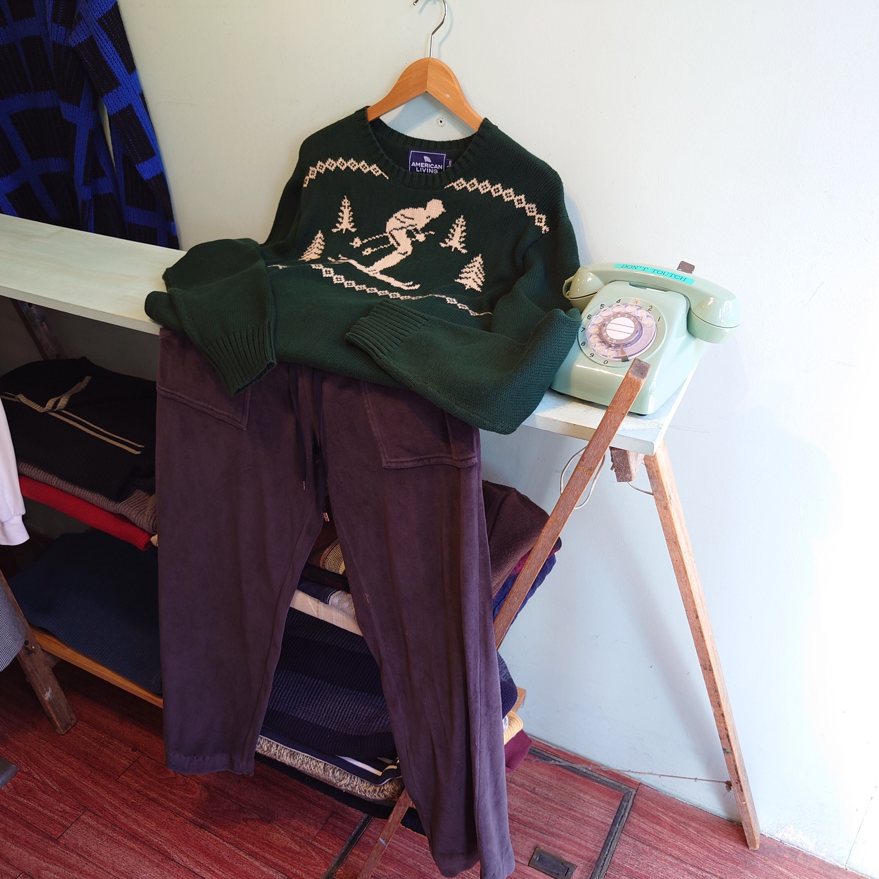 jcペニー系のブランド、AMERICAN LIVINGのスキー柄ニット。ローゲージの織り目で、レトロゲームのドット絵ようなアートがかわいい。スウェット感覚でざっくりかぶれて、チクチクが苦手なお客様にも着やすい一枚です◎