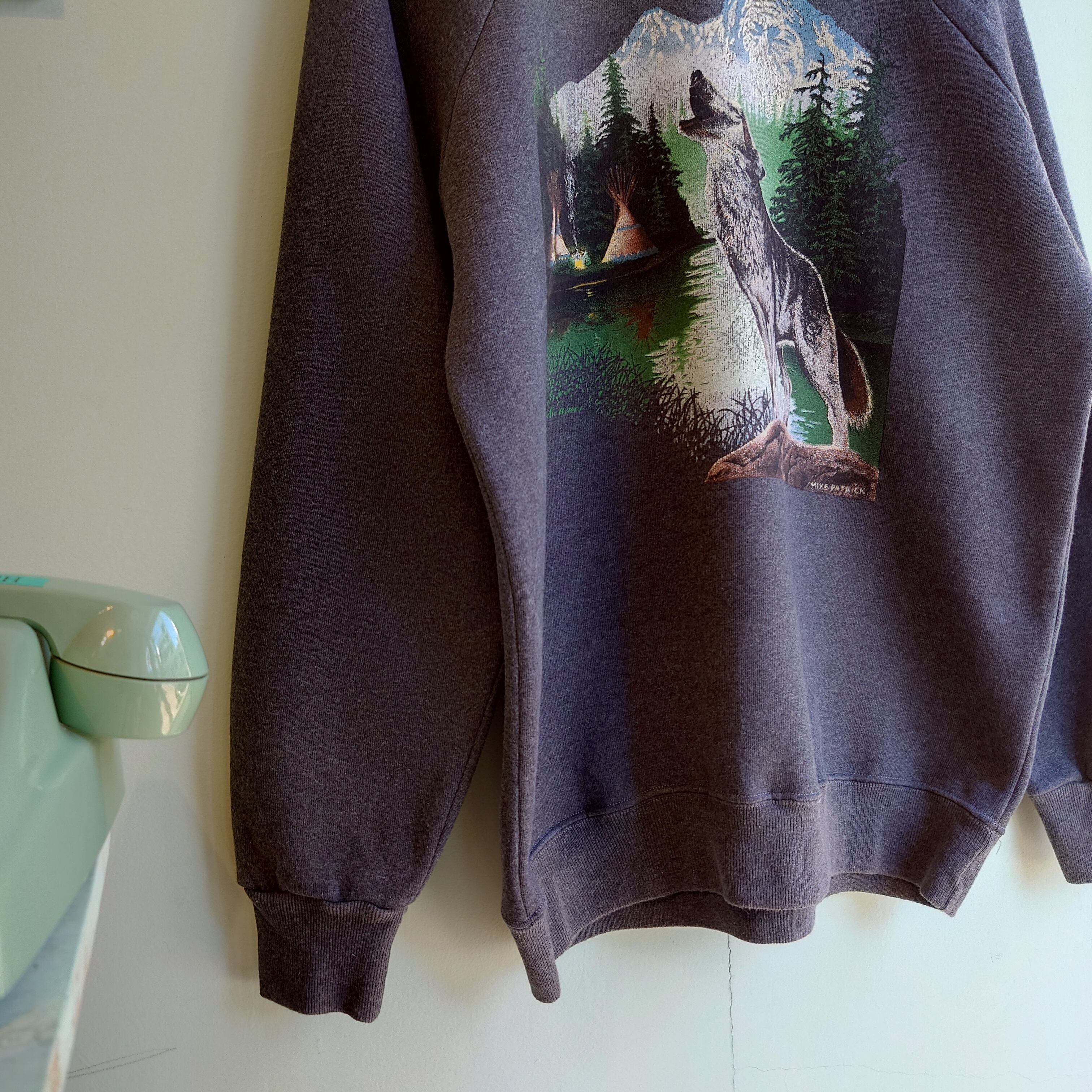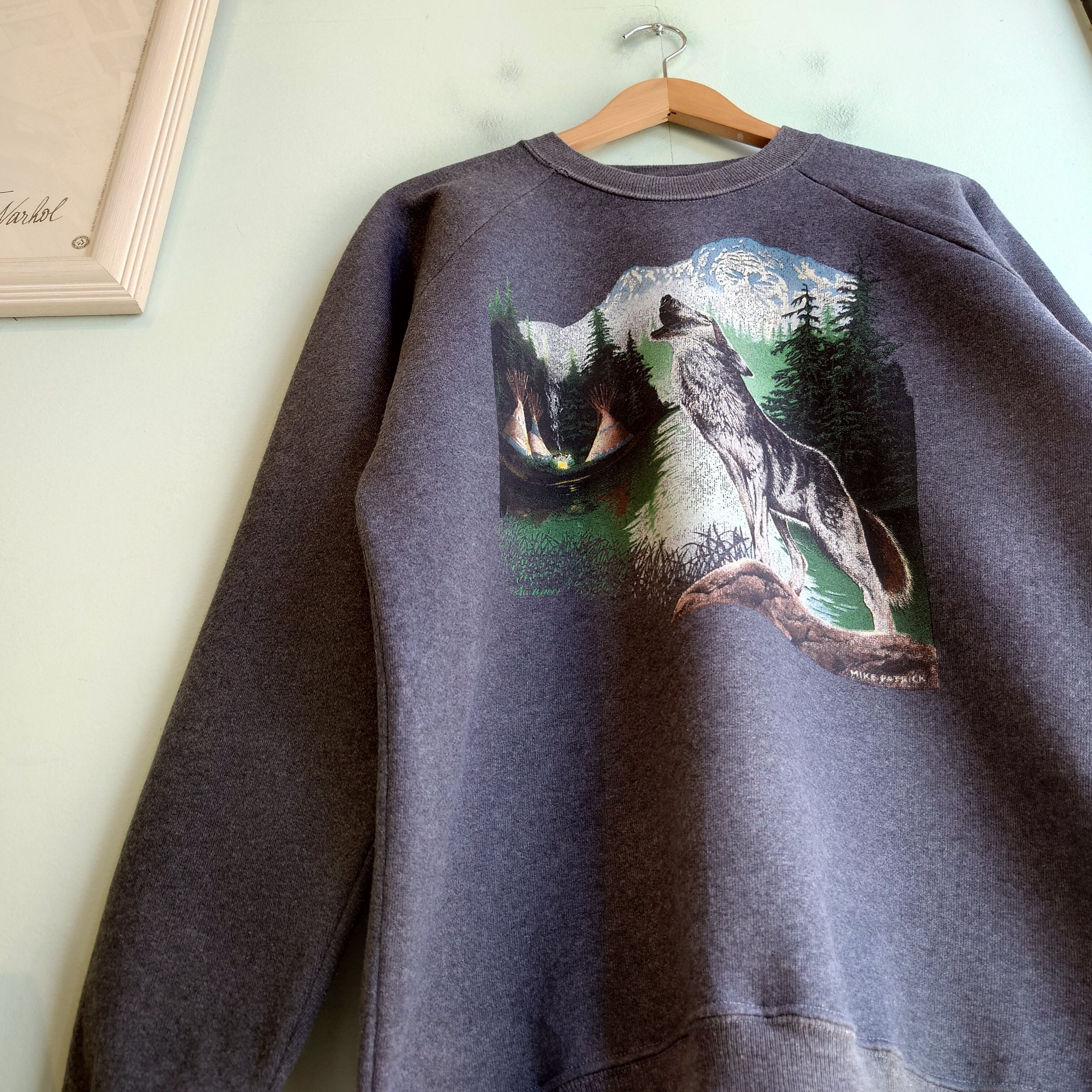 オオカミをモチーフにしたヴィンテージアニマルスウェット。油絵のようなアート感、先住民族の移動式住居、ティーピーがデザインされた神聖な雰囲気が◎。ラグランスリーブながら、ヘヴィー目な生地感が珍しく、すっきりシルエットながらざっくりした雰囲気も。