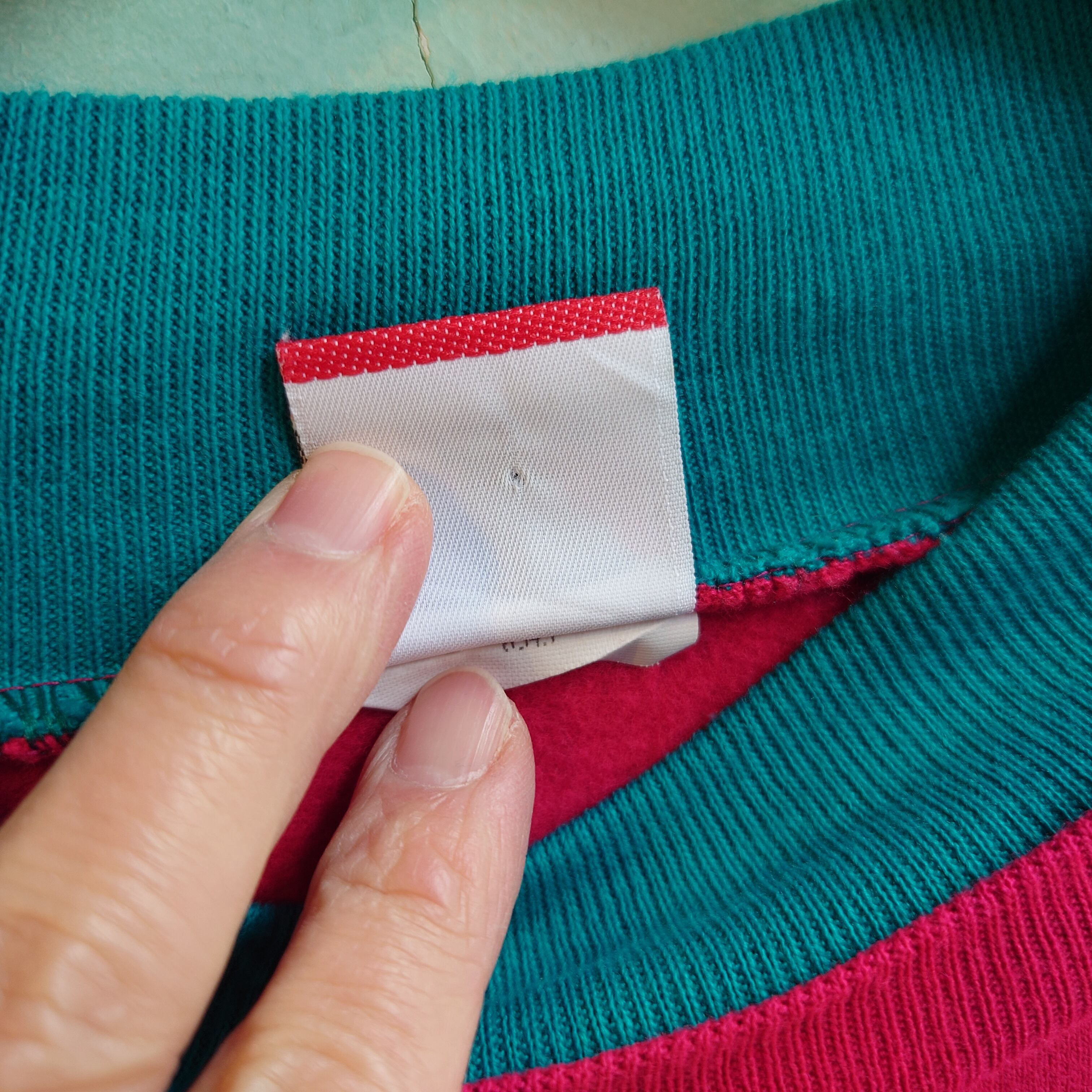 胸元にニットの飾りがついたガーリー系ヴィンテージスウェット。ニットがローゲージであら目で、レトロゲームのドットのような可愛さ。アクリル系スウェットのような柔らかみのある生地感で、個性的な色合いがひらひら動くシルエットも◎。