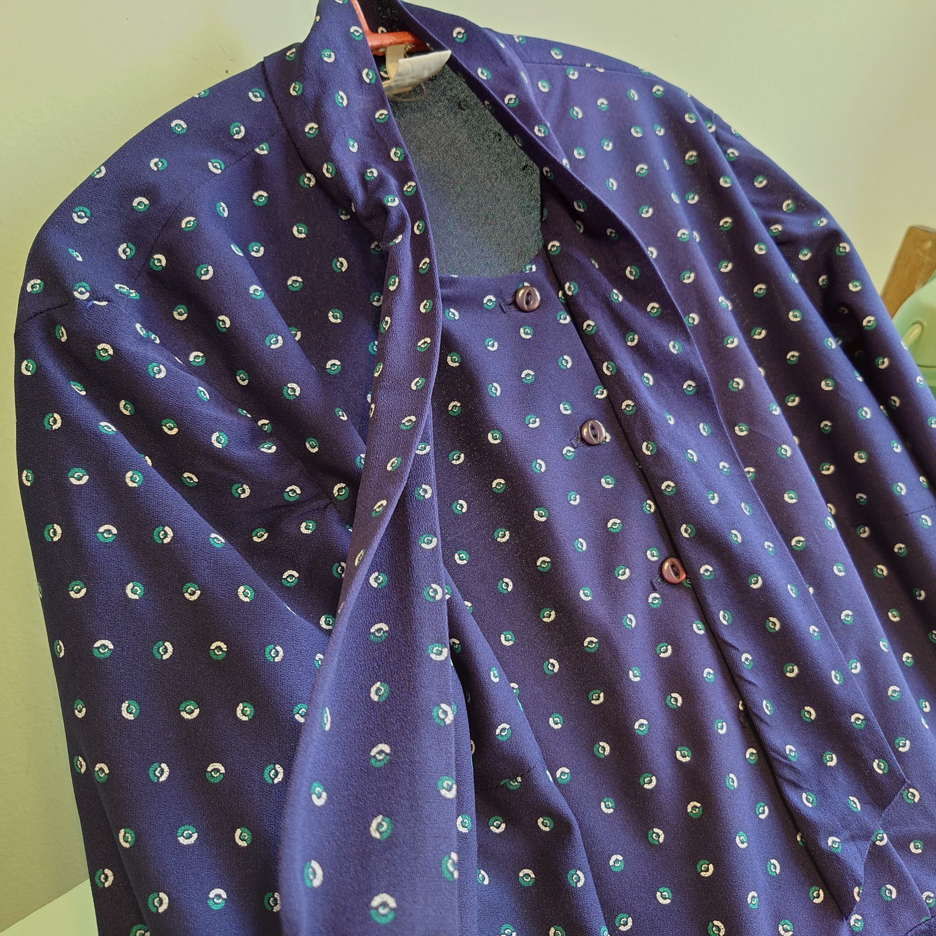 カプセルのようなドットのスタプレ系生地と、リネンライクなザラザラ生地の切り替えワンピース。襟はスカーフを結んで合わせるような仕様。生地感はレトロフューチャーな70年代風でも、ふんわりゆったりフレアするストンとしたシルエットが意外。自然に合わせられて、何気なくヴィンテージ感が際立つグッドドレス。