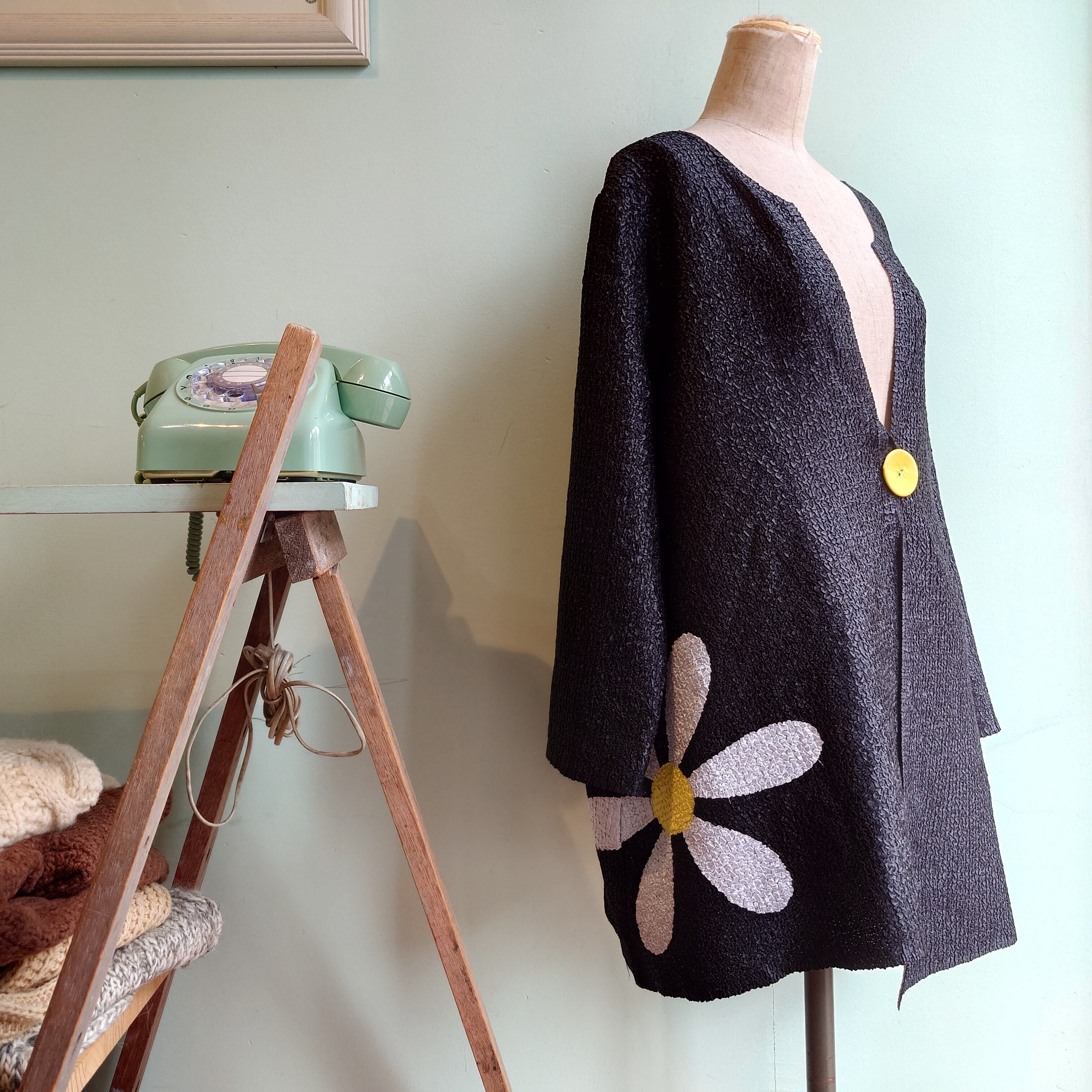 カーディガンタイプでは珍しい、ポップコーン素材のカーディガン。白黒面リバーシブルでどちら側も黄色い大きなボタンがアクセントに。メタリックでドレッシーな光沢素材と、不思議なポップネスを併せ持った一枚。