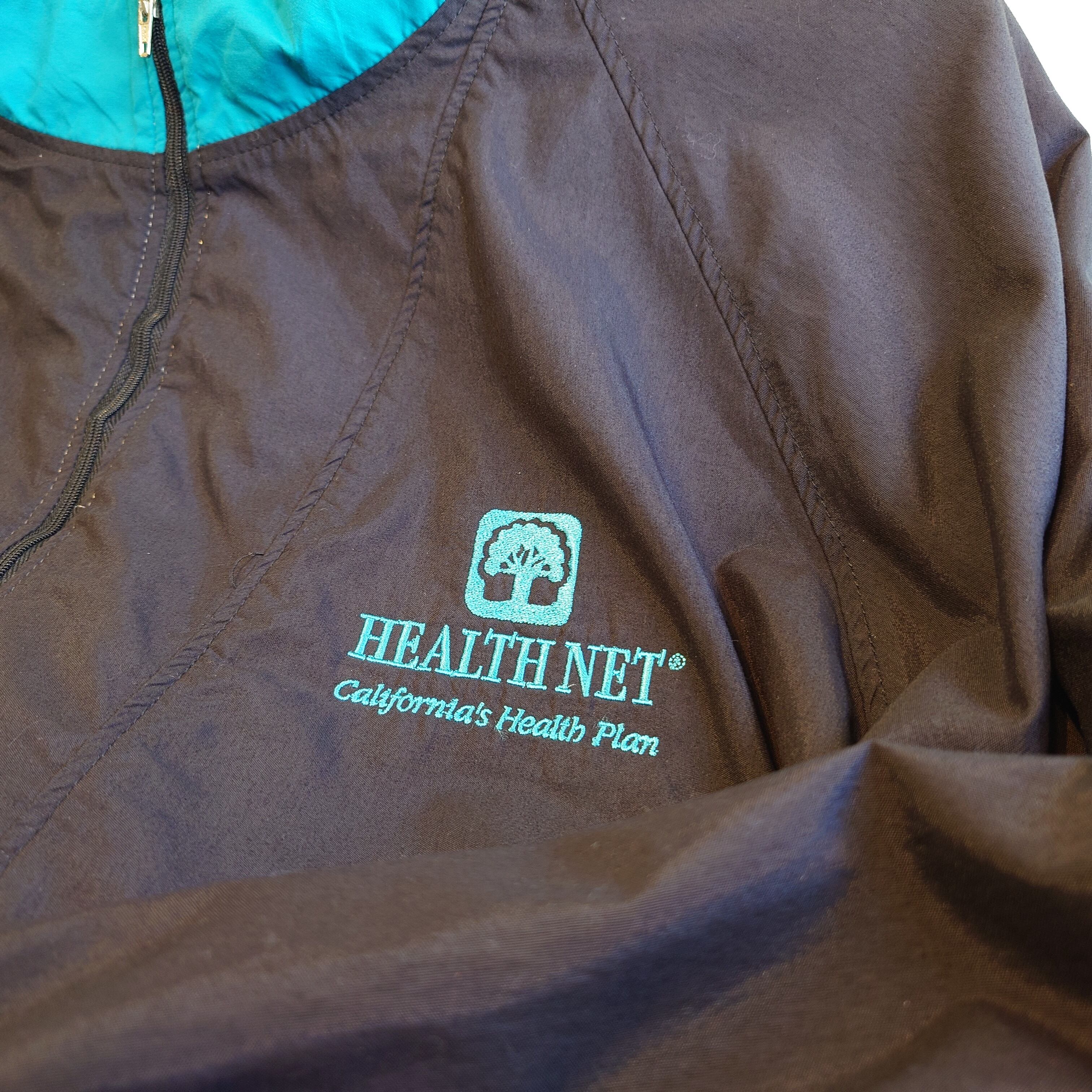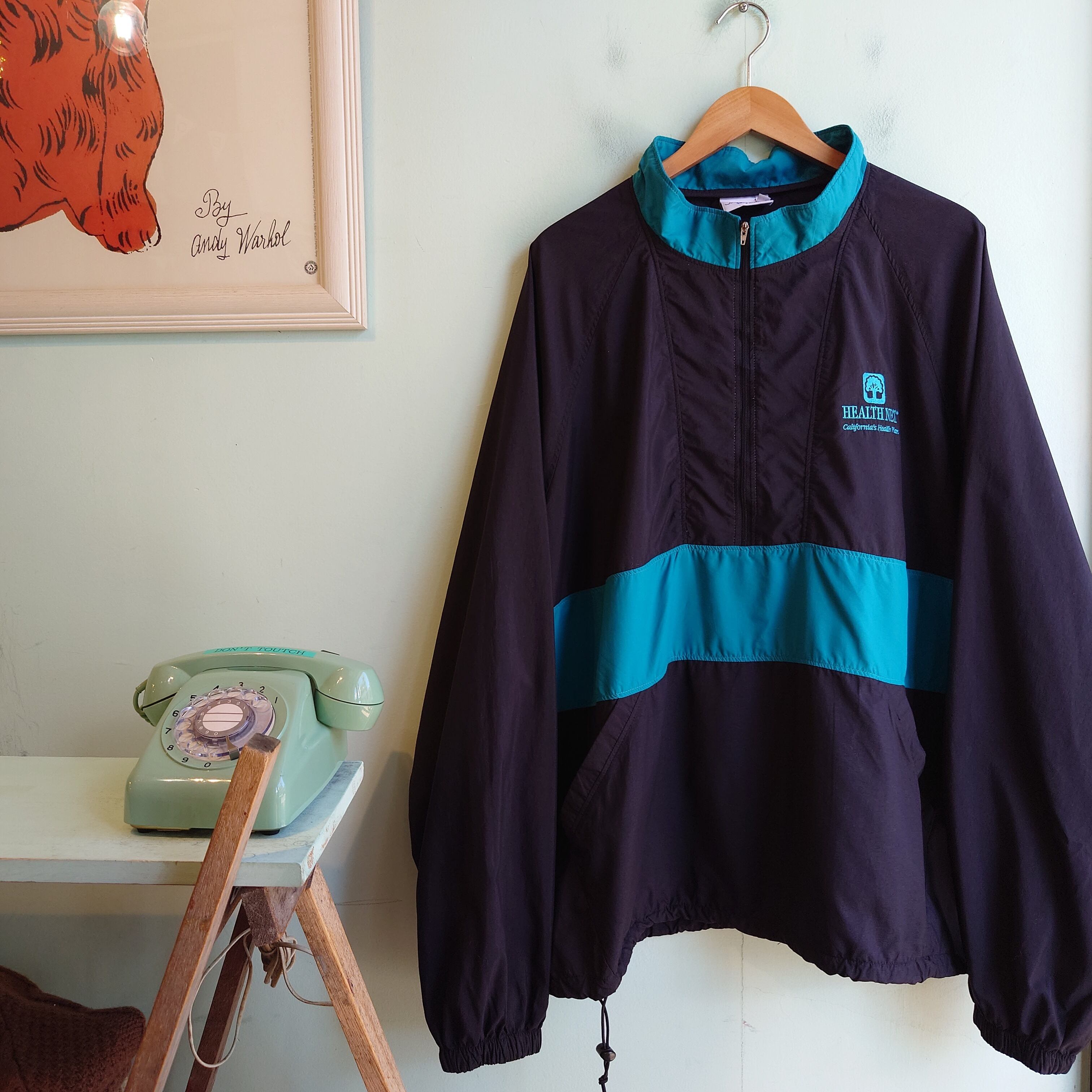 ブラック×グリーンの切り替えがかわいいハーフジッププルオーバー。アノラックに近いストンとしたシルエットに、フーディーのようなポケット、裾にかけて斜めに走る切り替え、遊び心あるデザインが◎。ロゴは実在する保険会社の企業ロゴ。可愛さよし、古着らしさしっかりの1枚。