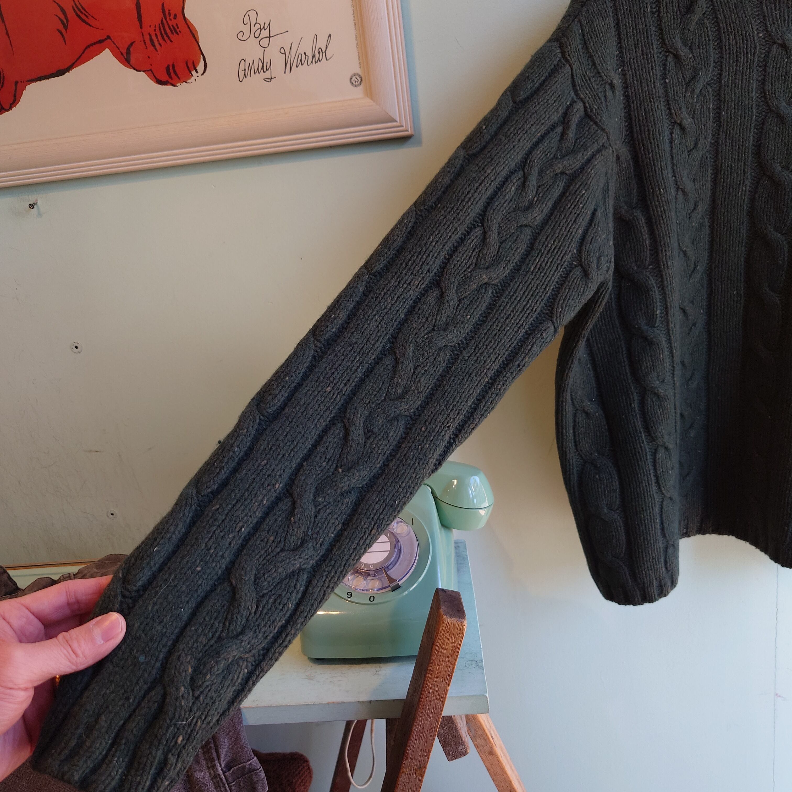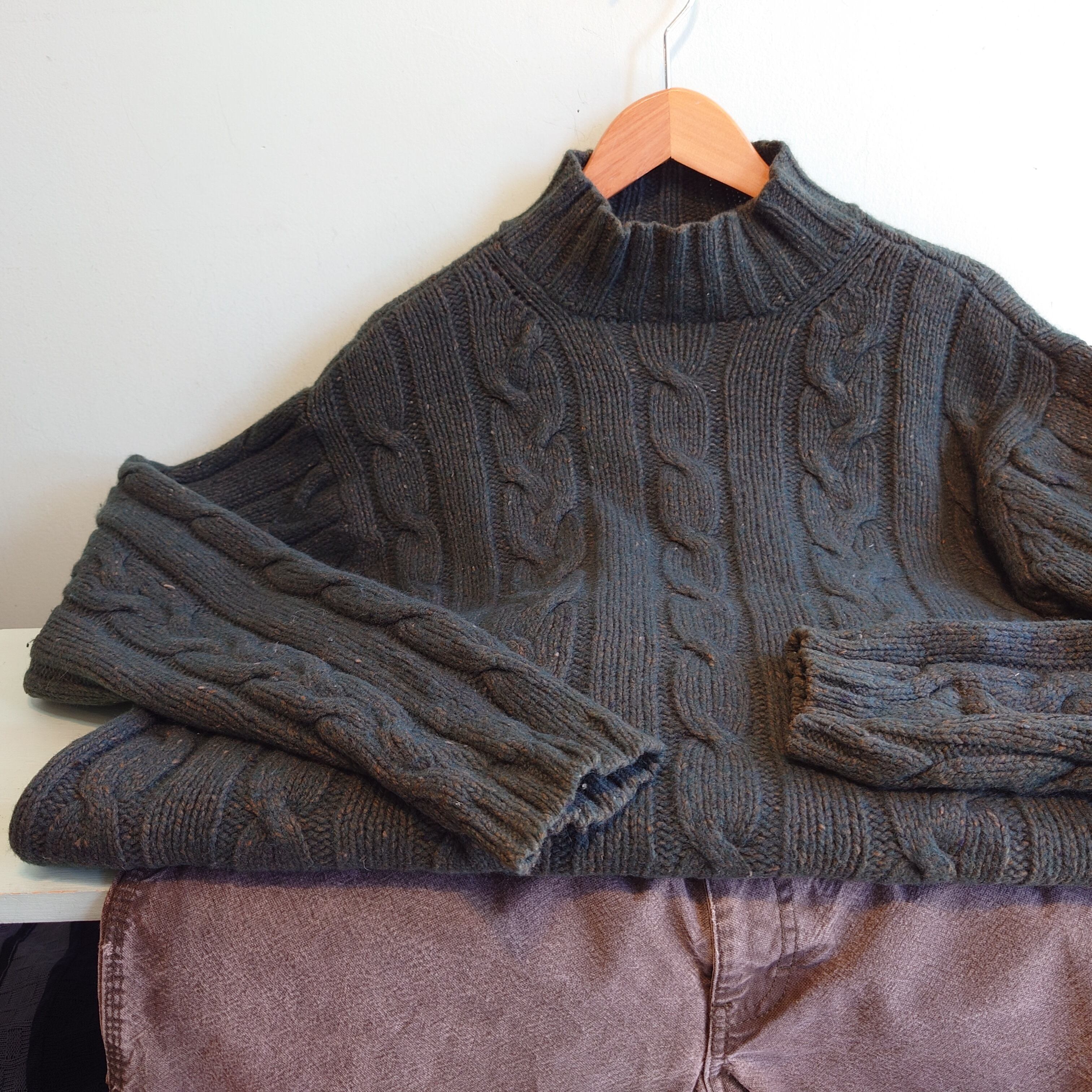 深緑にブラウンの糸目がレアなアメリカンイーグルのニット。アランニット系のケーブル編みのざっくり感と温かみのあるハイネックながら、重すぎない着心地がいい。やや短めでボクシーなシルエットでボトム選ばず。デニムやチノと合わせるだけで様になる、いい雰囲気のセーターです。