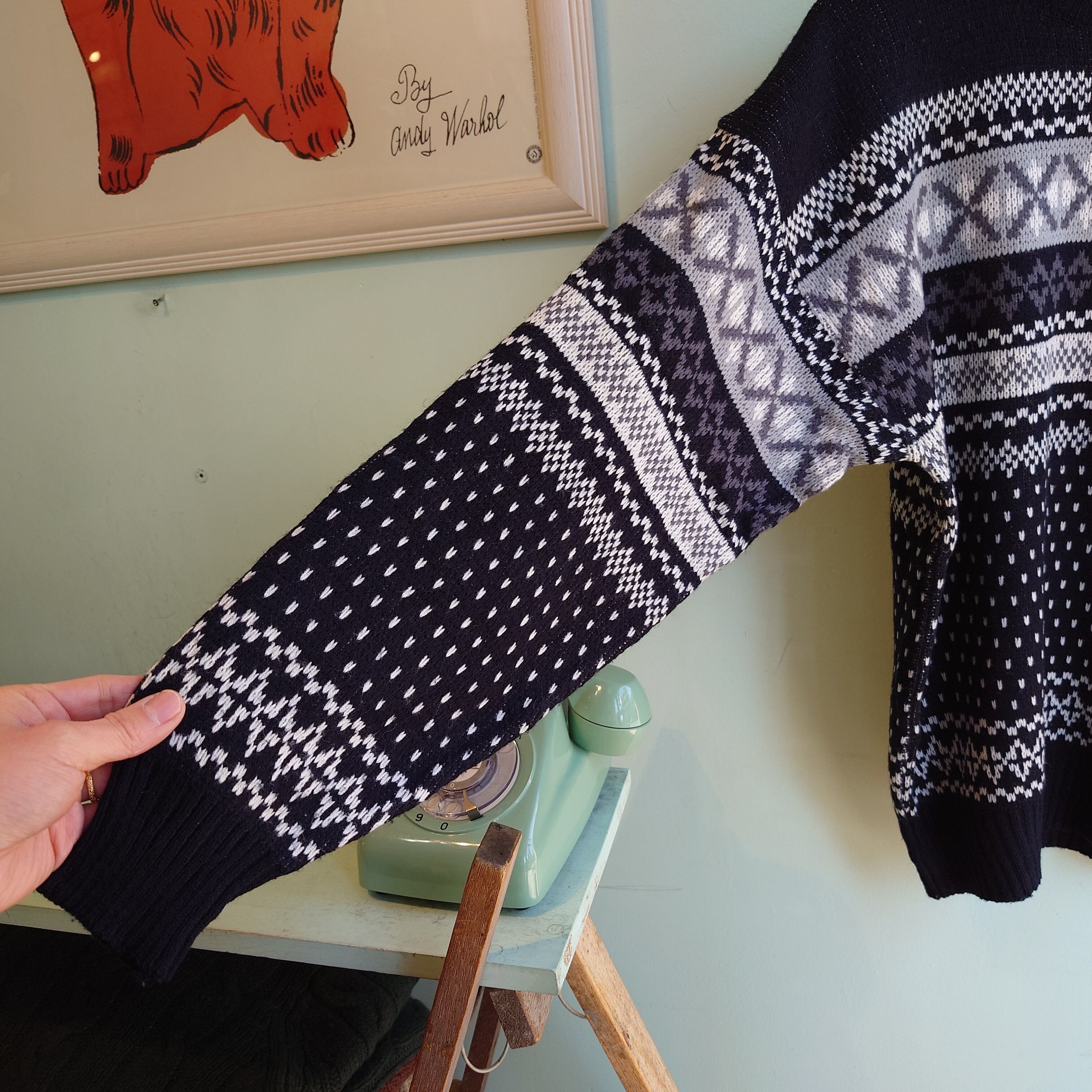 ネイティブ柄やスノーパターンをベースにしながら、レトロゲームのドットのような雰囲気の織りがかわいいアクリルニット。袖と裾にはさり気なく十字架も。柔らかな目なアクリル素材はひらひら感あり、スウェットのようなコロンも丸めなシルエットで普段ニットを着ないお客様にもおすすめ。