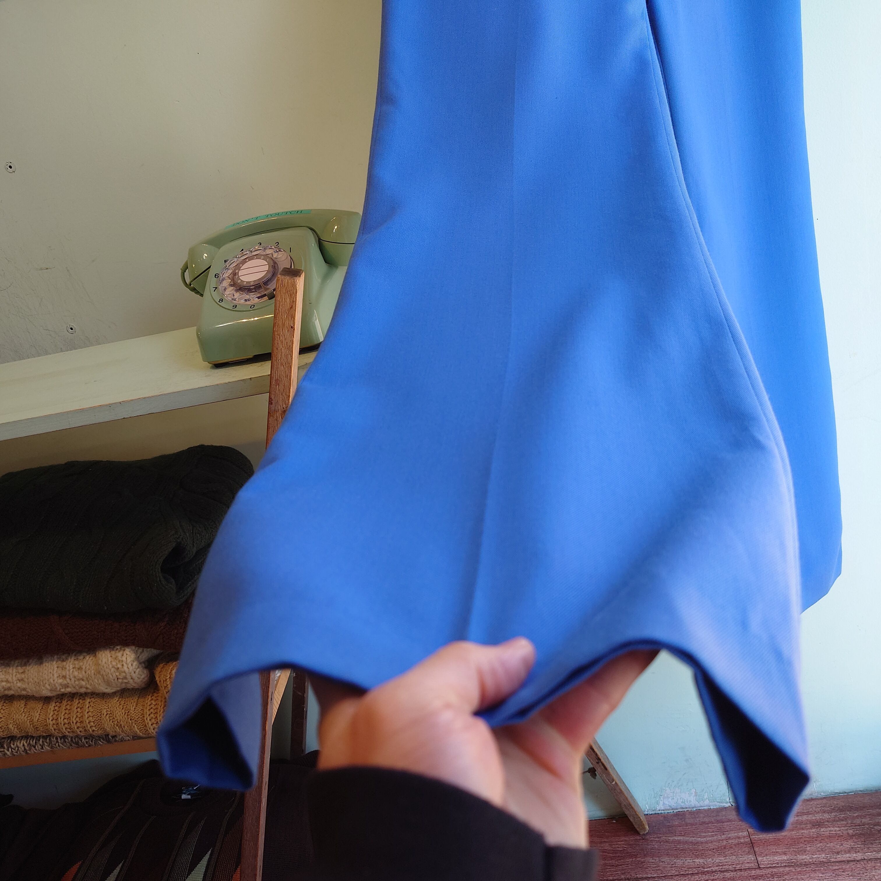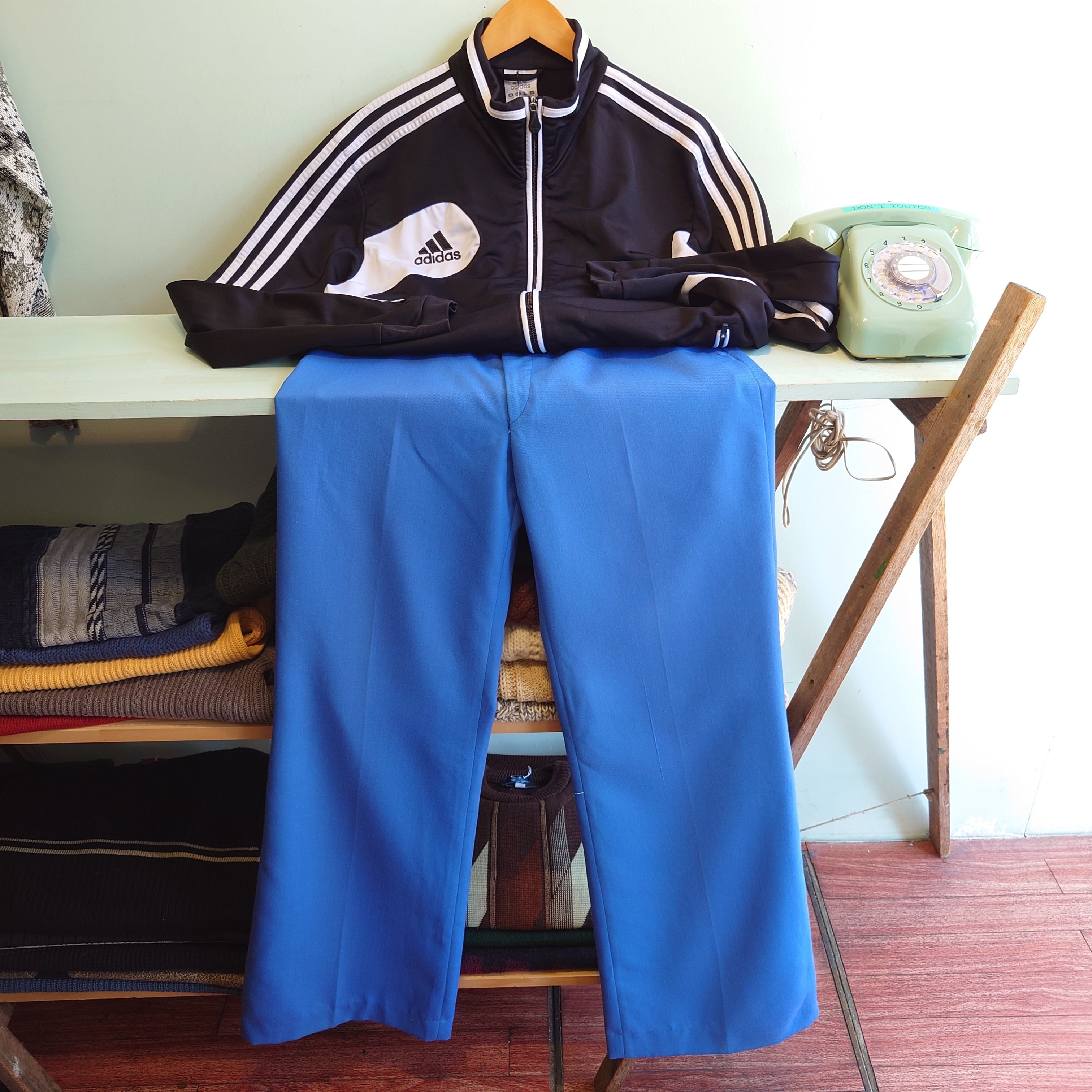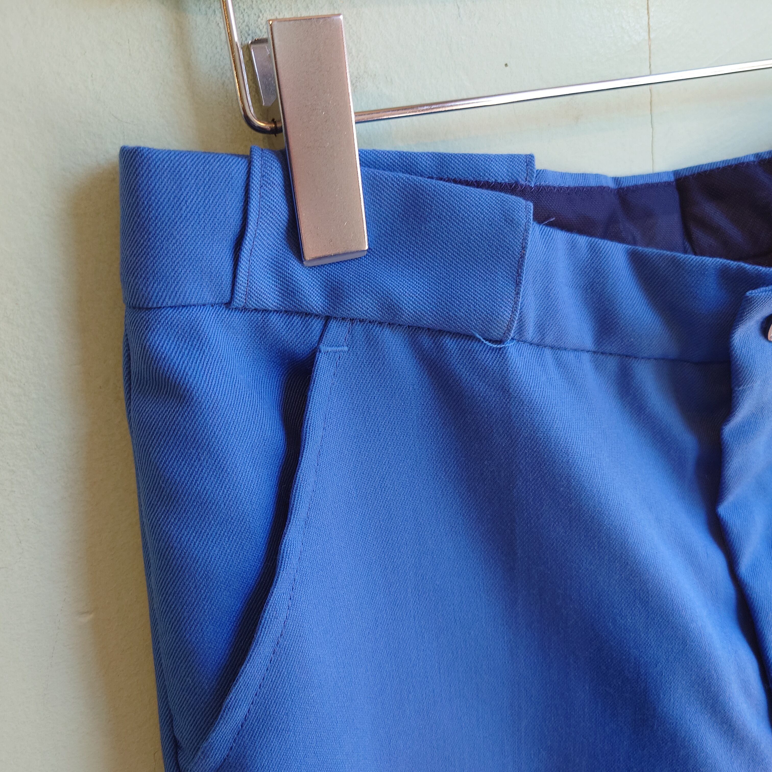 60-70年代にヨーロッパで流行した、ユーラルテルガルというスタプレ系素材のヴィンテージスラックス。スラックス系では珍しい明るさのある青みが、更に新鮮なベルボトム並みに広がるフレア。スウェットやスポーツアイテムにラフに合わせられる雰囲気も嬉しいポイント。