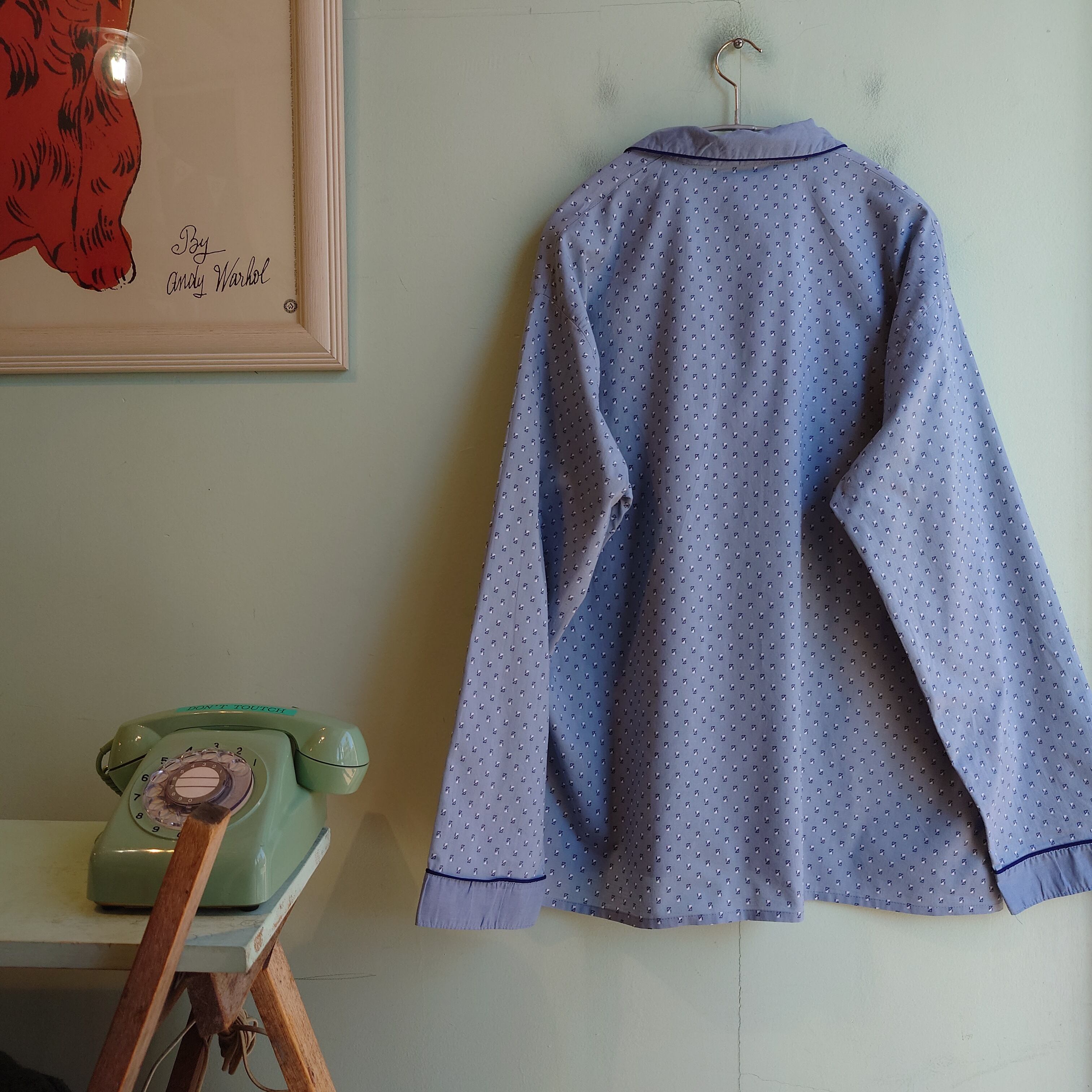 トライアングル柄を合わせたミニマムな総柄がかわいい、ユーロ系のパジャマシャツ。ヘチマ襟風のデザインがレアで、アシンメトリーなポケットも個性派。ナイトウエアらしい水色で、ひと目でわかるパジャマ感も逆に嬉しいポイント。