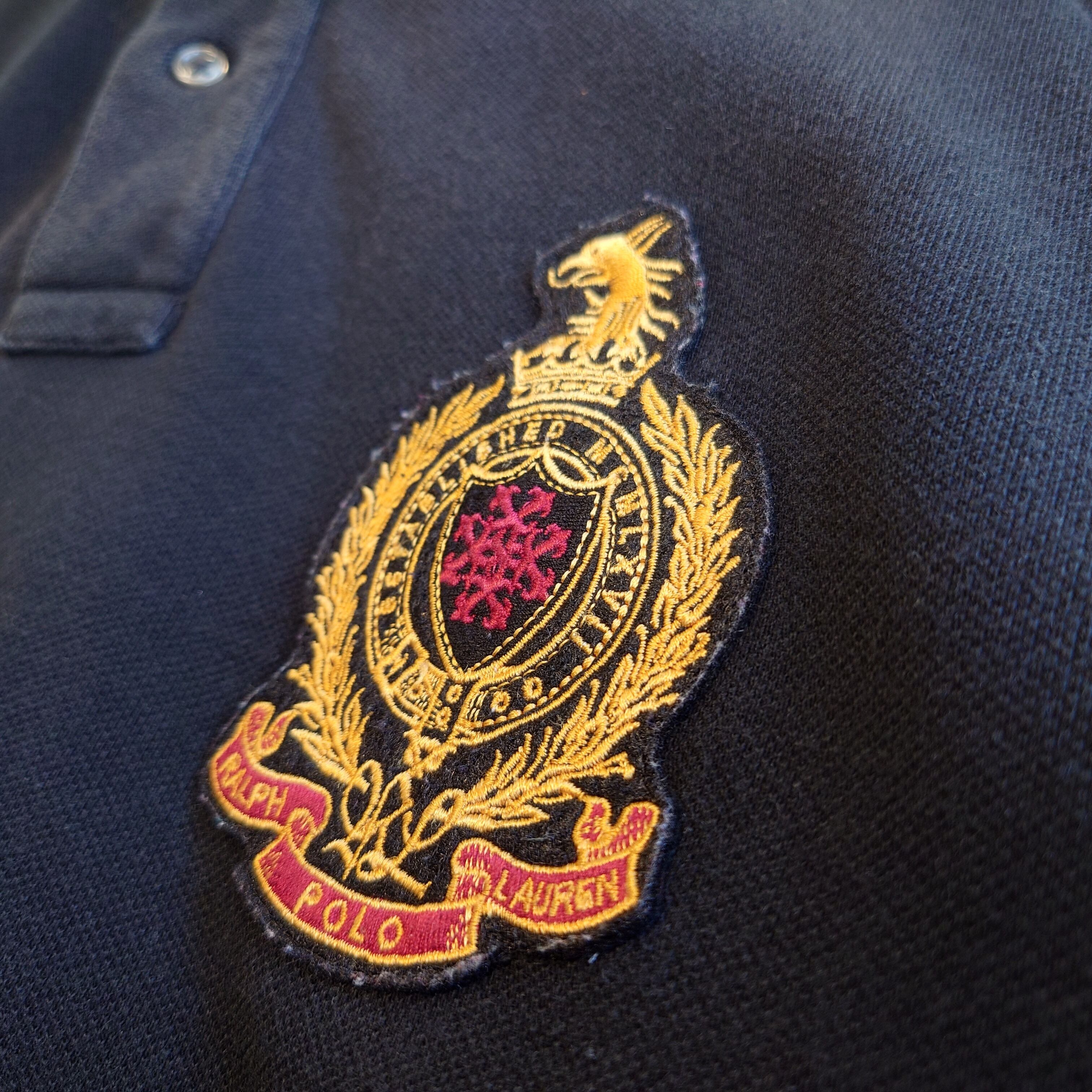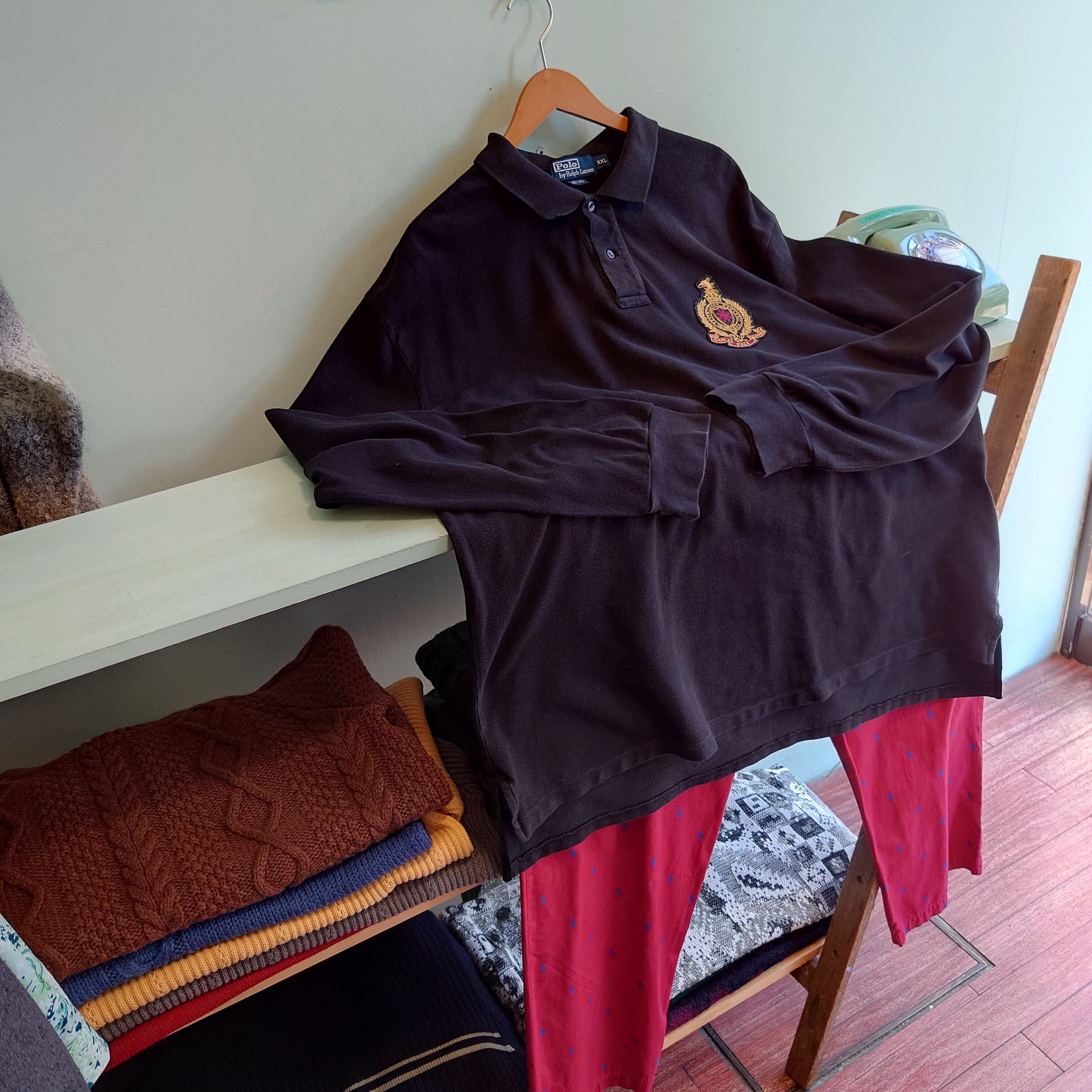 ラルフローレン初期のエンブレムをまとった、黒のロングスリーブポロシャツ。腰まで隠れるスーパービッグサイズで、女子はワンピース的なコーデでかわいいシルエット。古めなラルフならではの味わいがあるアイテムです。