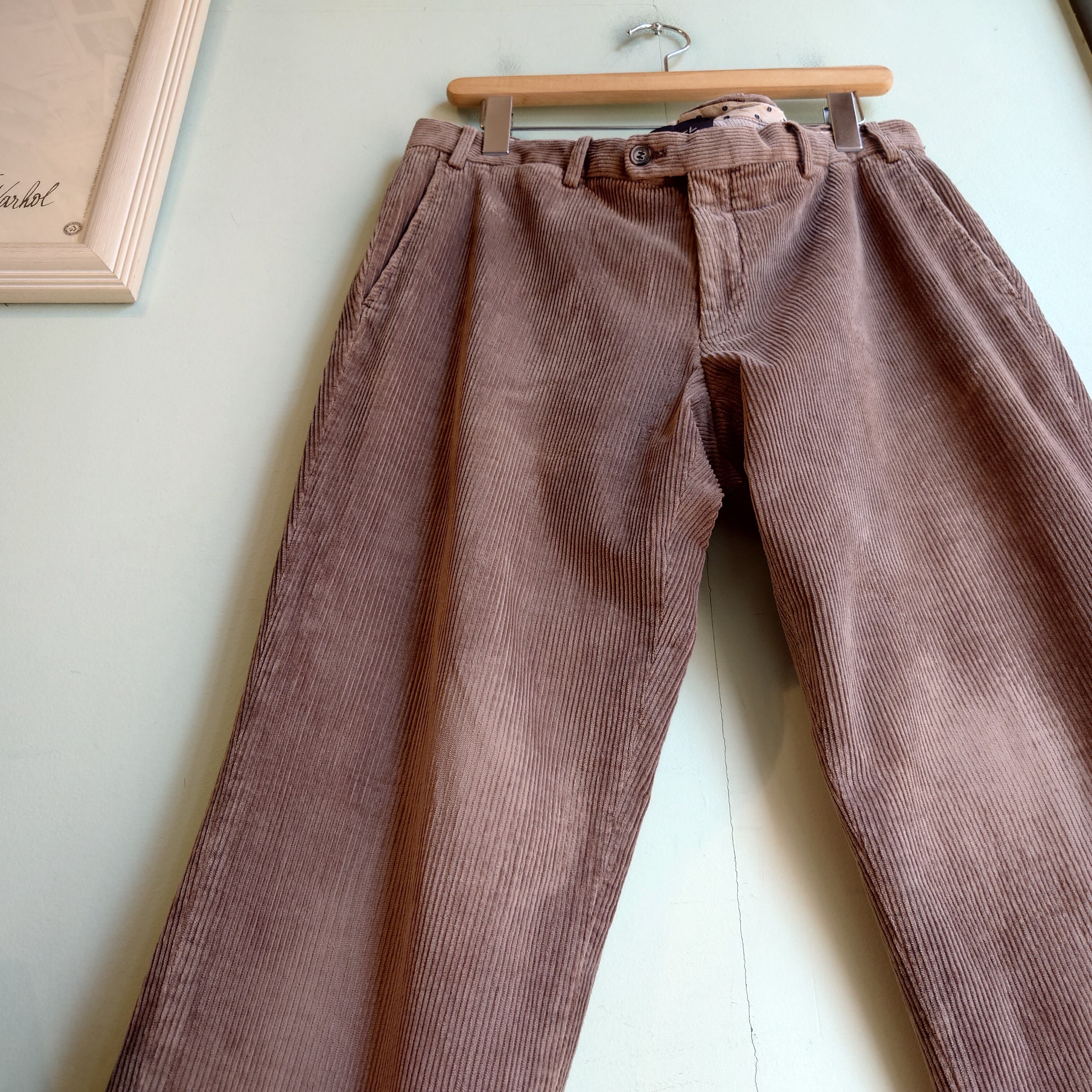 の太畝コーデュロイパンツ。ベルトループ周りや裏地の上品な作りに品があふれる一本。シルエットはトラウザー系では珍しくややシャープなモダン系。5ポケット系とスラックス系を足して2で割ったようなコーズです。