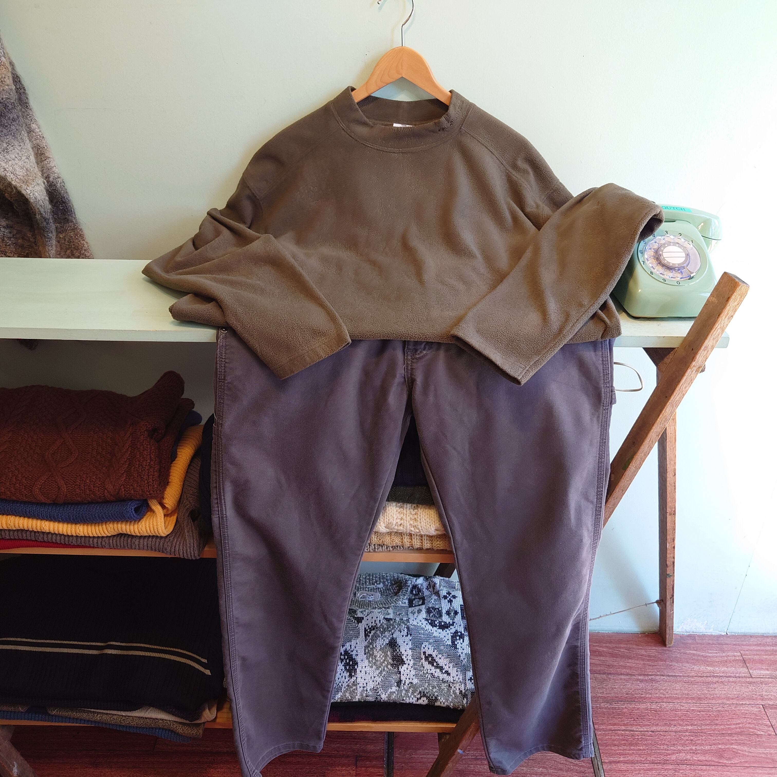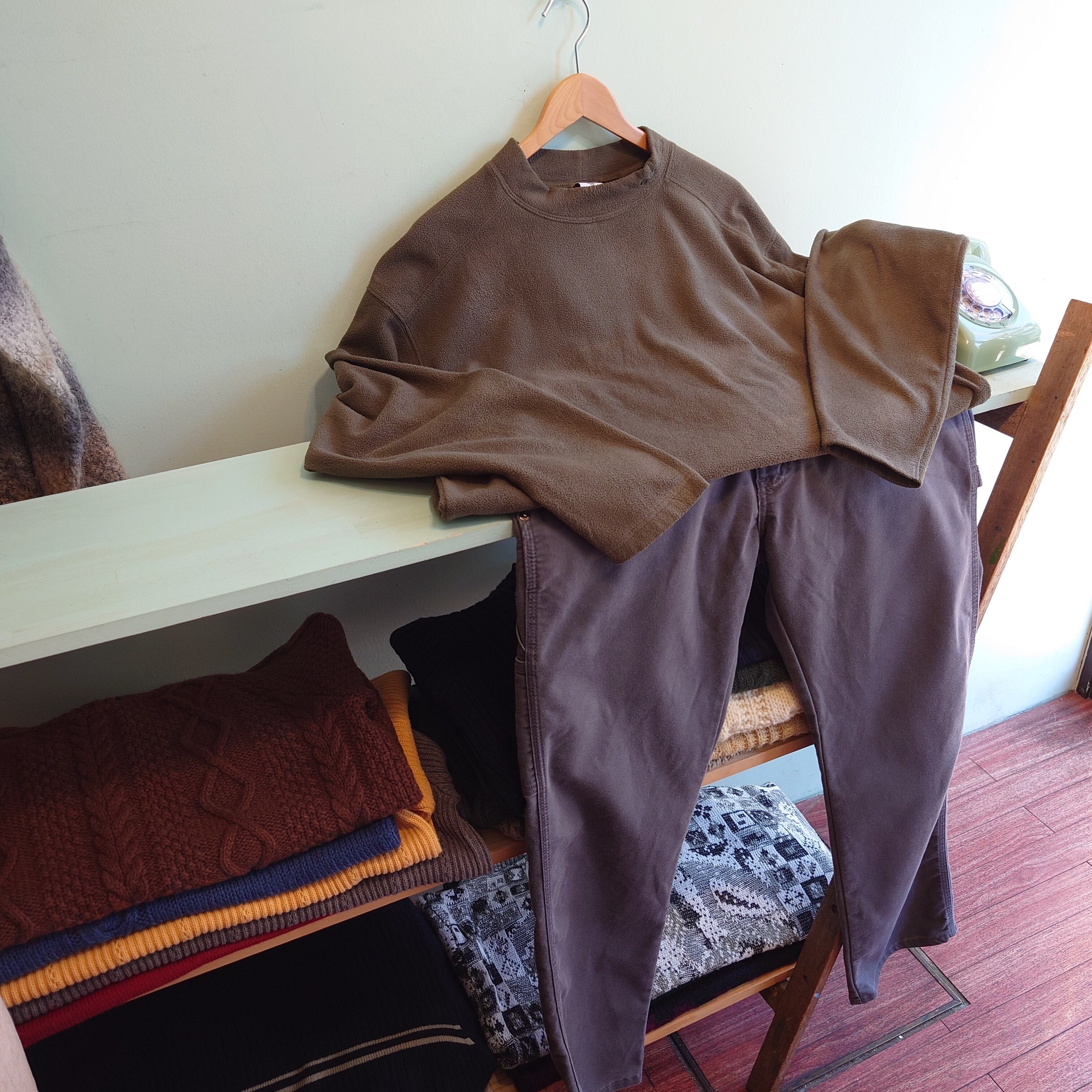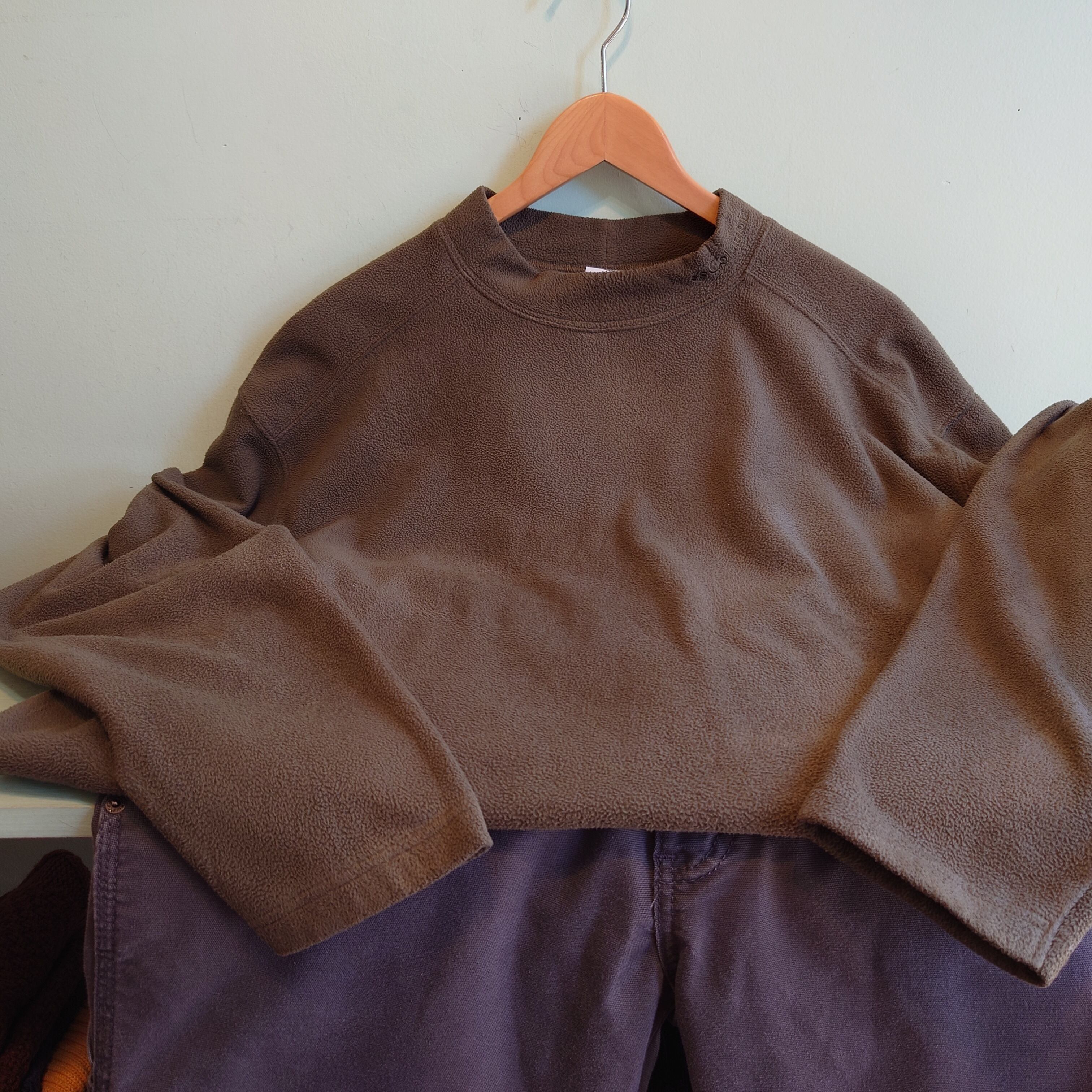 モスグリーン色がアーシーでミリタリーライクな、Columbiaのフリースプルオーバー。モックネックのロンTをフリース素材にしたような、インナーとしても重宝する1枚。スウェット感覚で1枚で、ライトアウターと組み合わせれば極暖コーデにも◎
