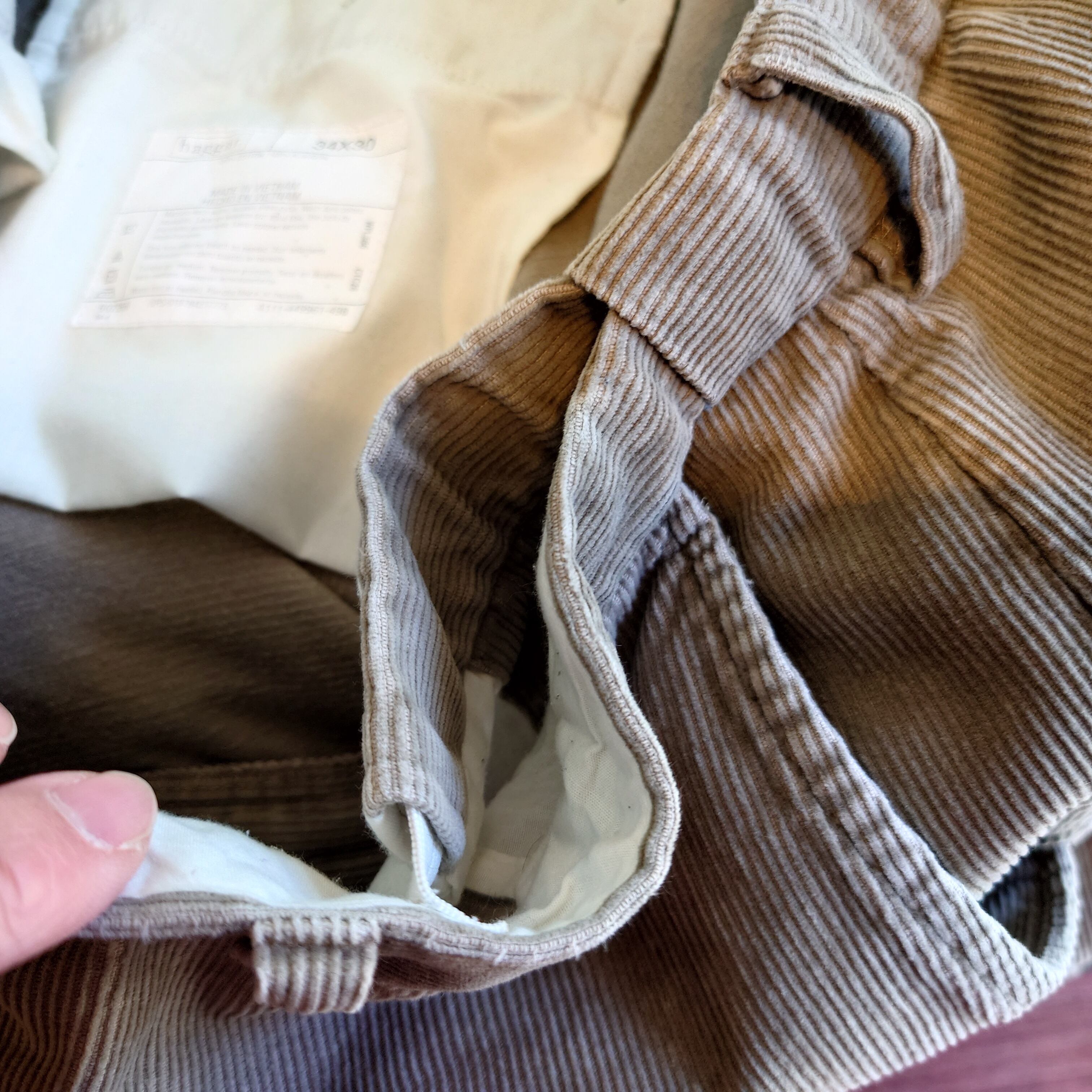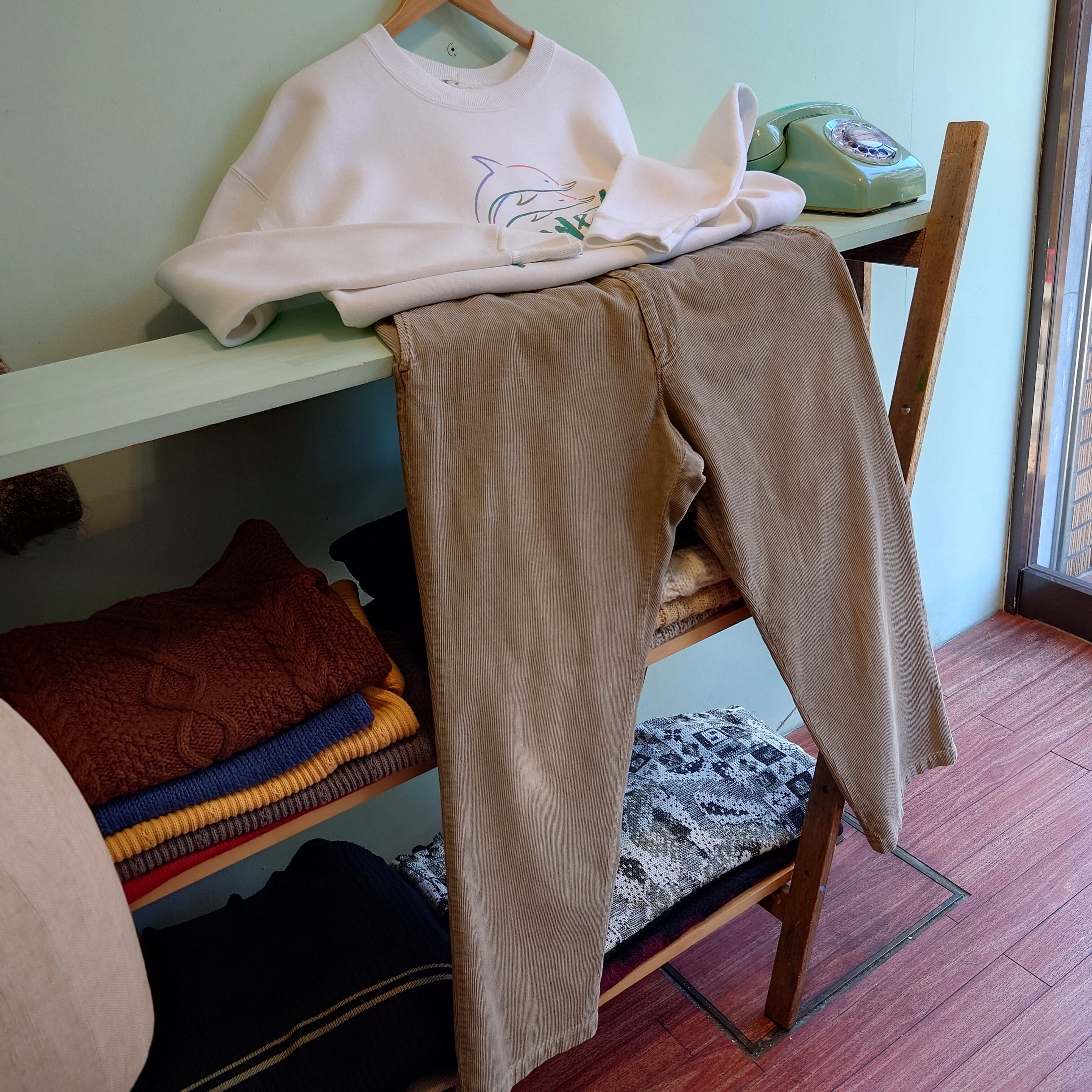 トラッド系の名門、Haggarのコーデュロイトラウザー。ノータックのすっきり感もありつつ、ストンとしたワイドシルエット。細畝から太畝の中間程度の生地感にベージュ、飾らない雰囲気ながら味のある一本です。