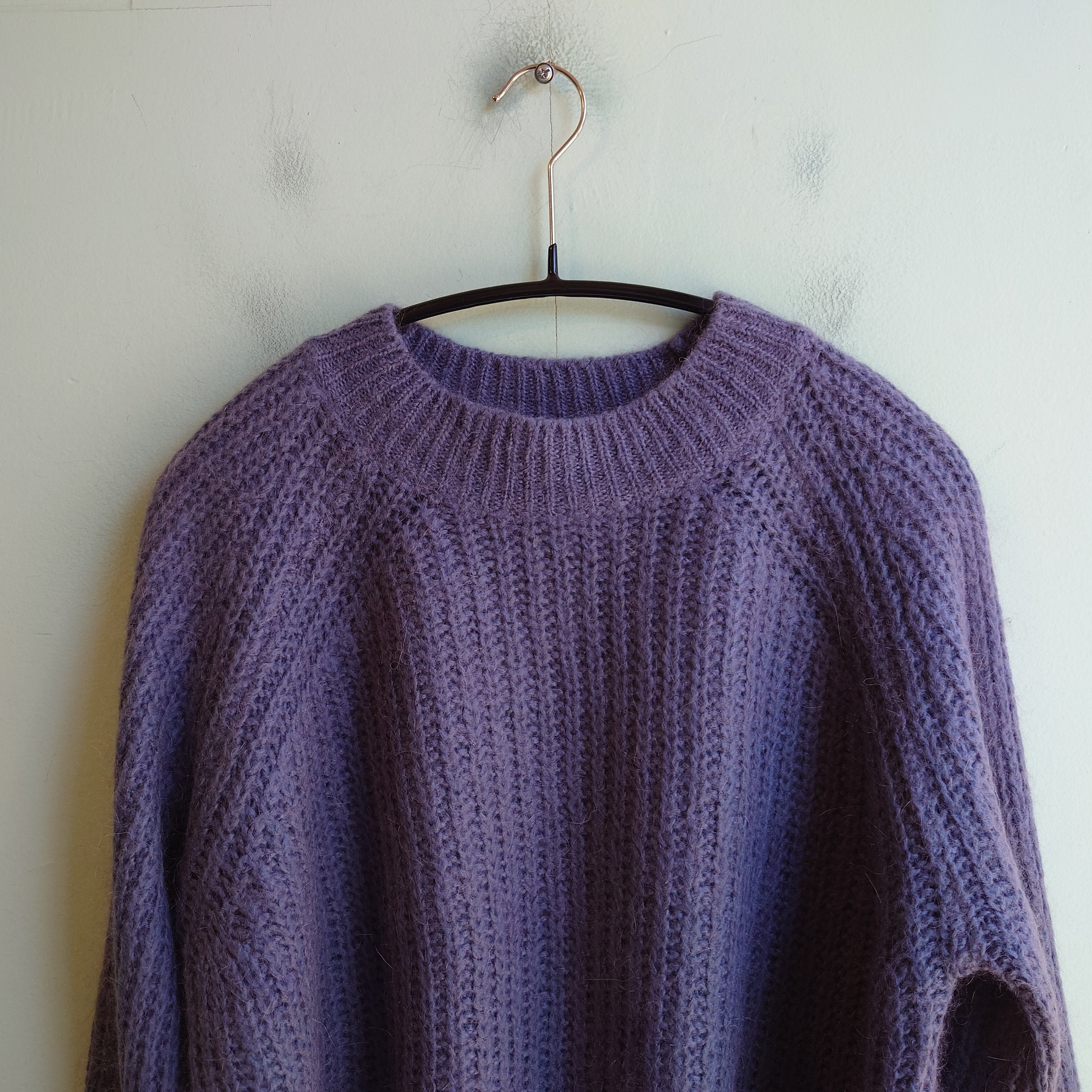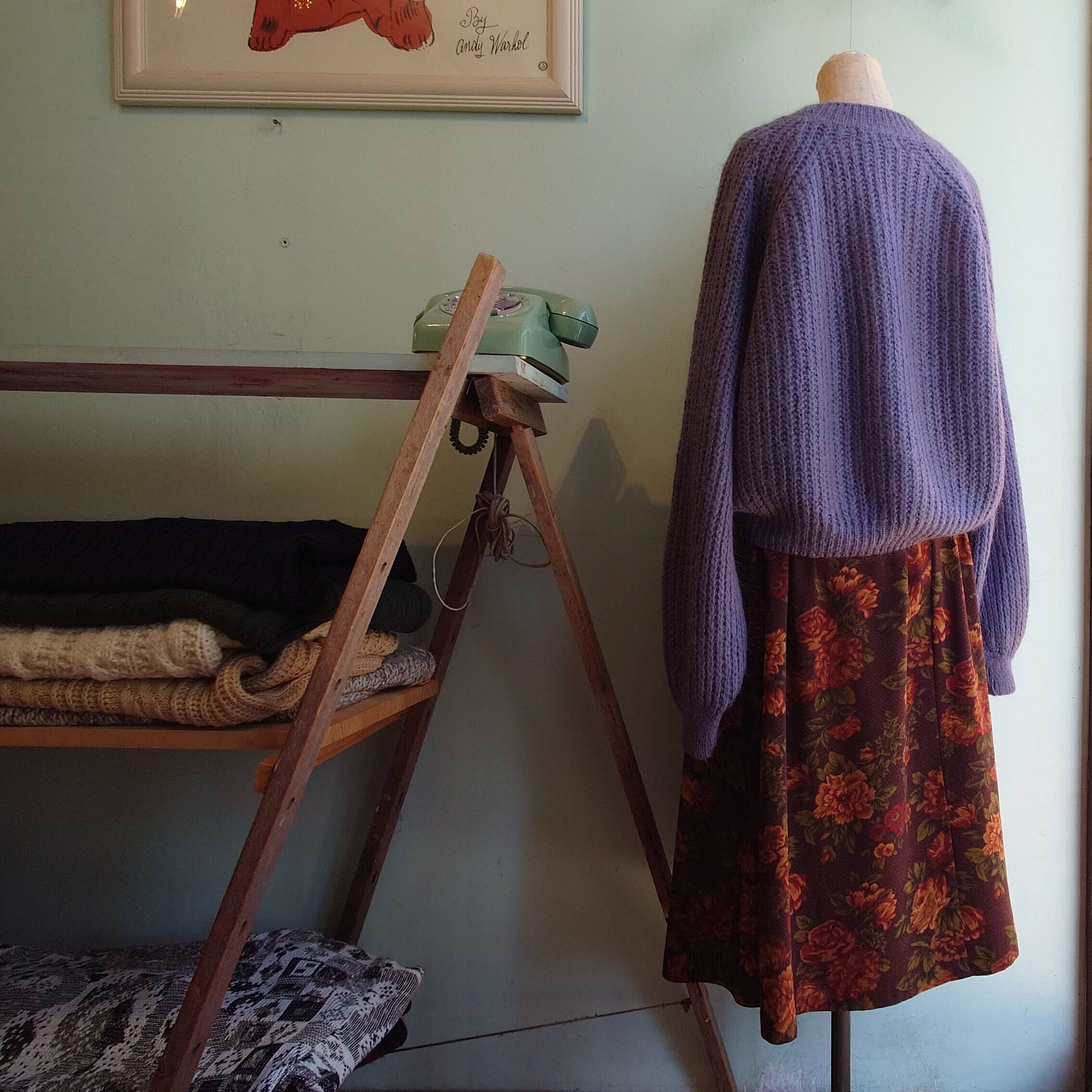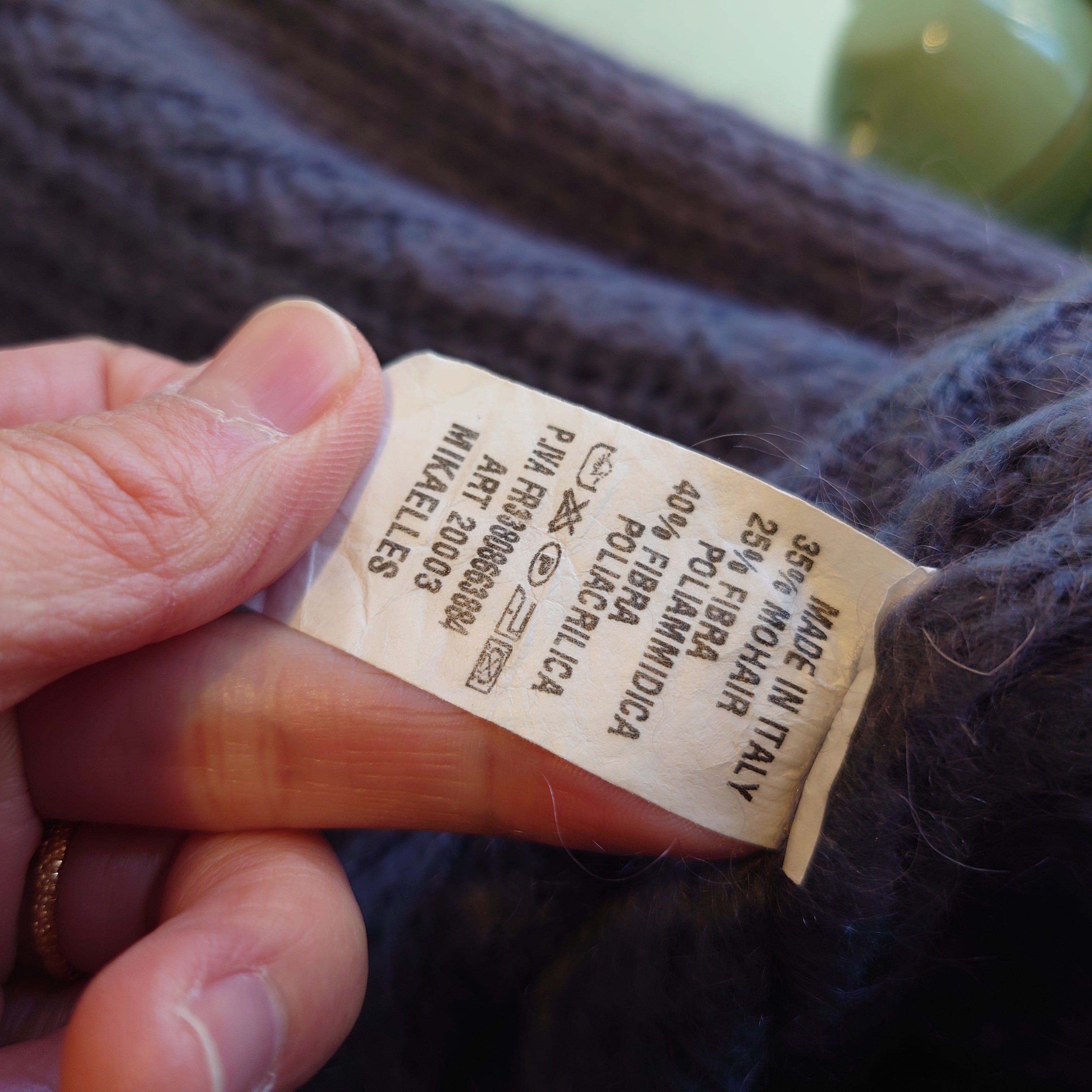 イタリア製ニットブランド、MIKA ELLES のデザインニット。質の良いモヘア素材と青みがかったグレーが可愛い。袖周りのバルーンなカーブと、ショート丈に見せる裾リブが絶妙なデザイン。普通そうに見えて着ればモードライクな素晴らしいセーターです。