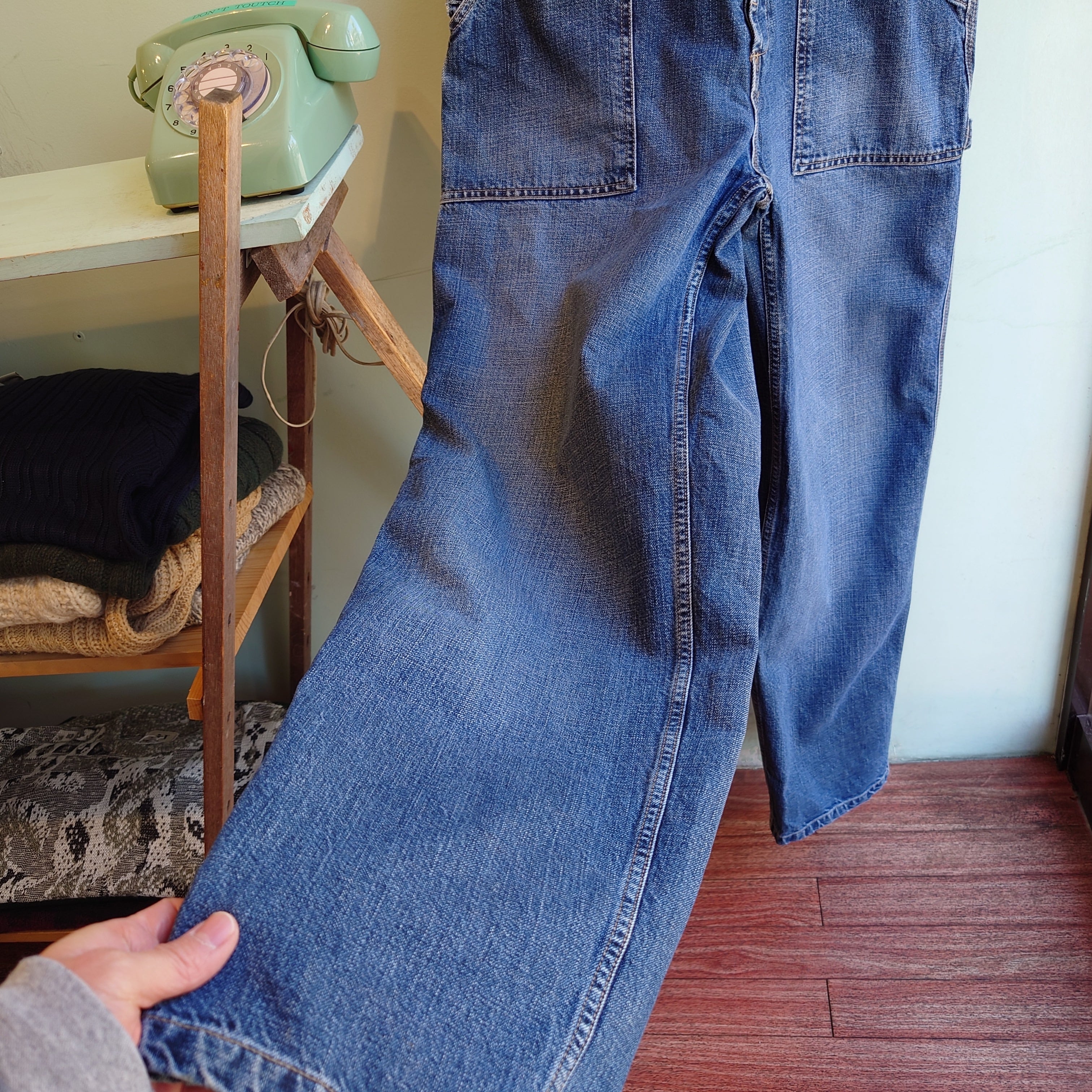 のデニムオーバーオール。ワークウェアをベースにモダンなテイストでまとめられた、Y2Kらしいデザインが◎。ワイド感ありつつ、ワークブランドのそれよりほんのりシャープ。濃淡をつけられたユーズド加工や、ブッュシュパンツのようなポケットも魅力。生地感のペラさは無く、しっかりとしたデニム生地も好印象。