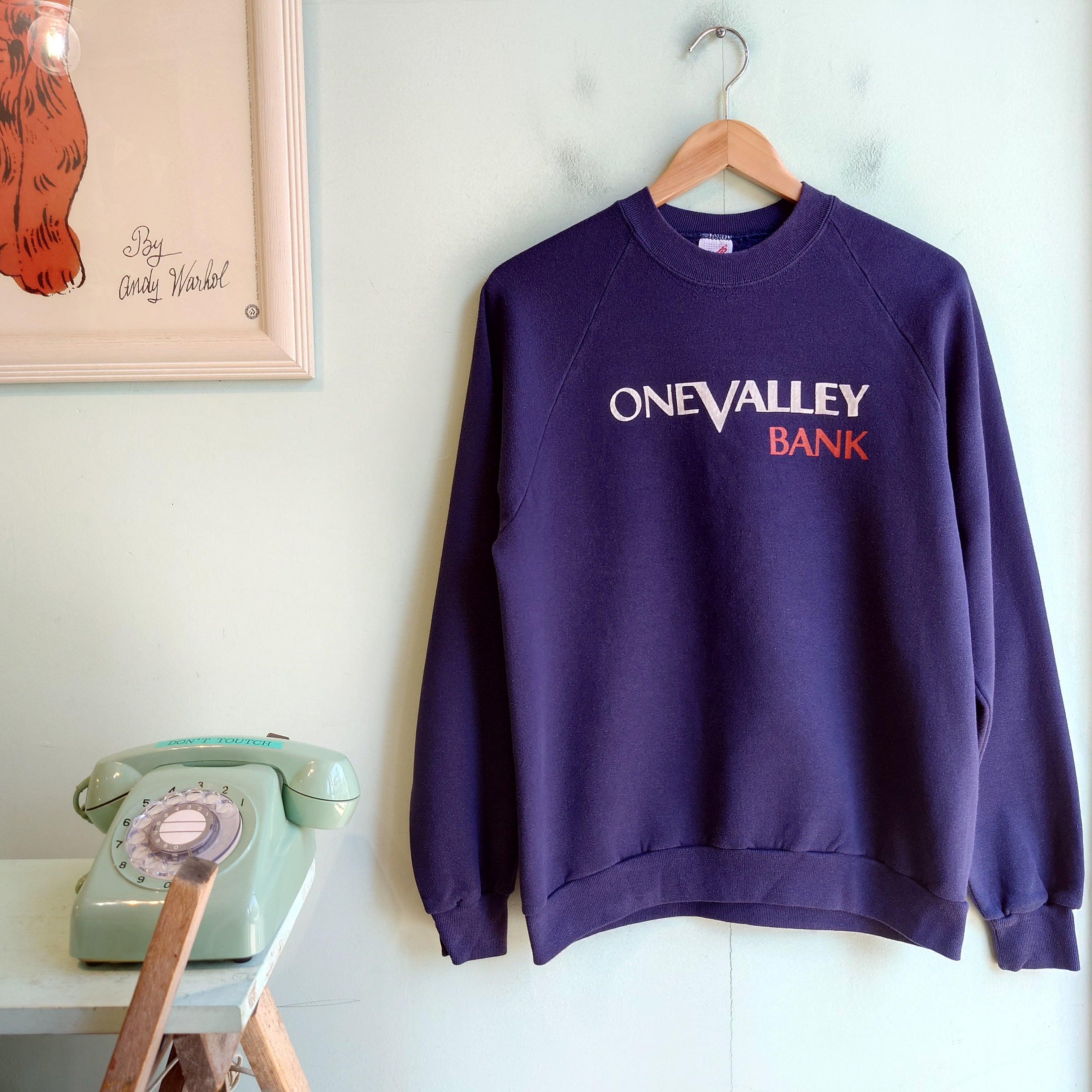ウェストバージニア州を中心に2000年まで実在した銀行のヴィンテージスウェット。シンプルなロゴながら、ラグランスリーブのレトロさと、巧みな色使いで雰囲気抜群。適当にボトムとあわせてしっかりカッコいい1枚。