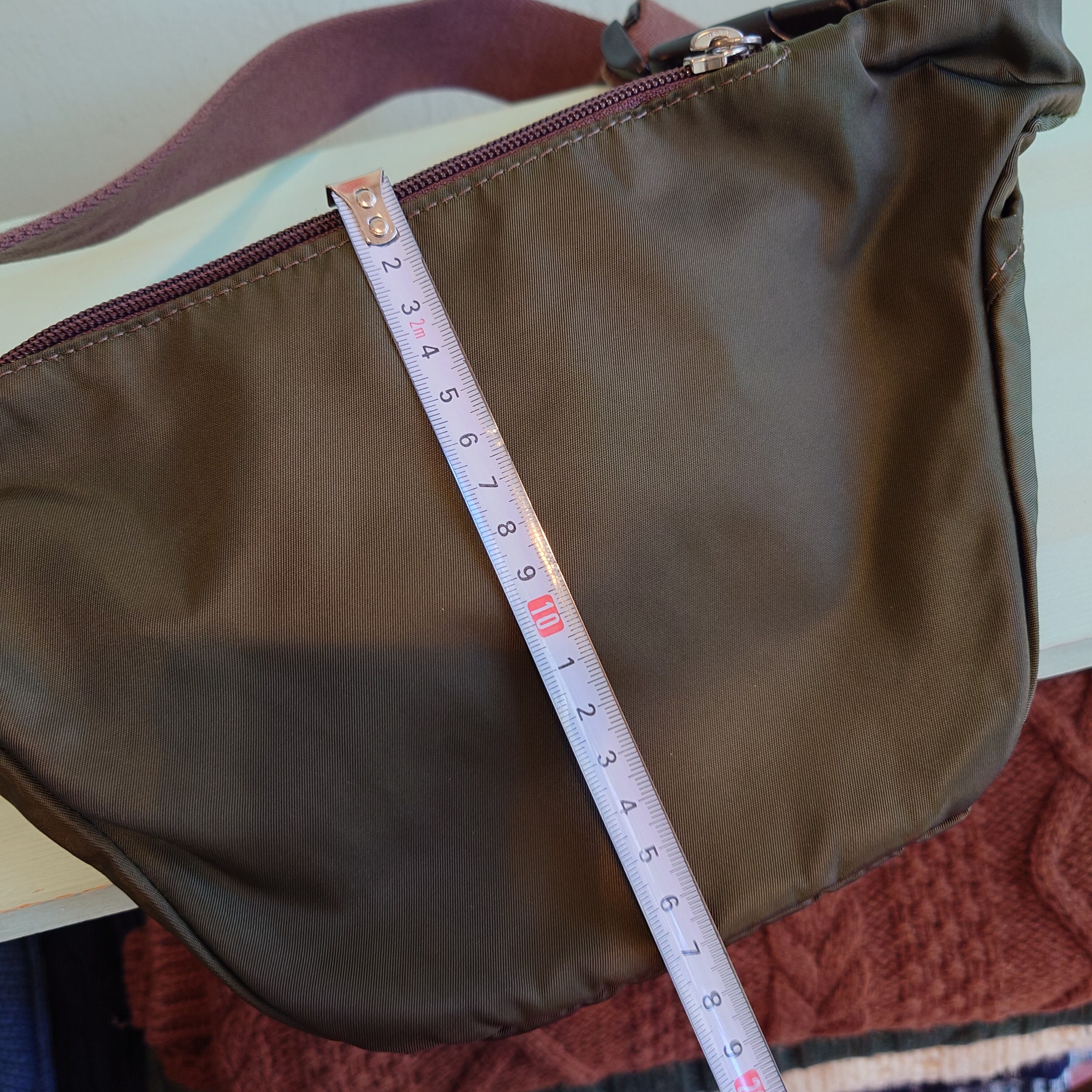 オロビアンコのウエストバッグ。近年のスタイリッシュにシェイプされた物と異なり、ボリューミーなオールドタイプの、ザ・ウエストポーチなデザインが可愛い。パイピングにはレザー、ブラウンとオリーブのコントラストとナチュラルでいい。