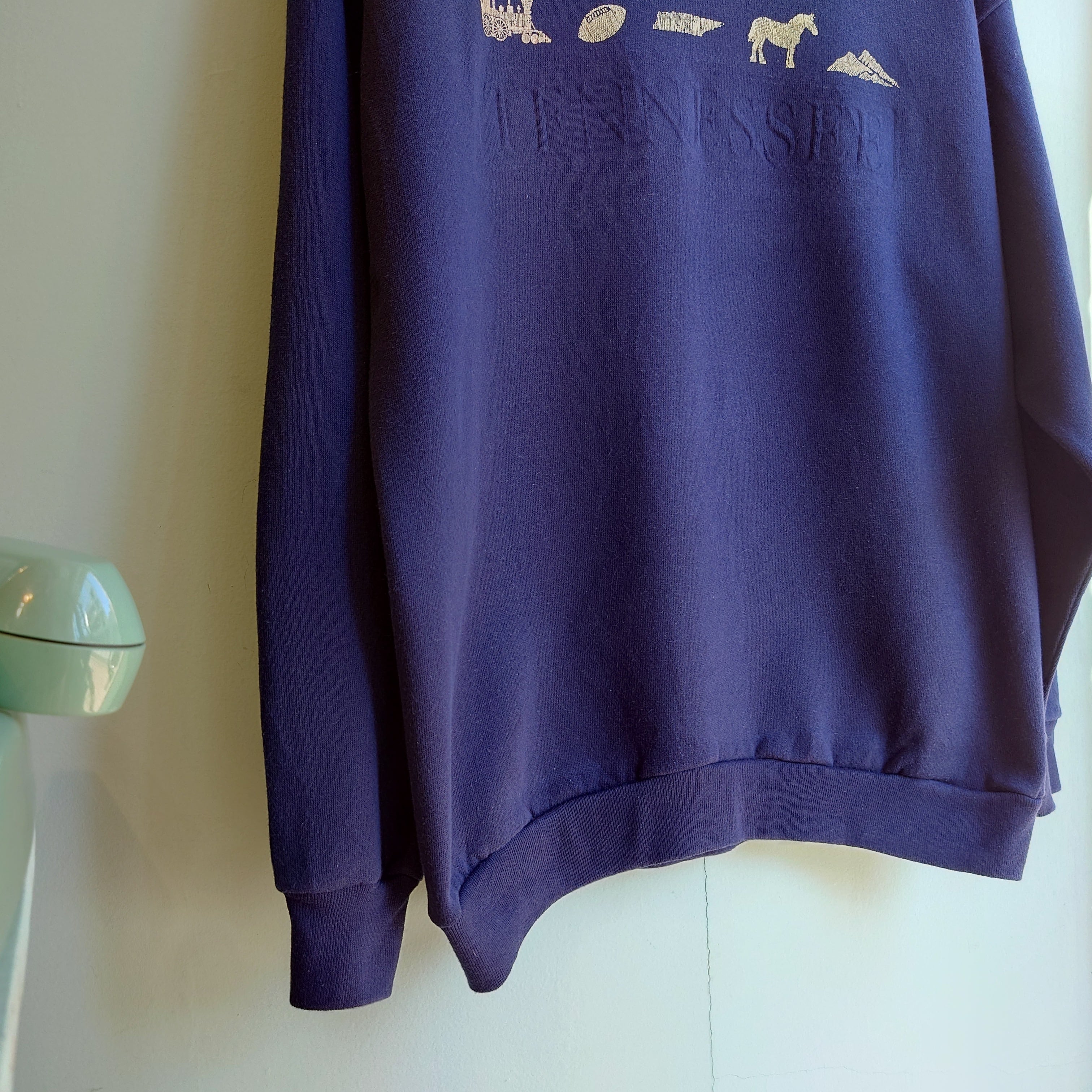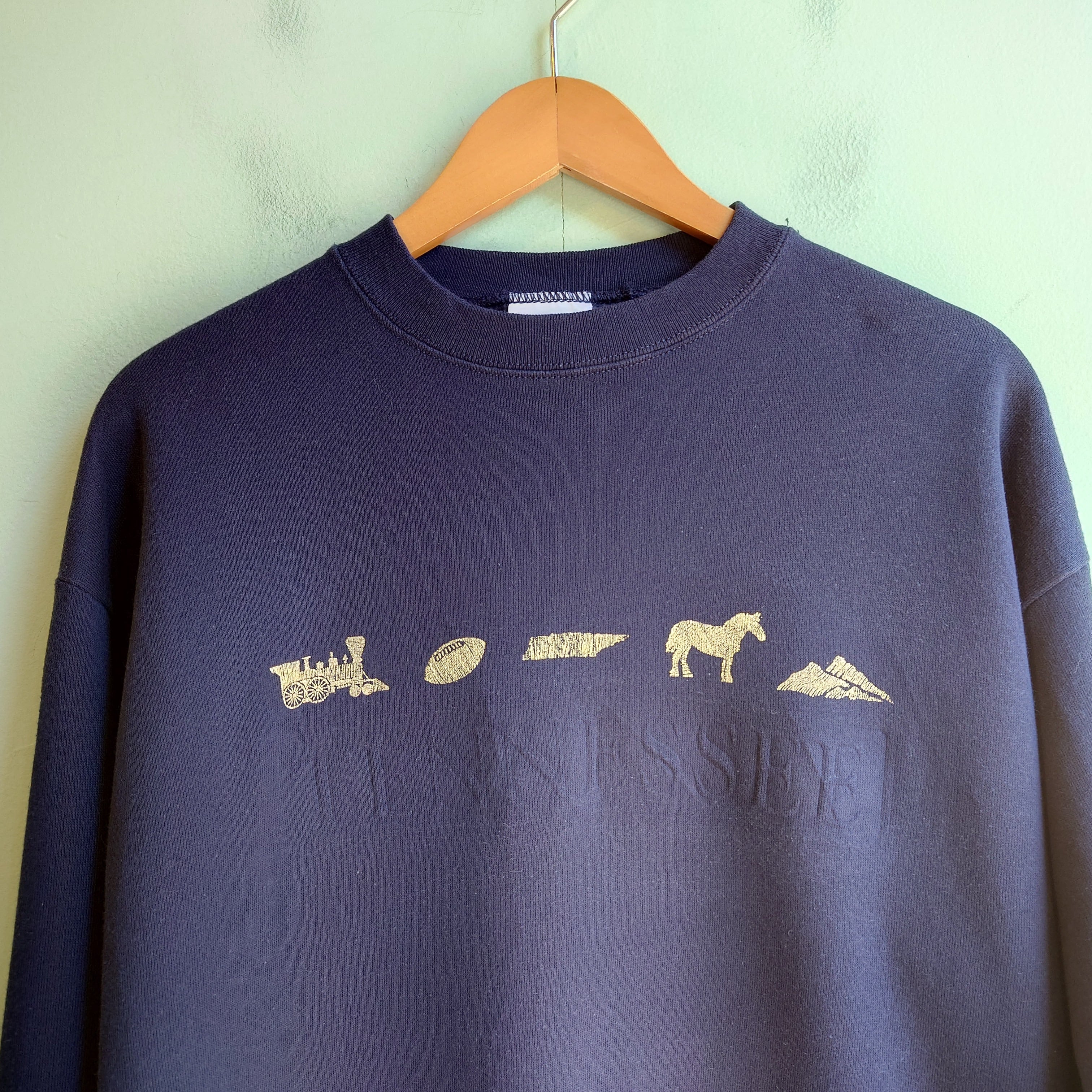 テネシー州のヴィンテージスーベニアスウェット。ラメの観光名所はコンパクトに、その下にワントーンでつけられたエンボスのロゴが珍しい1枚。見る角度によって表情が変わるのもいい。