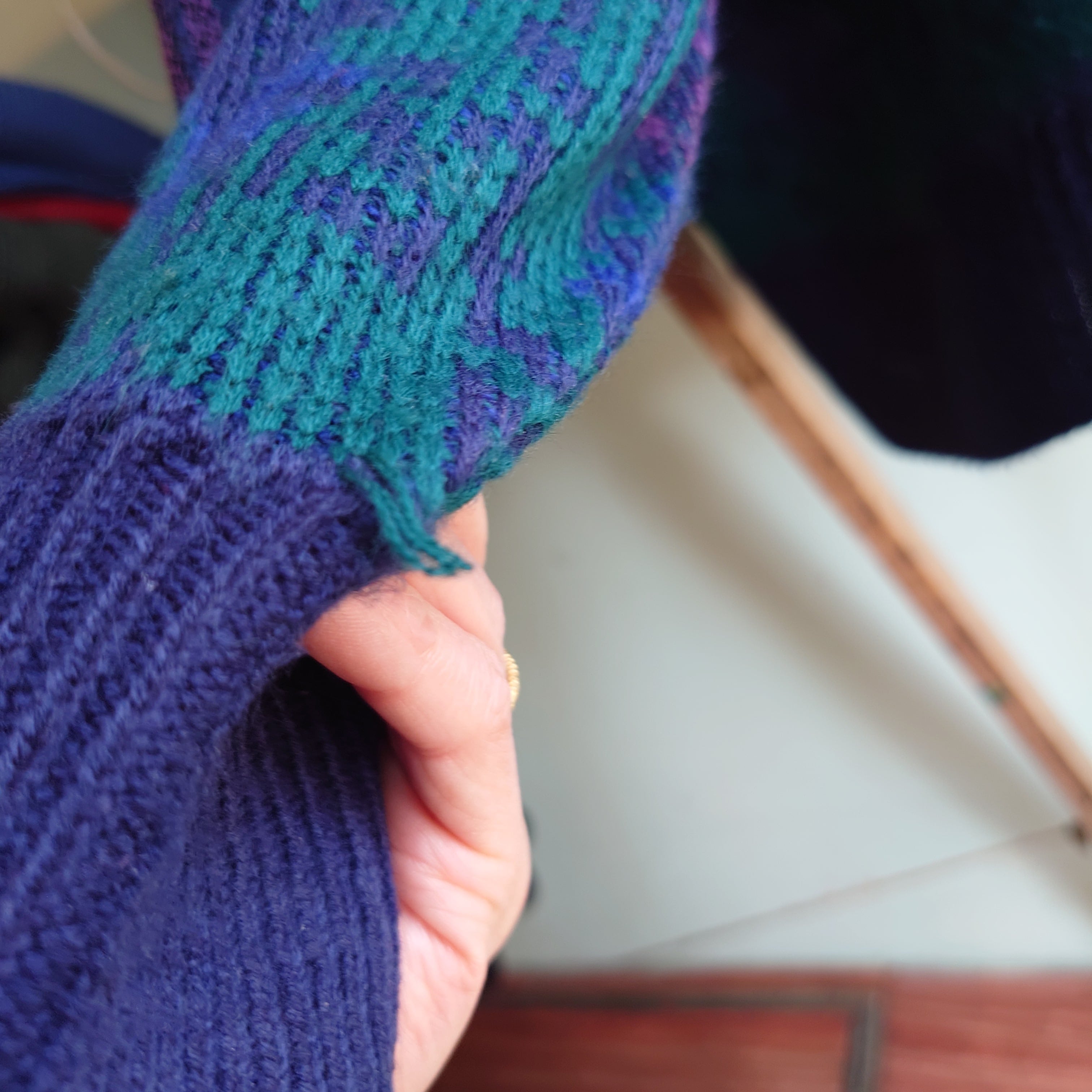 柄シャツのような総柄と絶妙な色加減に、レザーの切り替えを加えた変わり種カーディガン。レザーが入ることで、アクセントにもなるしより幾何学模様がクローズアップされるいい雰囲気。アクリルの軽さ、ゆるっとしたシルエットで、まさに柄シャツのようなカーディガン。
