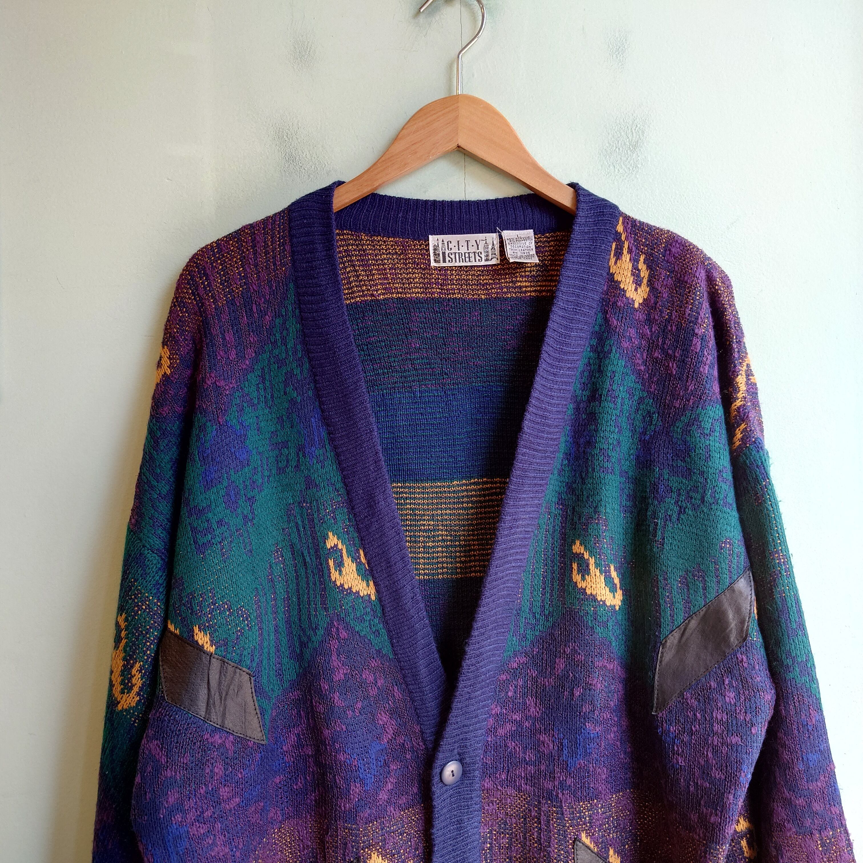 CITY STREETS 90s vintage ヴィンテージカーディガン レザー切り替えカーディガン 総柄カーディガン