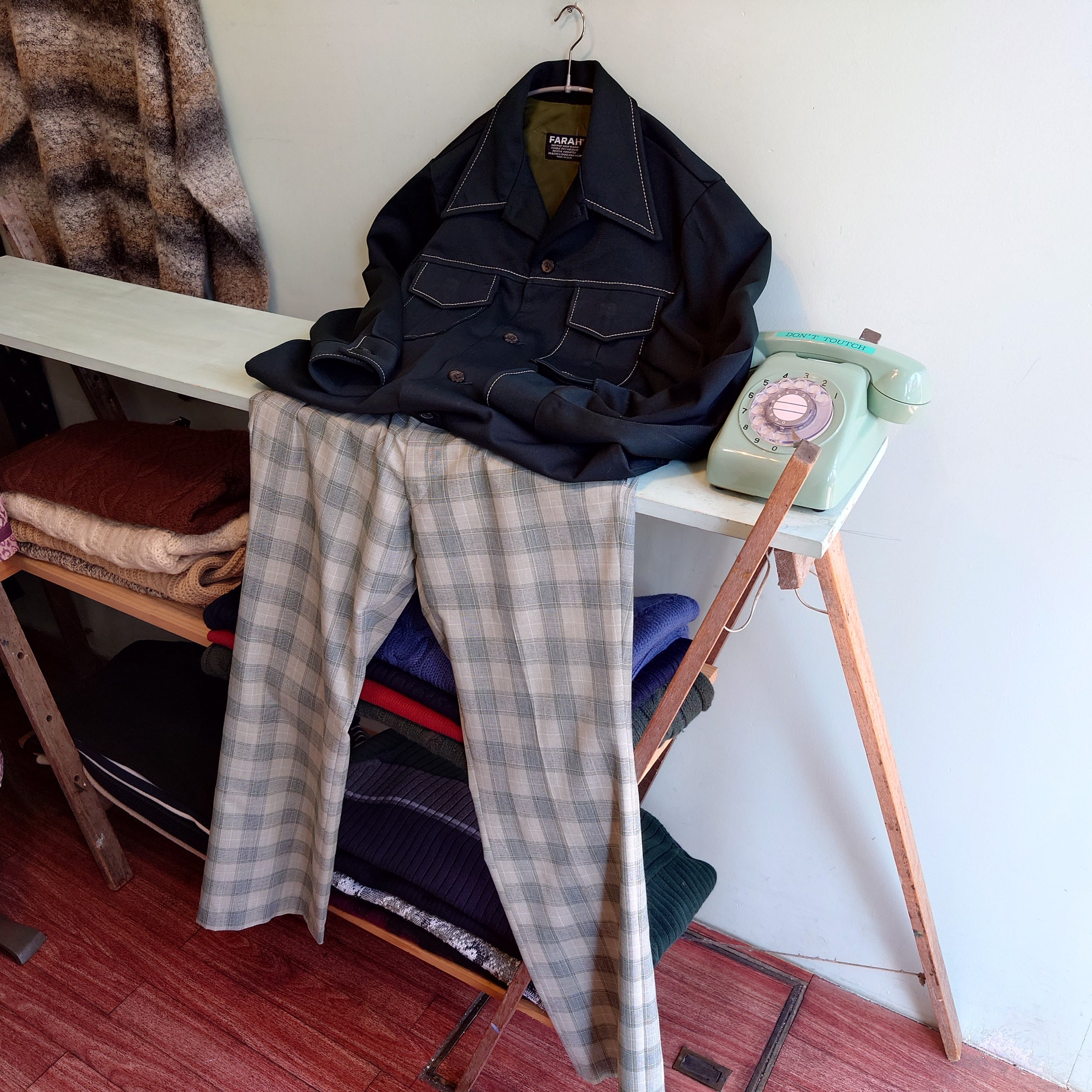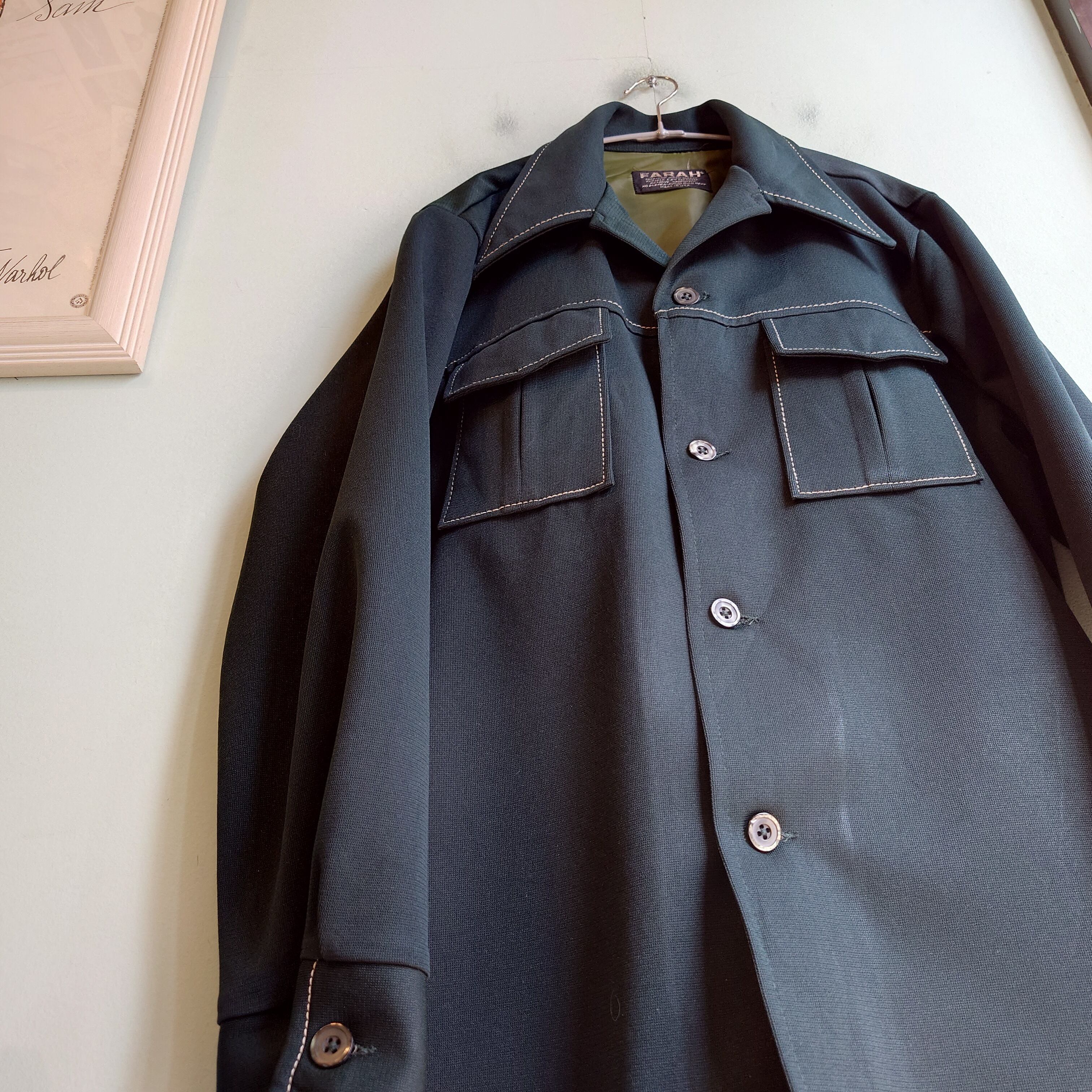 1920年発祥の名門、ファーラーのスタプレシャツ。鈍い輝きを放つダークグリーンのポリ素材は、ひと目でわかるレトロさ。ウェスタンシャツやランチ系アイテムを思わせるデザインは、ほんのり60年代を彷彿させる独特なカーブ。シャツとしてはやや厚手な素材感なので、軽い羽織としてもおすすめです。