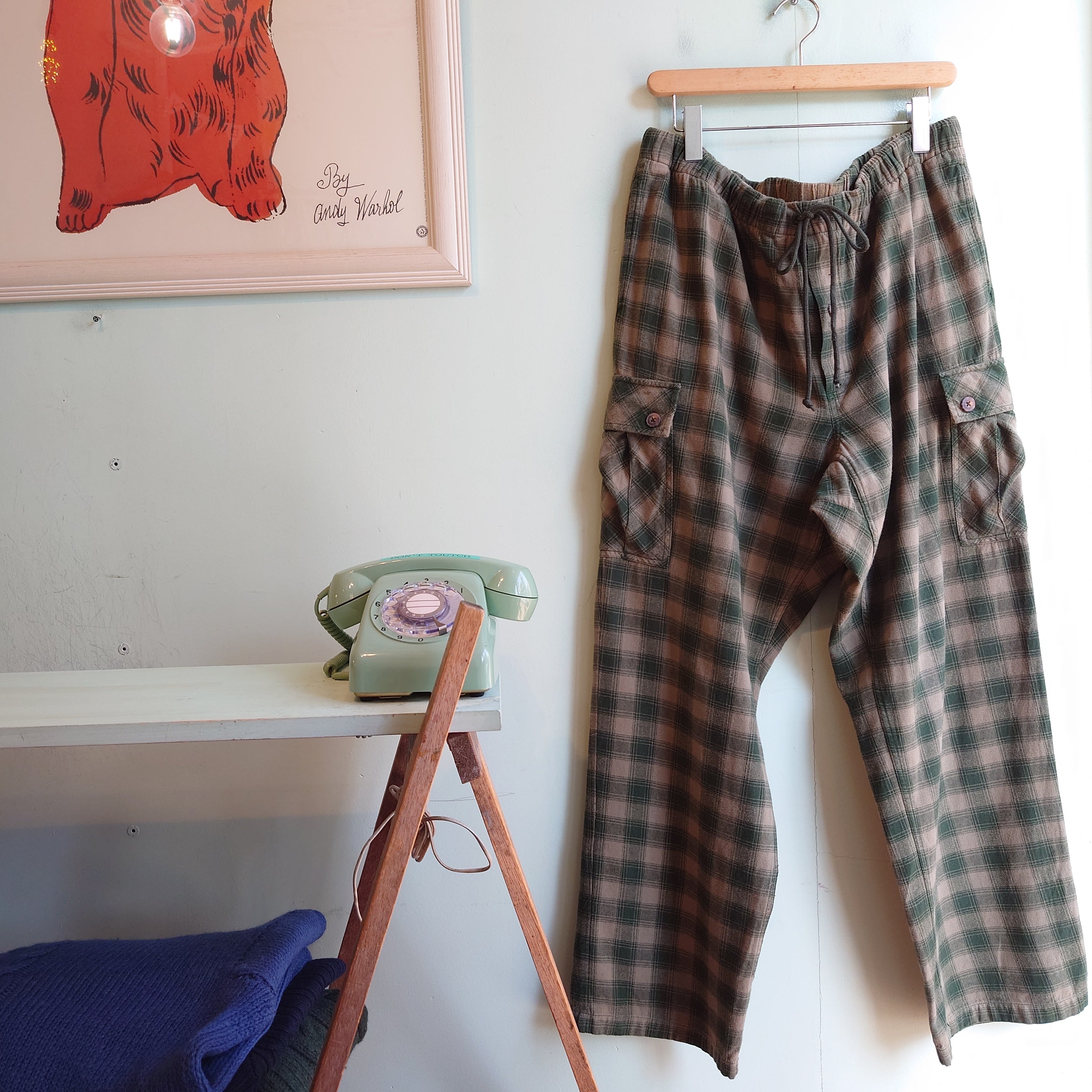 グレージュ×グリーンのなかなかないグッドカラーに、カーゴポケットが付いた変わり種パジャマパンツ。フランネル系ながらややしっかり目の生地感と、縫製しっかりでほんのりワーク感も。パジャマパンツの中でもよりワイド感あるシルエットも良し。