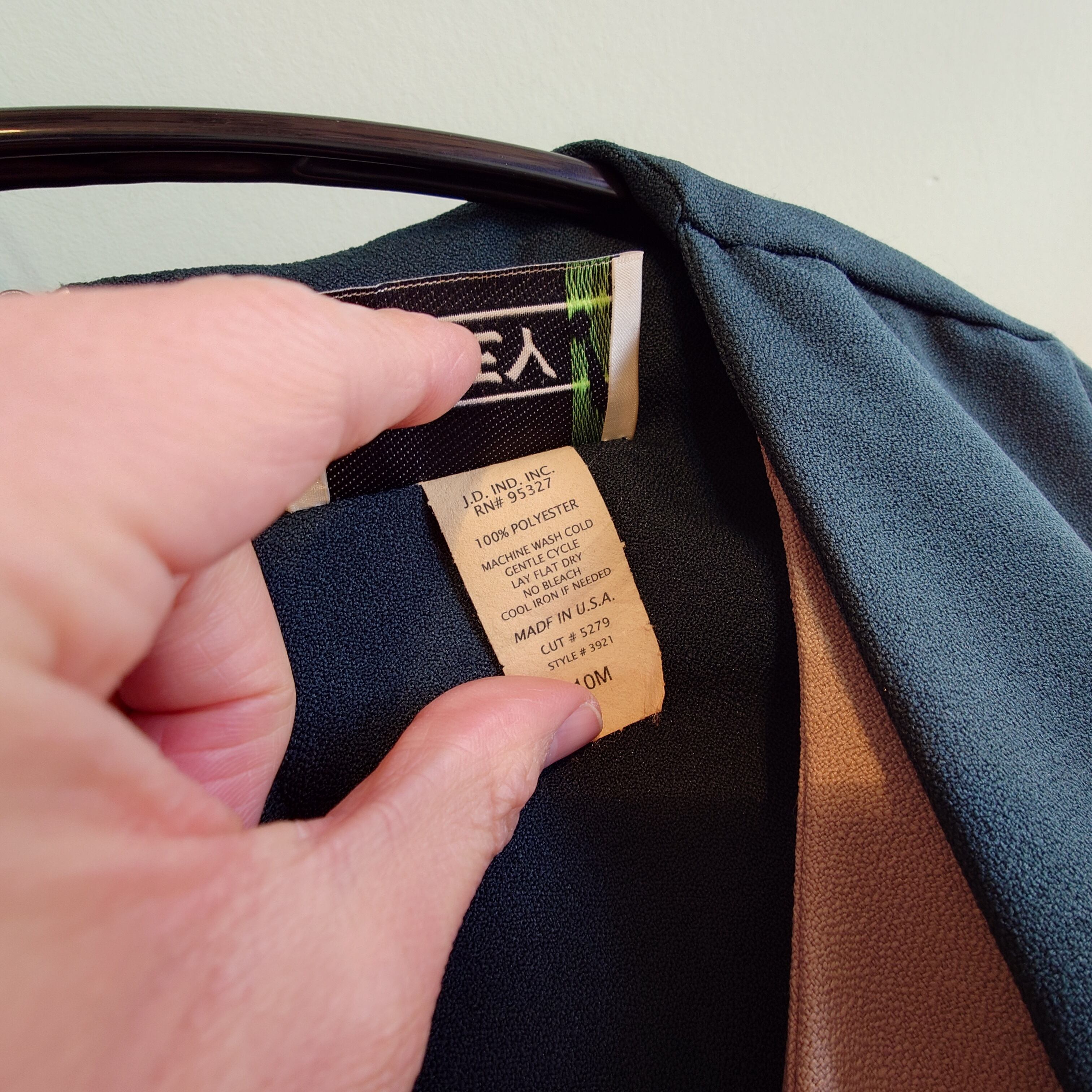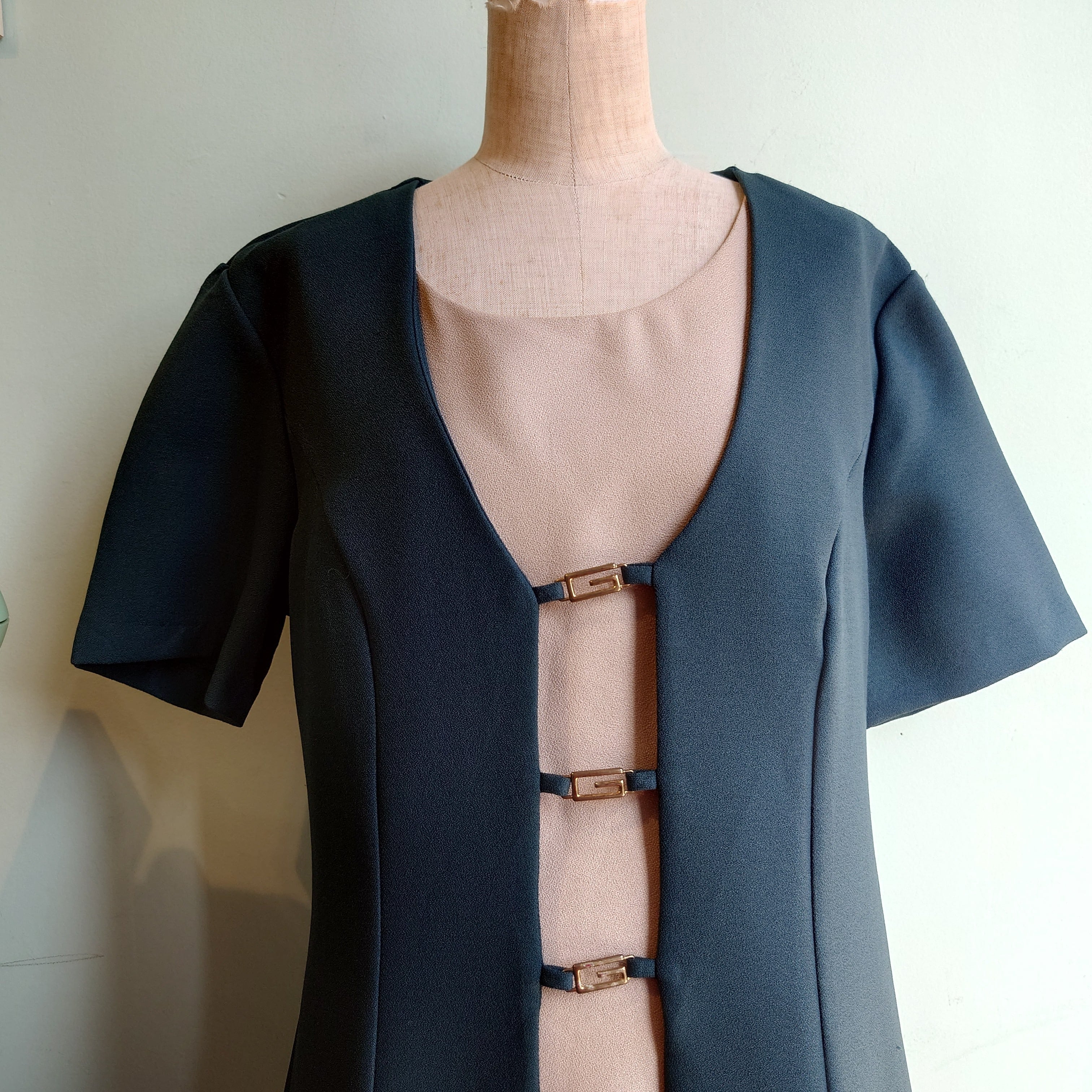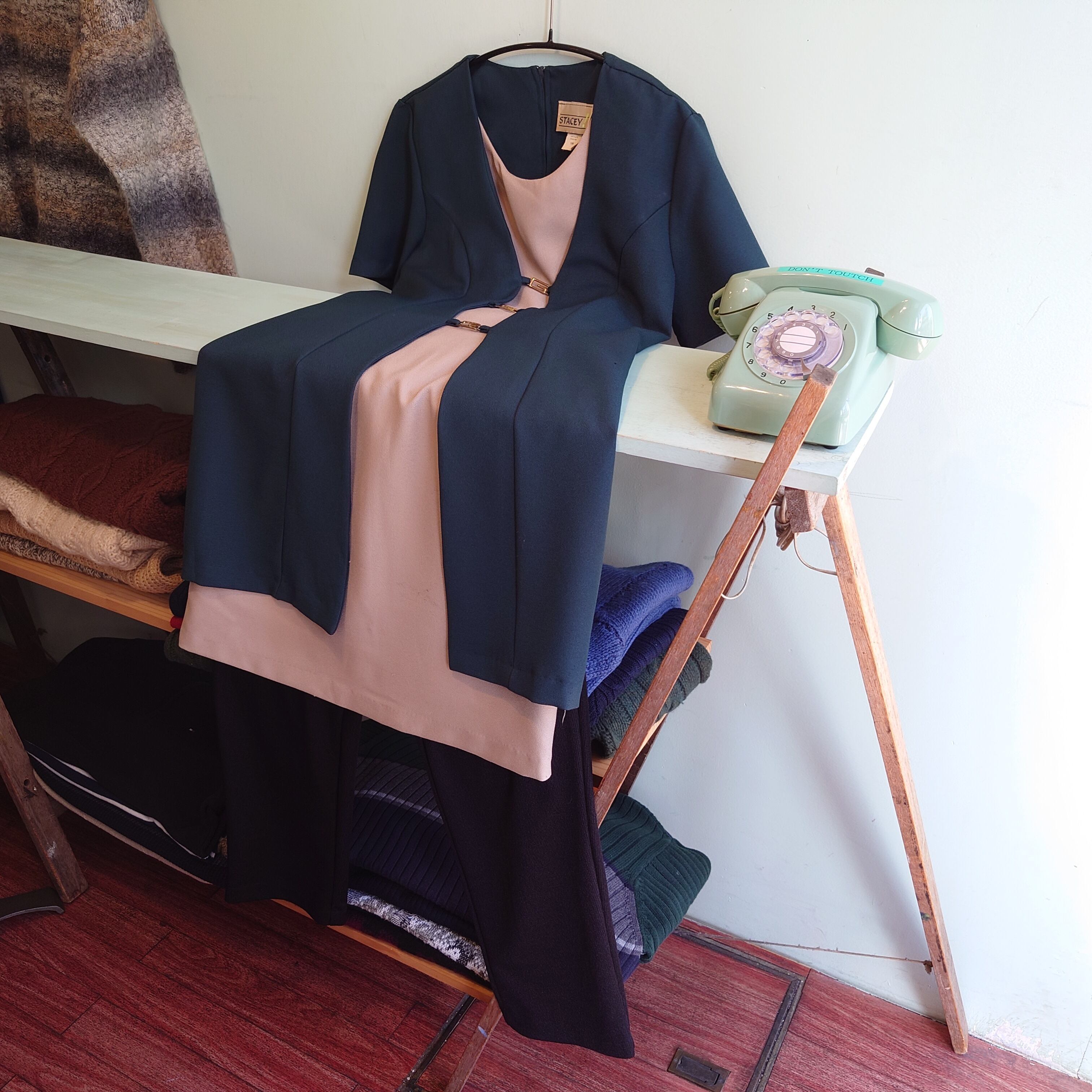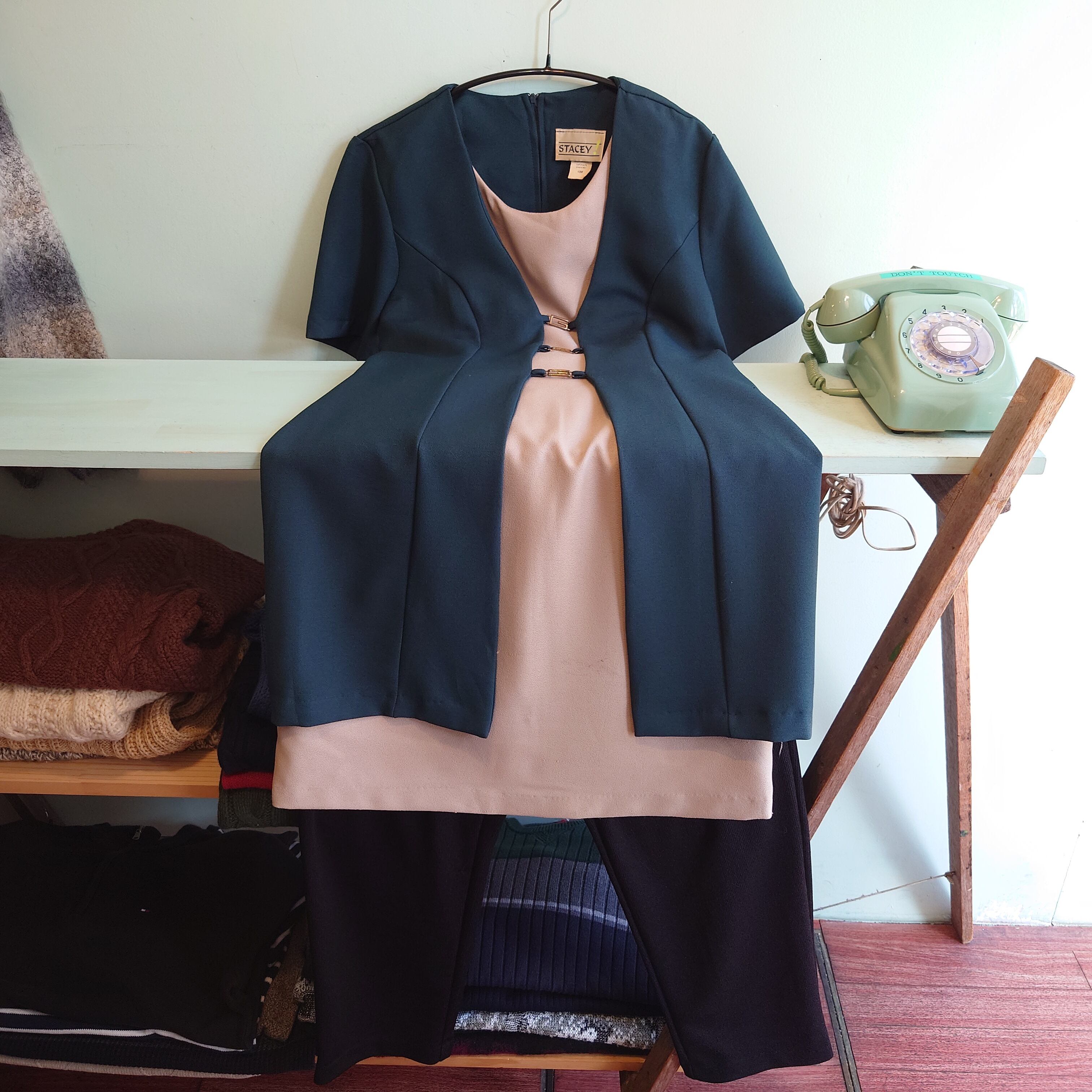 80s vintageのアンサンブル系プルオーバーワンピース。カットソーにジャケットを重ねたようなだまし絵的なアイテム。特にモノトーンが多いタイプですが、こちらはダークグリーン×ベージュが珍しい。1枚でももちろん◎、ボトムを合わせたスタイルが抜群にかわいい。