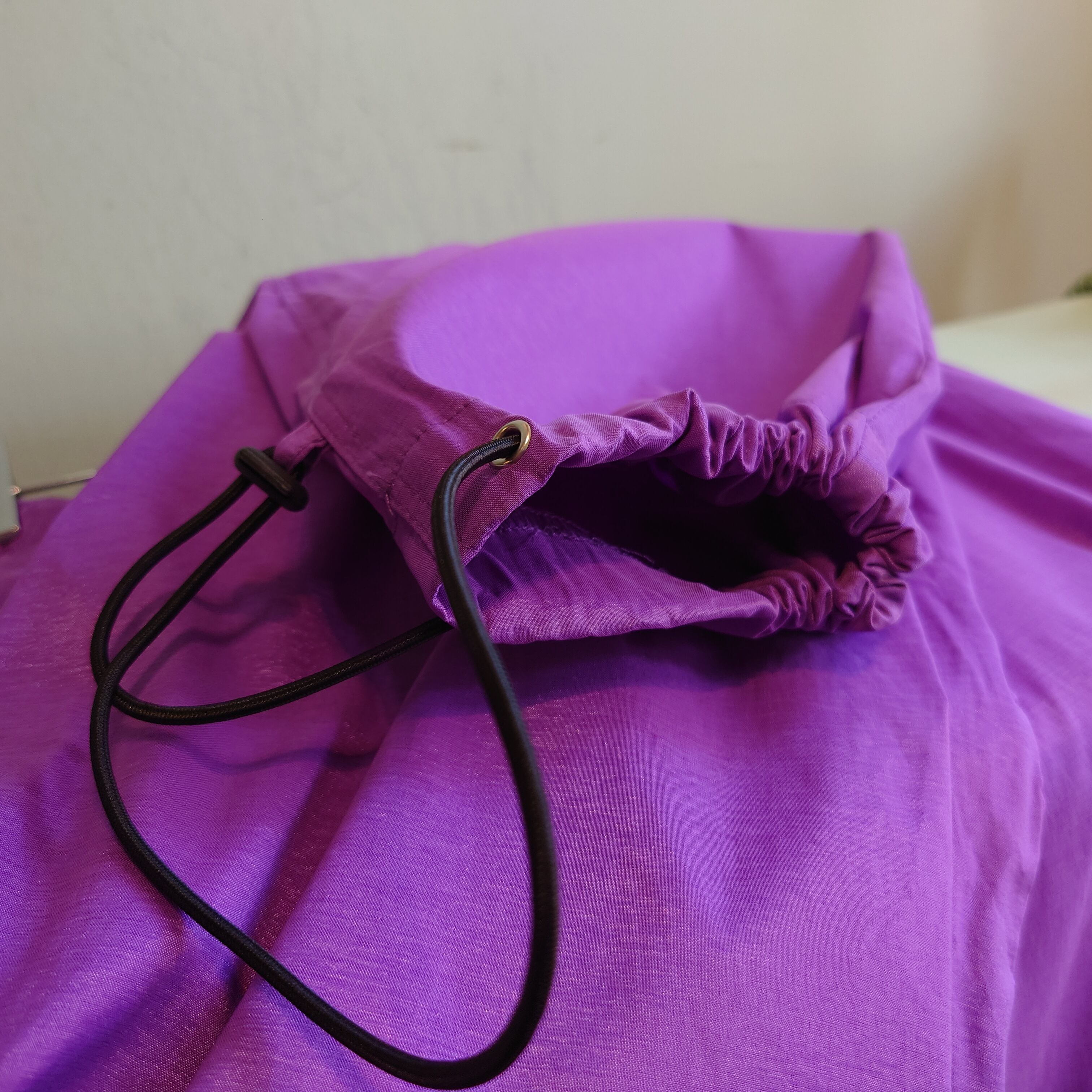 メタリック感のあるパープルと、ハイブリッドなデザインに惹かれるカラーイージーパンツ。ほんのりフレア感のあるストンとしたワイドシルエットは、裾のドローコードでバルーン風にも。ポリ/ナイロン系素材は独特な光沢感で、ワイド系では珍しいほんのりストレッチで履き心地も最高。