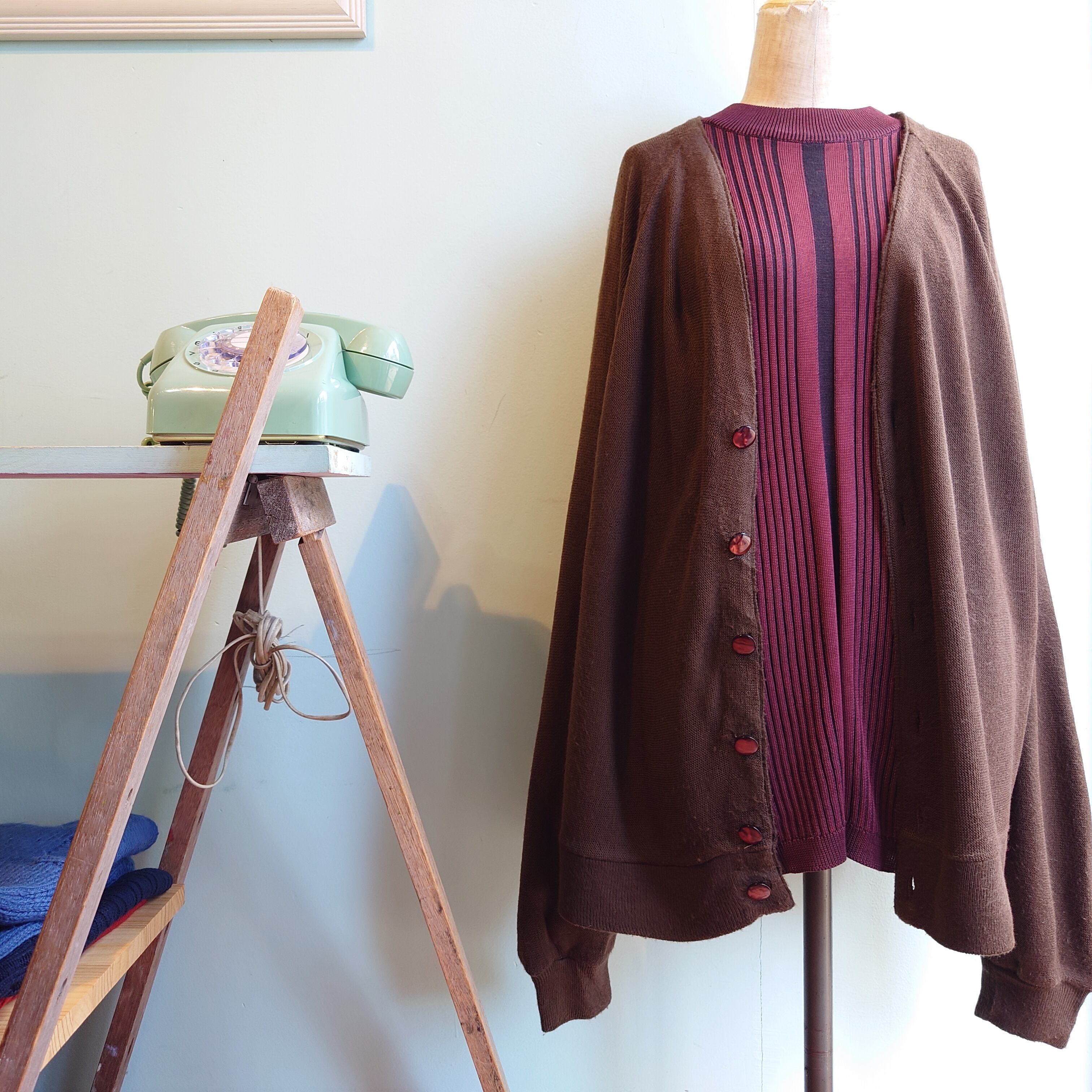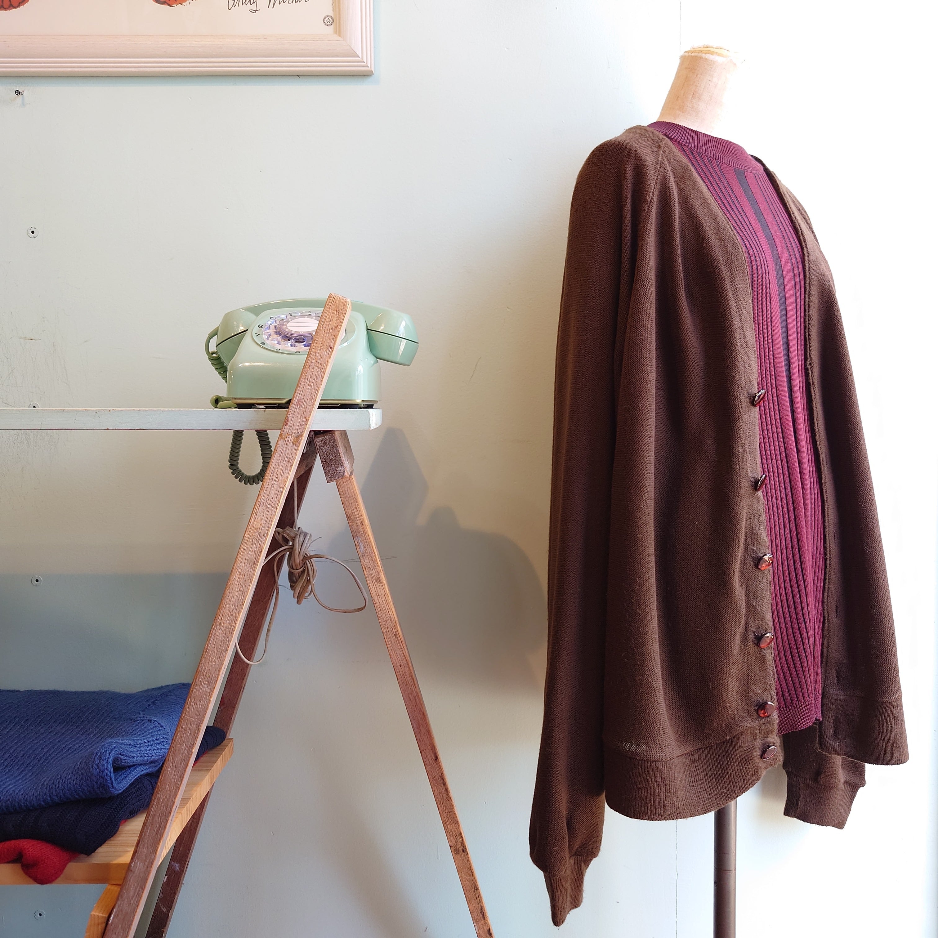 60-70s ヴィンテージのアクリルカーディガン。アクリルらしい軽い着心地とシャツのようにふわっとしたシルエット、袖は珍しくリブが短いタイプ。ナチュラルにもドレッシーにも使える濃いめなブラウンは、1枚あるとデイリーにもちゃんとしたシーンにも活躍間違いなし。