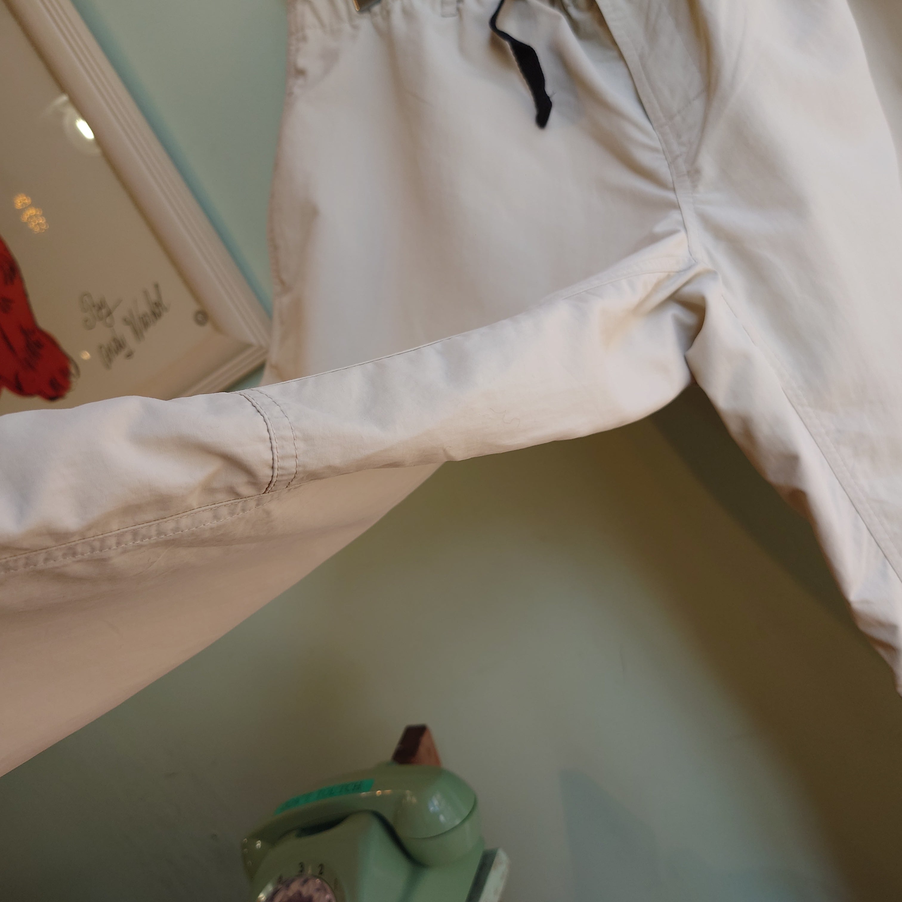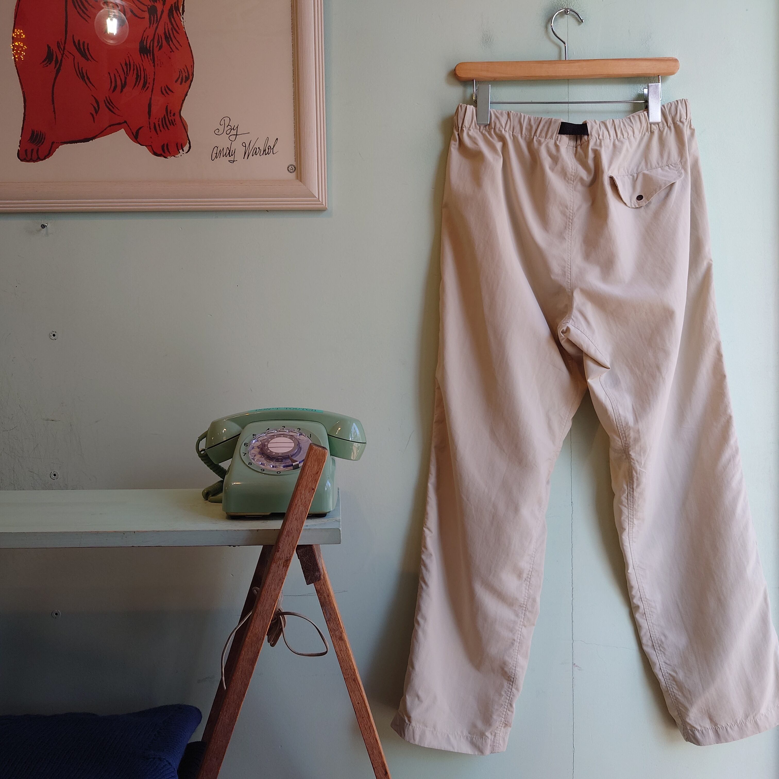 アウトドアやフィッシング系アイテムの名門、トラベルスミスのナイロンイージーパンツ。クライミングパンツを思わせる内股の切り替えや、黒ベルトのバックルもかっこいい。ナチュラルなテイストも持ったナイロンとひらひら感で、リネン系のイージーパンツを思わせるリゾート感も◎。