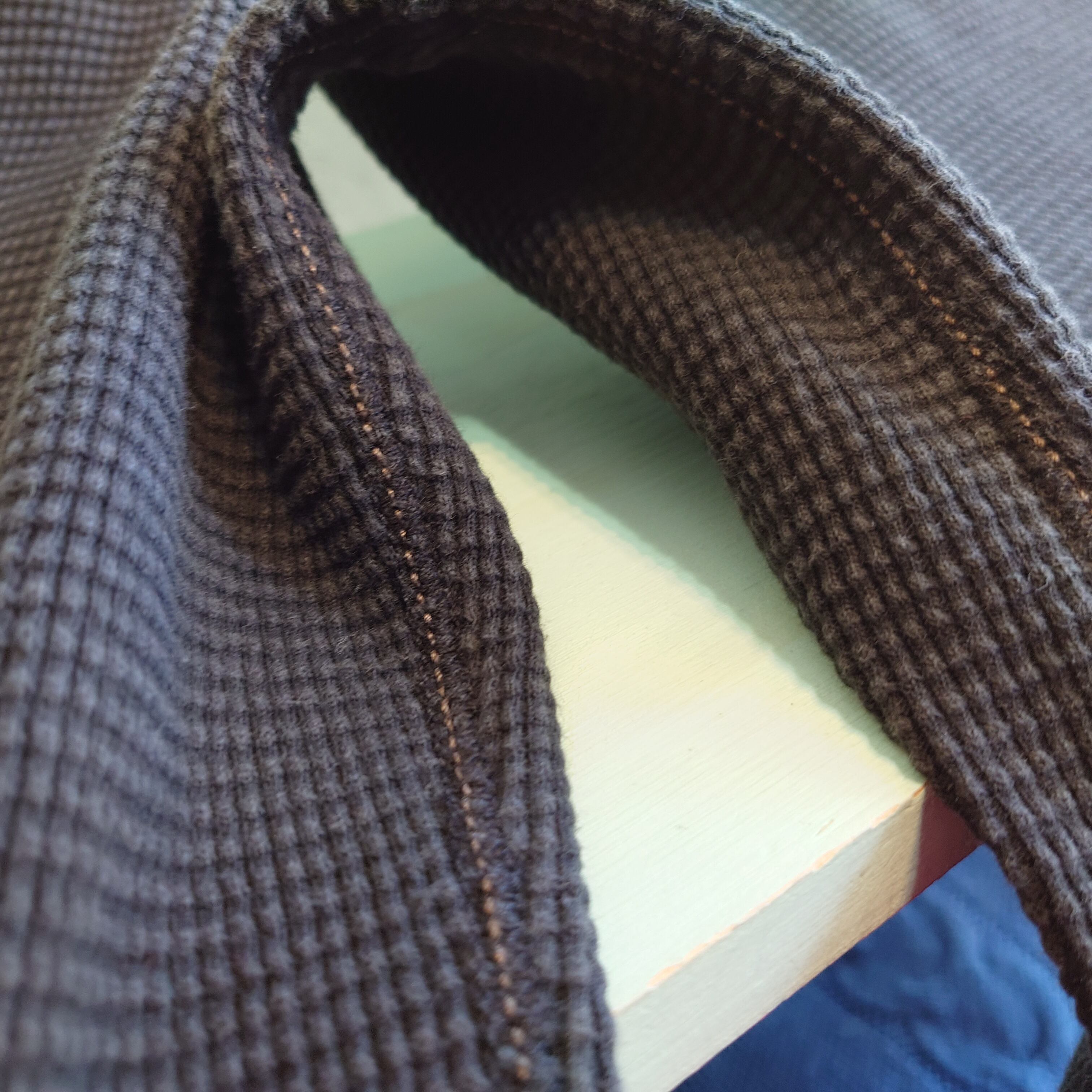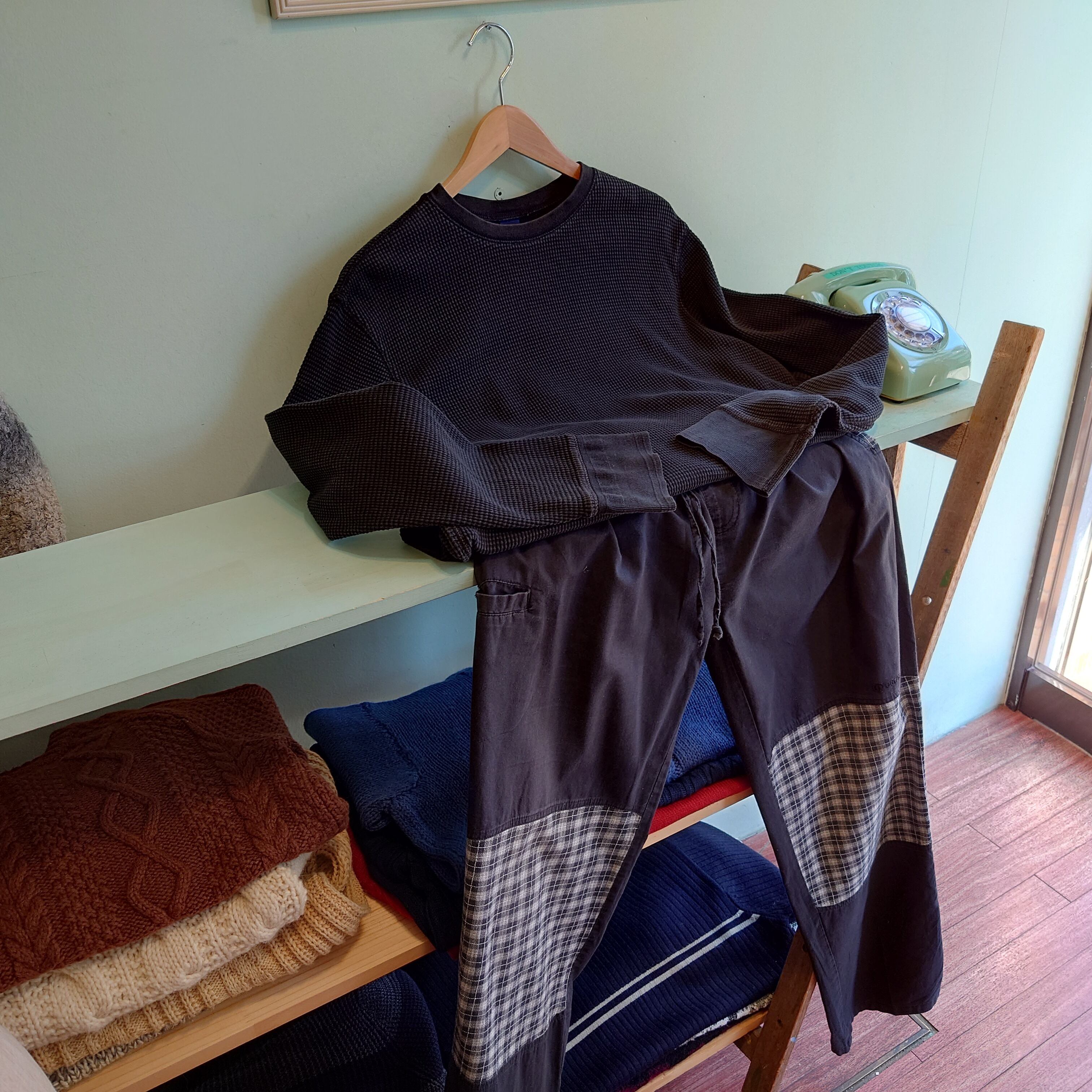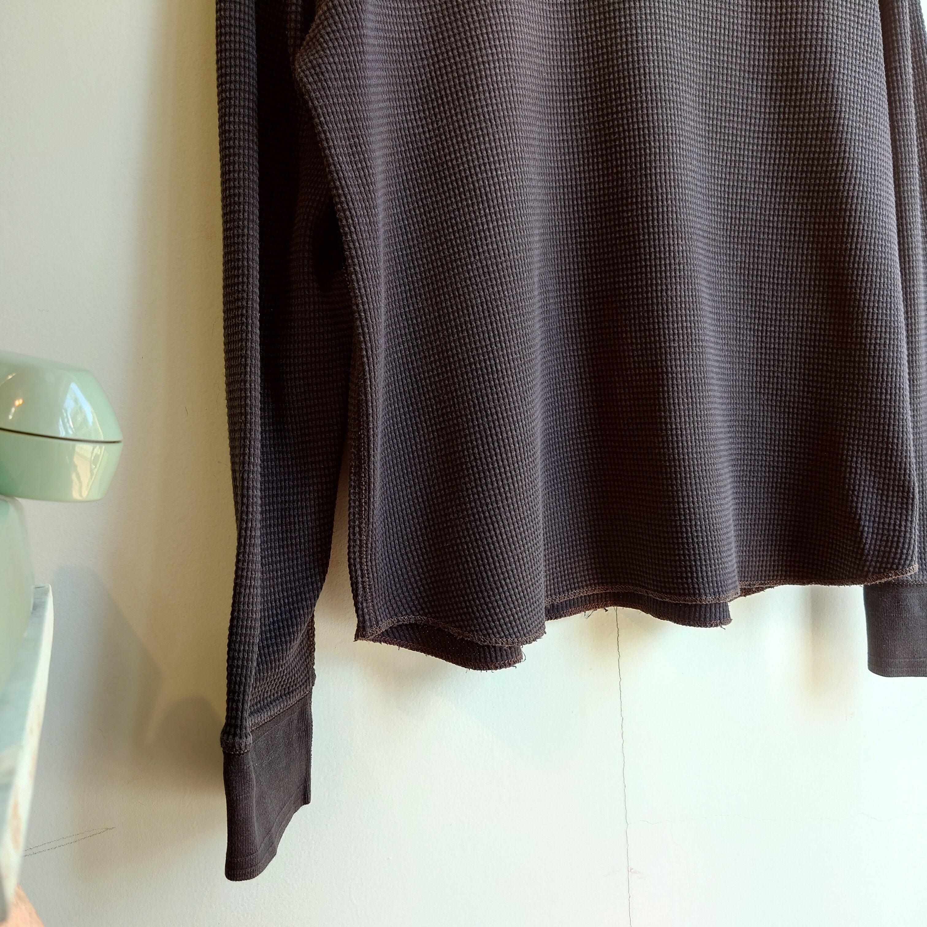 ワッフルの粒が大きめで、ザラッとした風合いが心地よいGAPの無地サーマル。ラウンドした裾の糸目や、ブリーチ加工がY2Kらしい雰囲気。所々ブラウンのステッチが効果的に使われた遊び心にも注目。