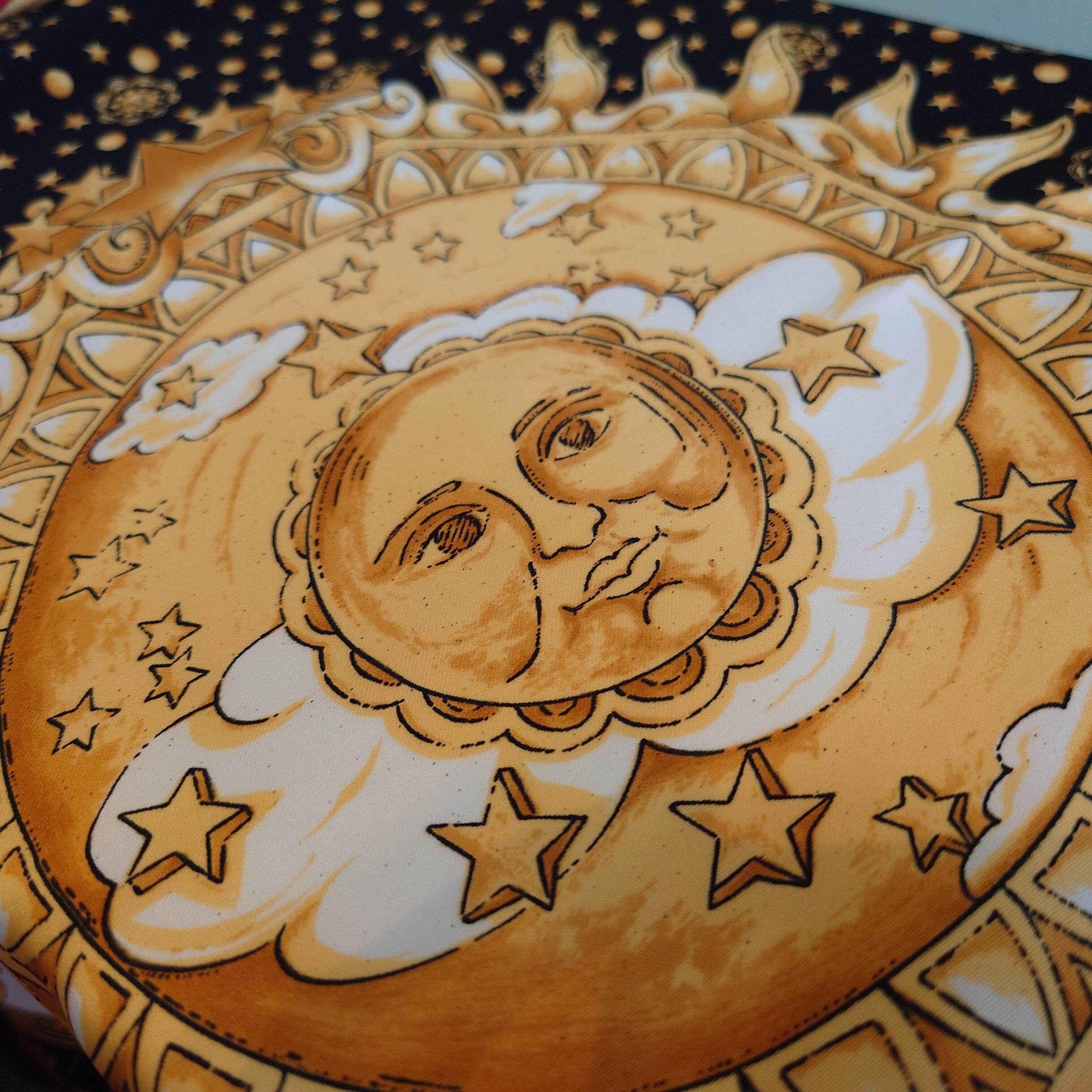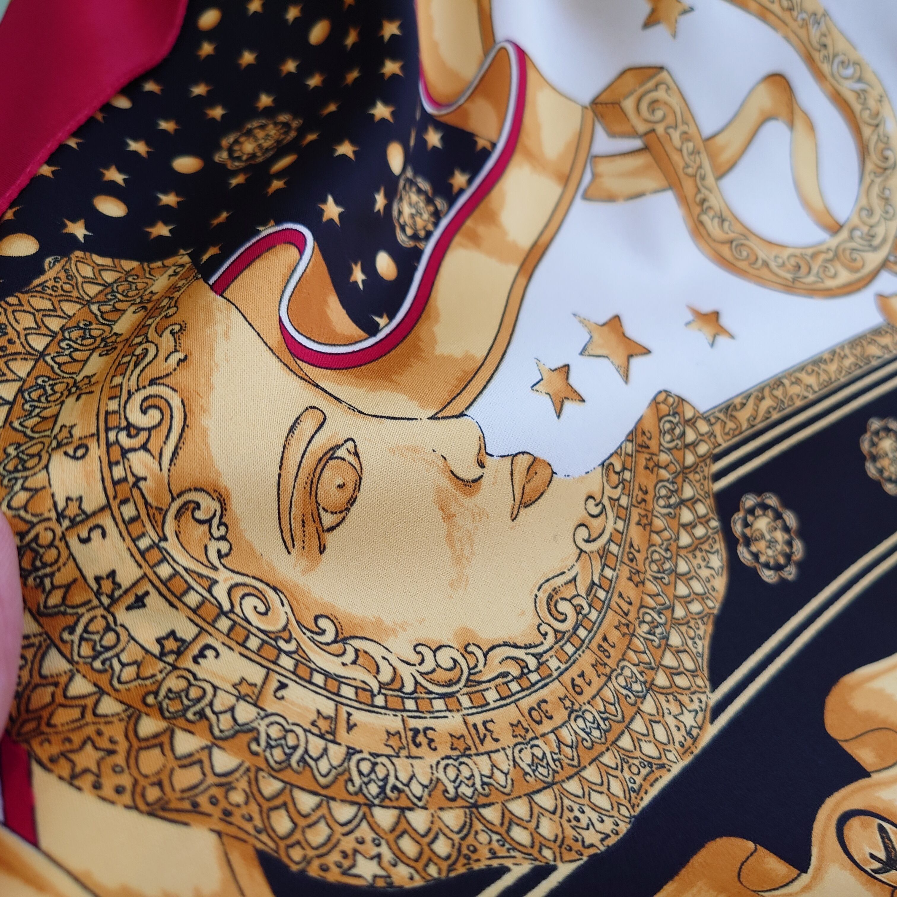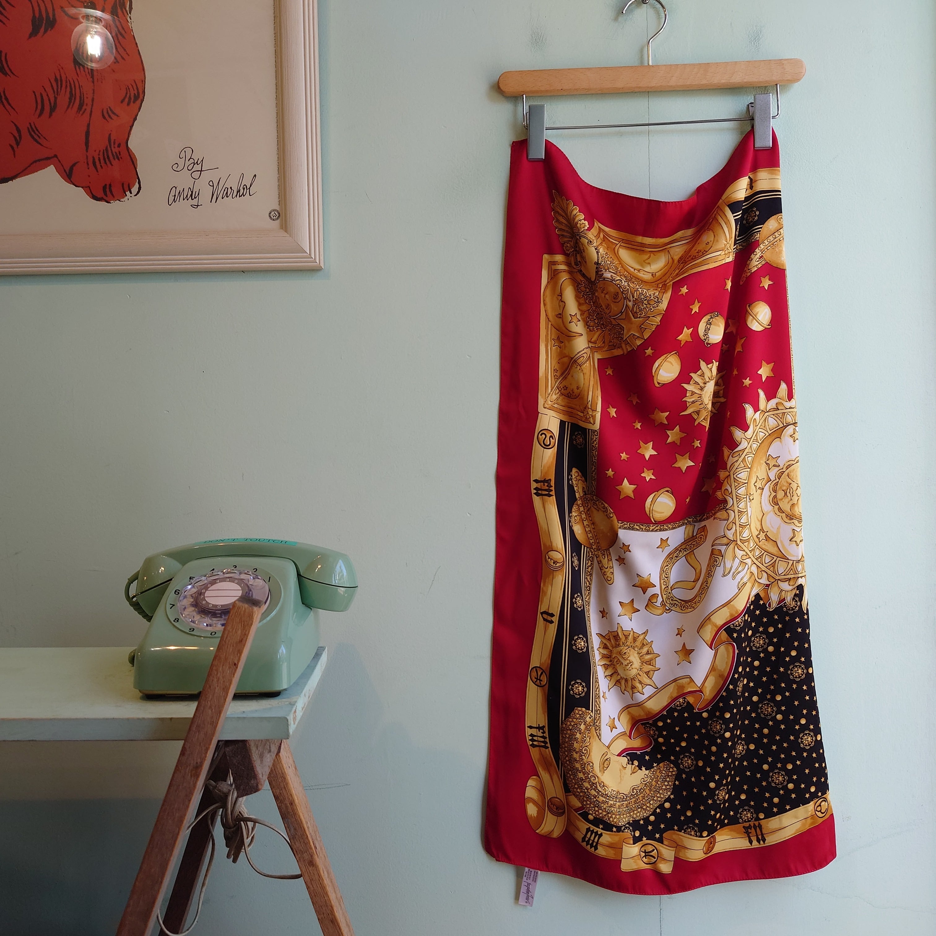 JCペニー系ストラブランドのヴィンテージスカーフ。占星術をモチーフにした、太陽、月、ヨーロピアンで古代的な柄がかわいい。