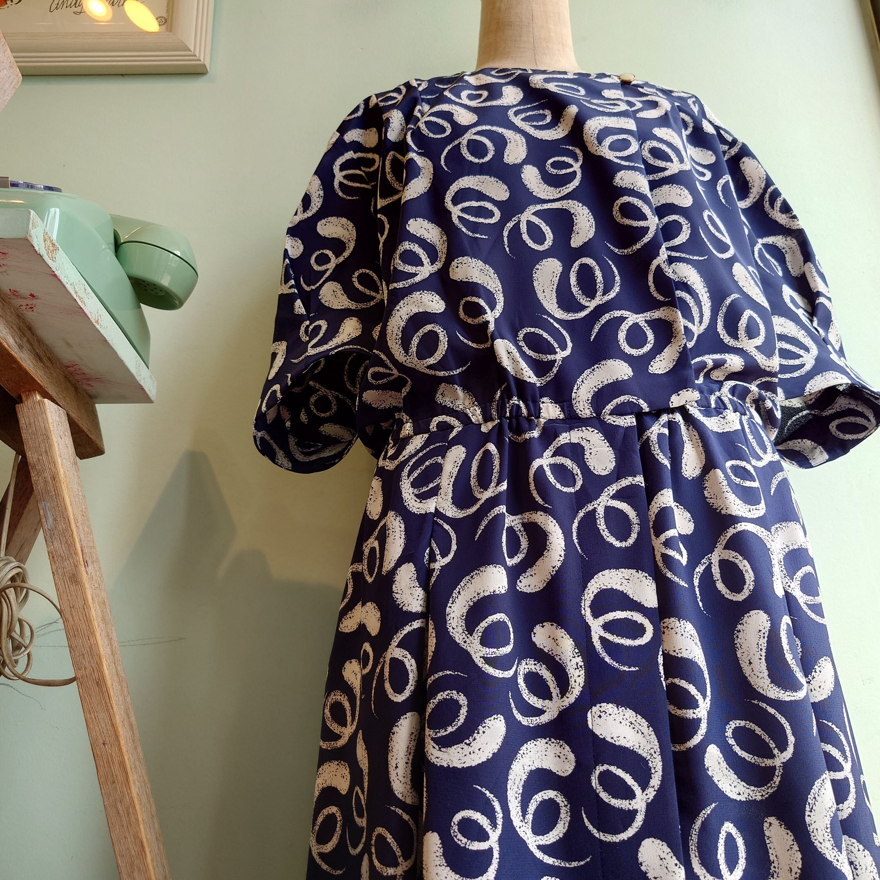 Liz Claiborneの総柄ワンピース。ふわっとしたトップスから、フレアする裾までひらひら感に包まれるようなシルエットが◎。トップはマントを巻くようなアシンメトリーな合わせ。濃紺×白の手書き風総柄も程よいポップさ。