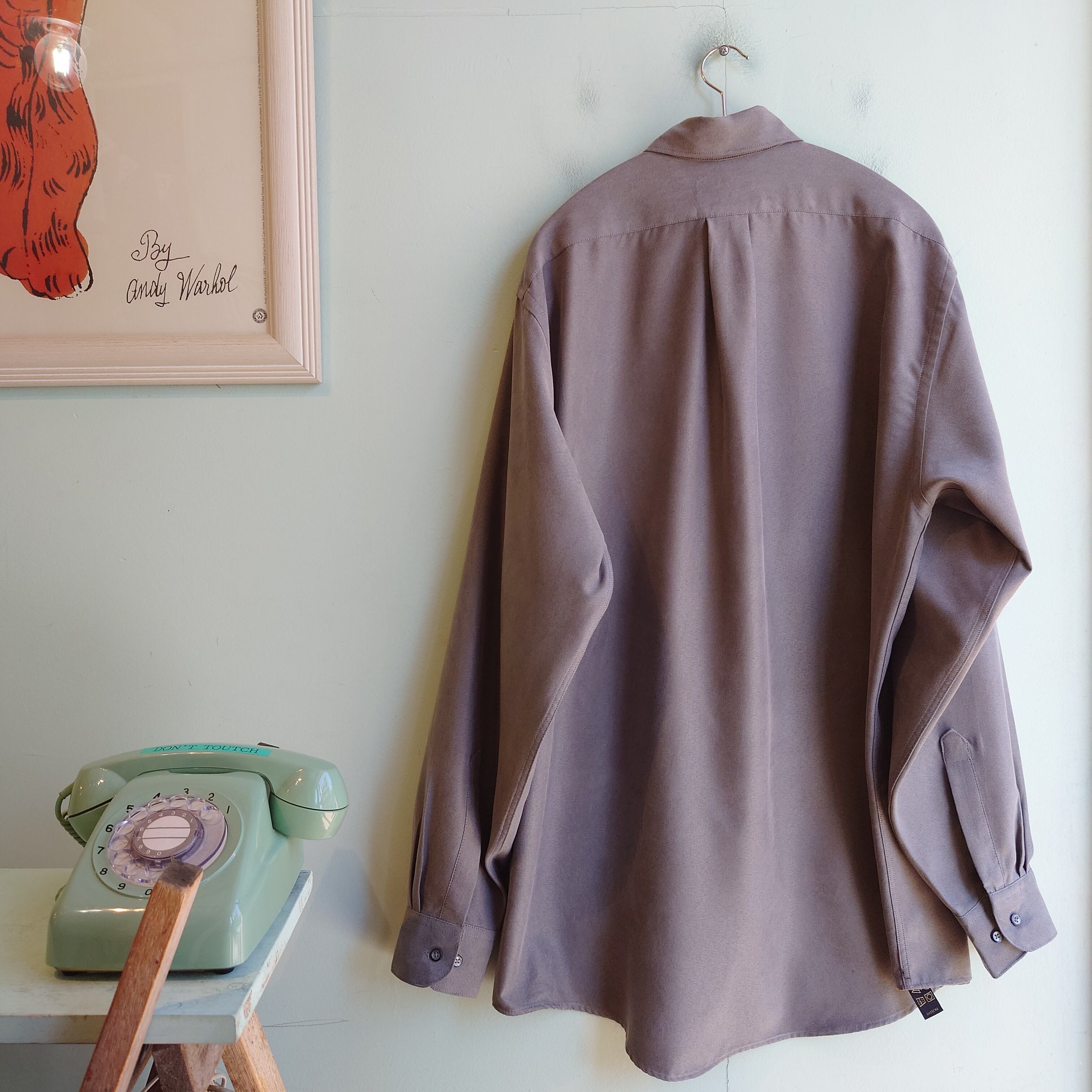 Van Heusenのフェイクスウェードシャツ。同ブランドの一般的なスウェードよりも、気持ちライトな素材感で、ふわふわ滑らかさありつつ、シルクシャツのようなひらひら感もあり。クールさも明るさも持ち合わせたグレーもいい。