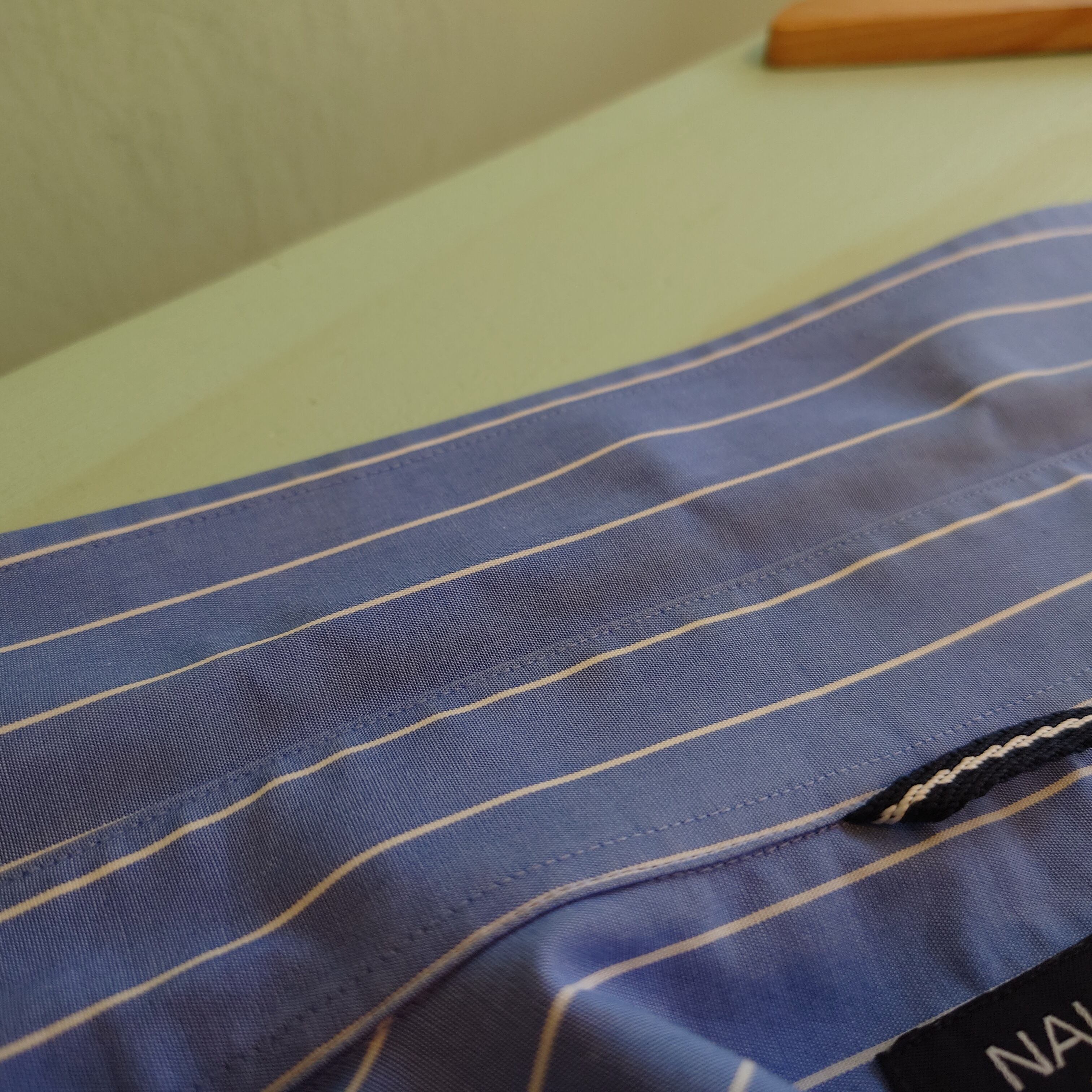 NAUTICAのストライプシャツ。A BIT TRIMMERフィットで、アメカジらしさ残しつつ、レギュラーフィットよりもわずかにスリム。パリッとしたコットンの気持ちよさはブランドアイテムならではで、いっきに爽やかさが加速しそうな1枚。