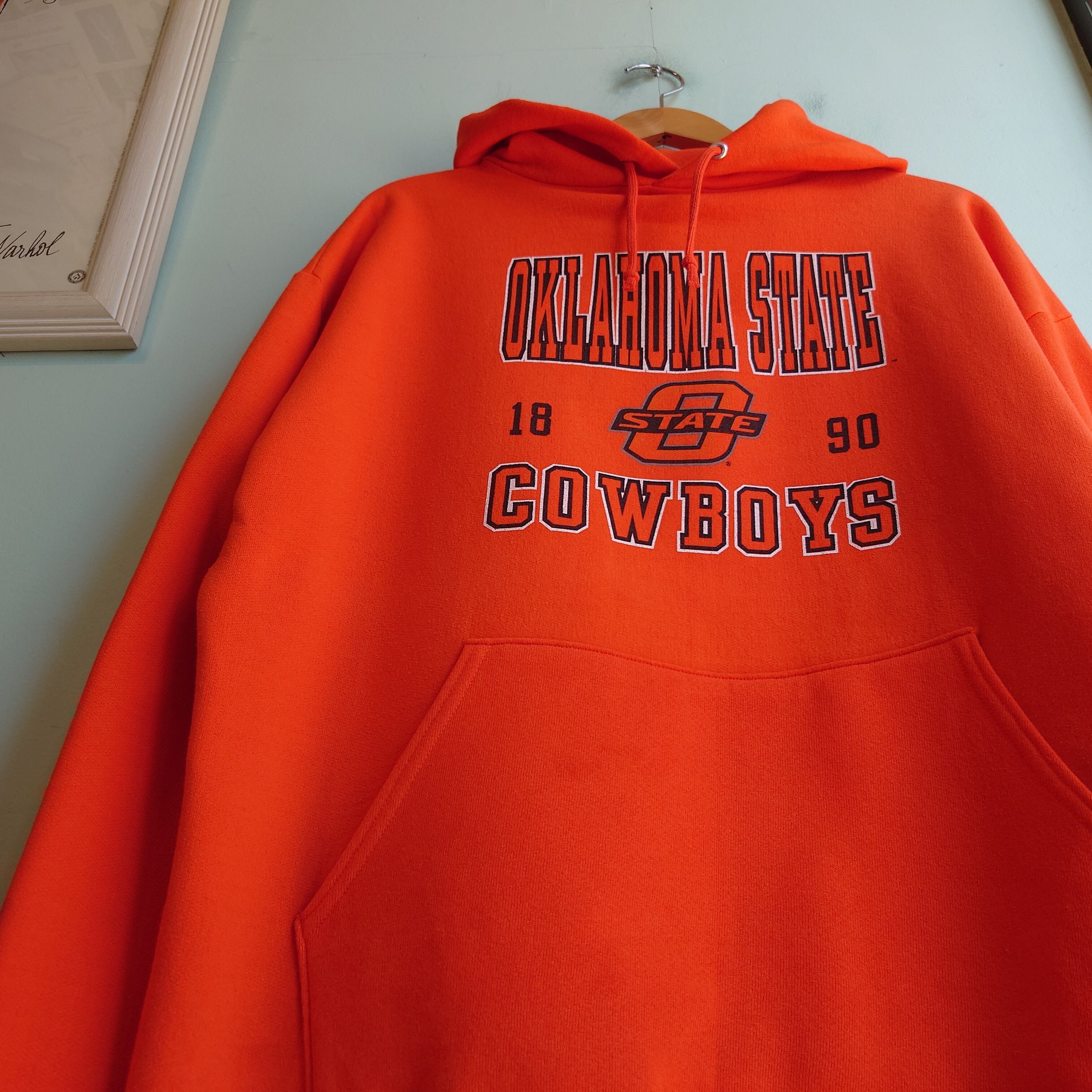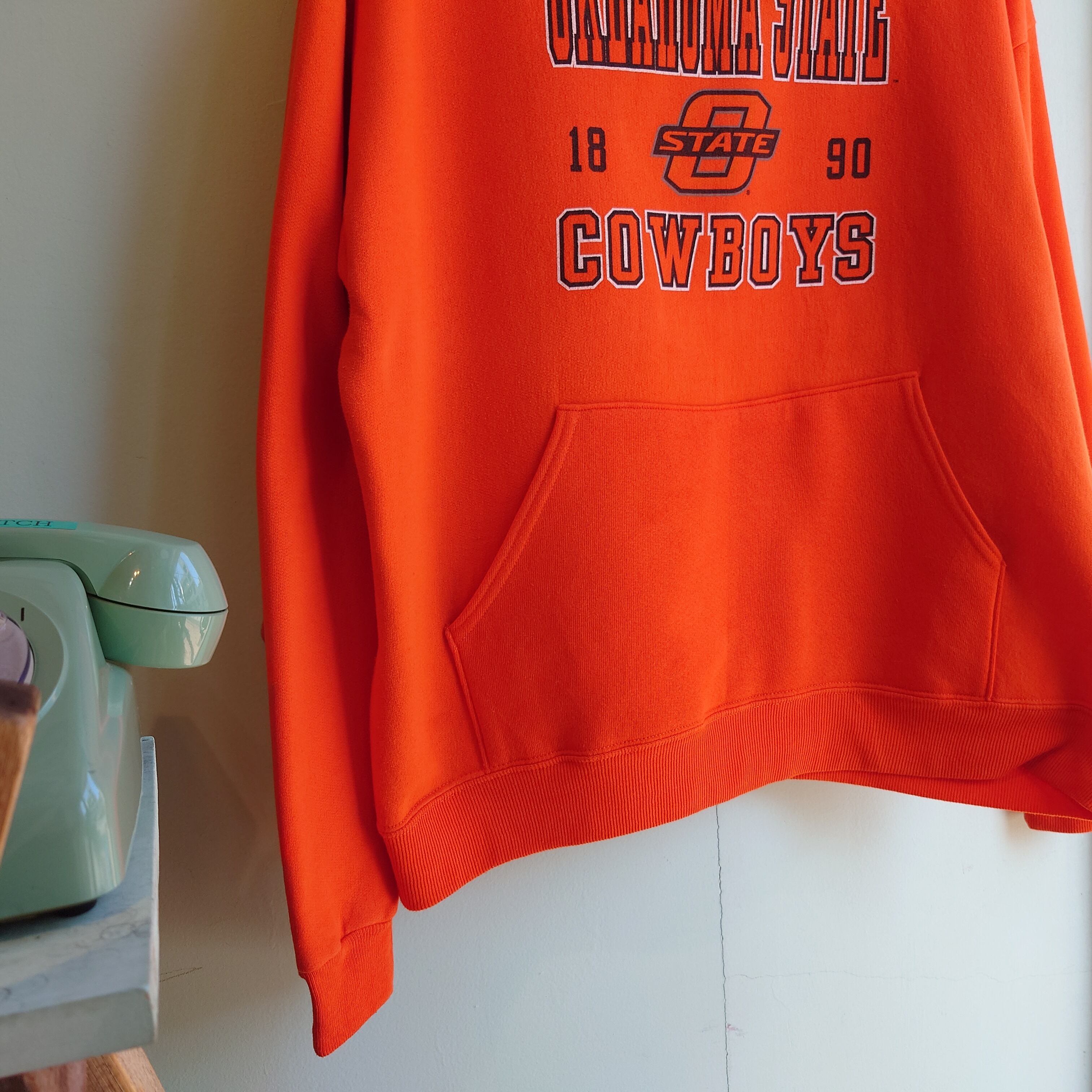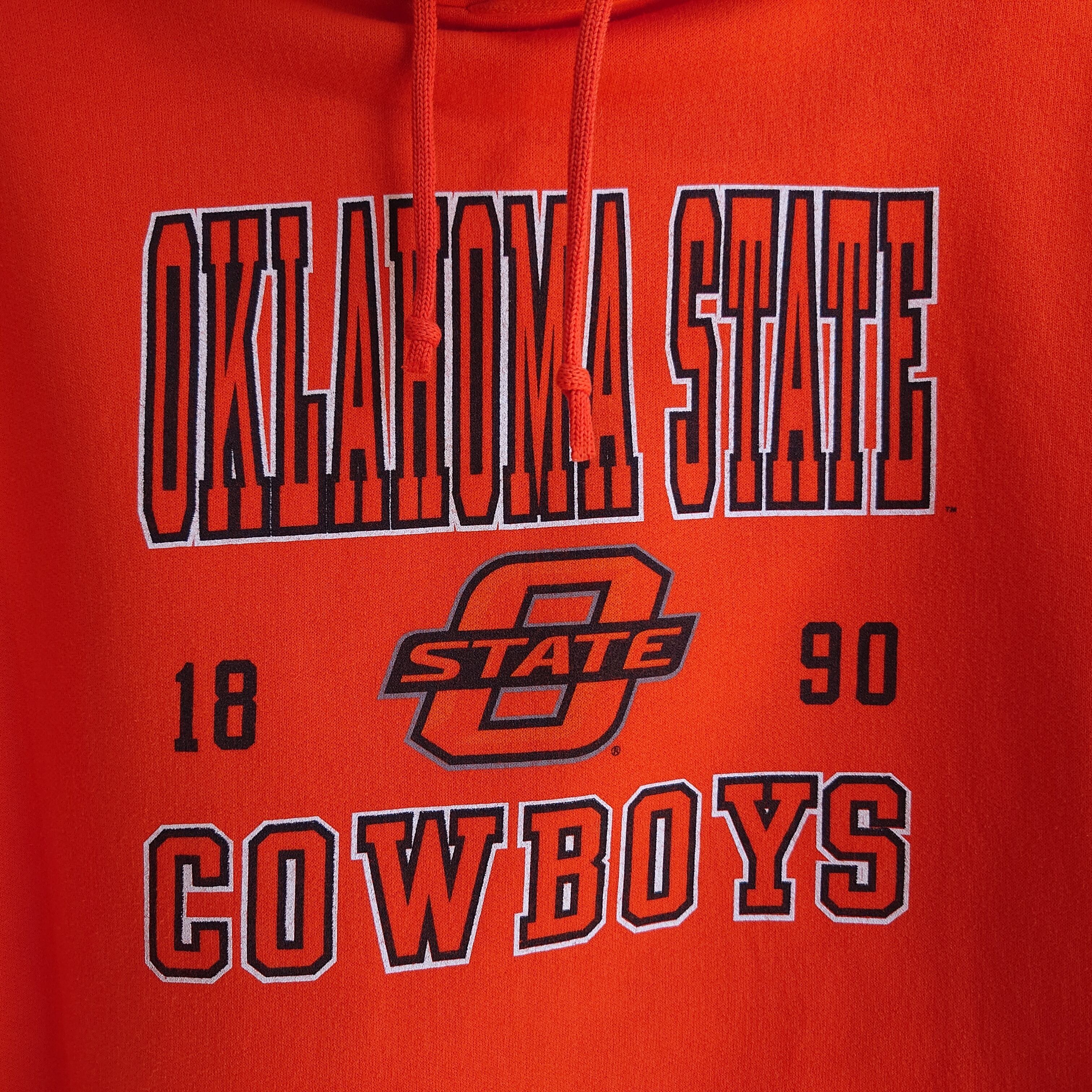 オクラホマ州立大学のカレッジパーカーです。スポーツチームであるカウボーイズの臨場感溢れるプリントがかわいい。これぞ古着のカレッジフーディーの雰囲気に、フレッシュなオレンジが最高。ワイドめショート感の着やすいシルエットも良し。