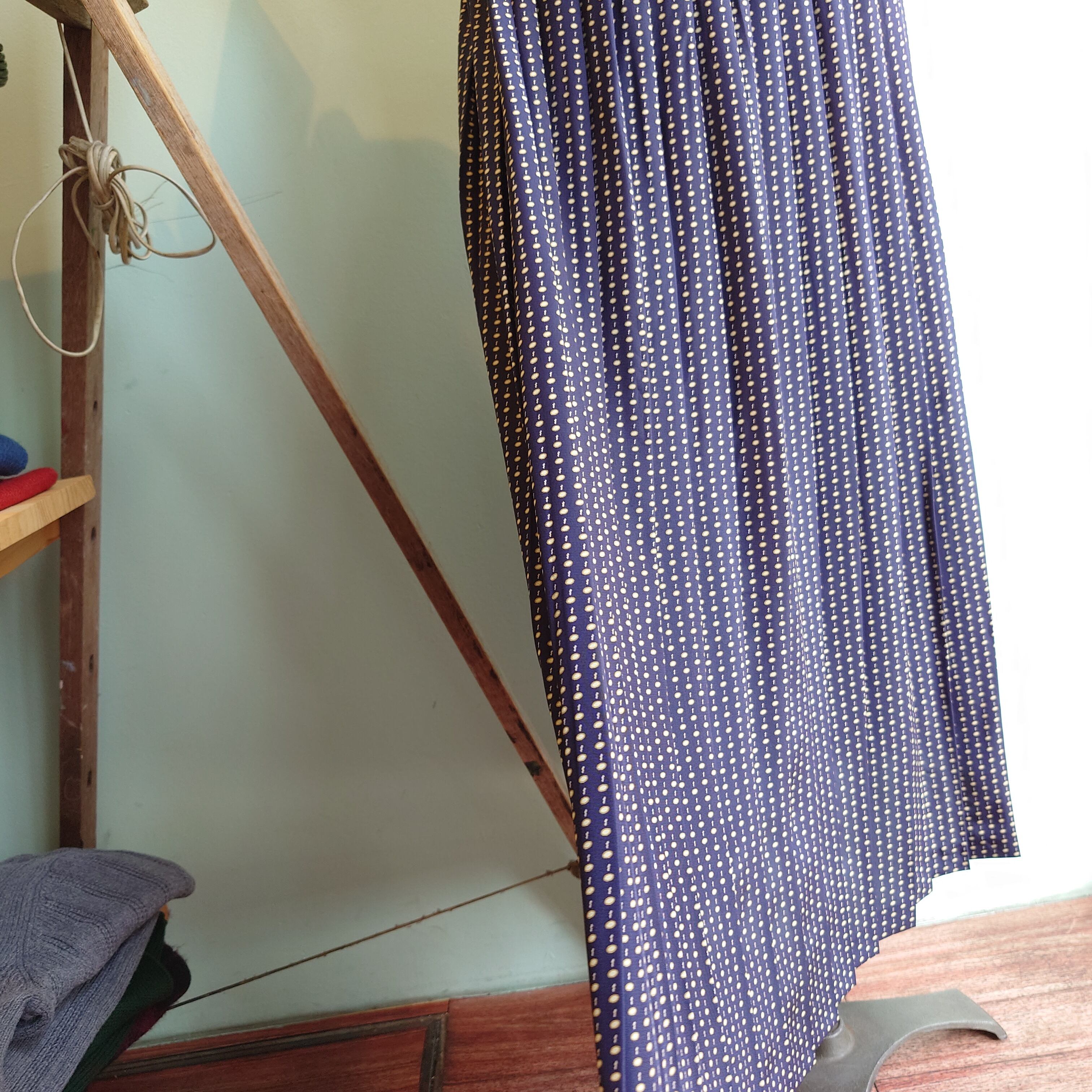 Leslie Fayのヴィンテージスカート。濃紺にボールチェーンのようなシンプルめな総柄がドレッシーで、スカーフのような上品さも。イージースカートらしい楽ちんさと大人っぽさのバランスが絶妙な1枚。