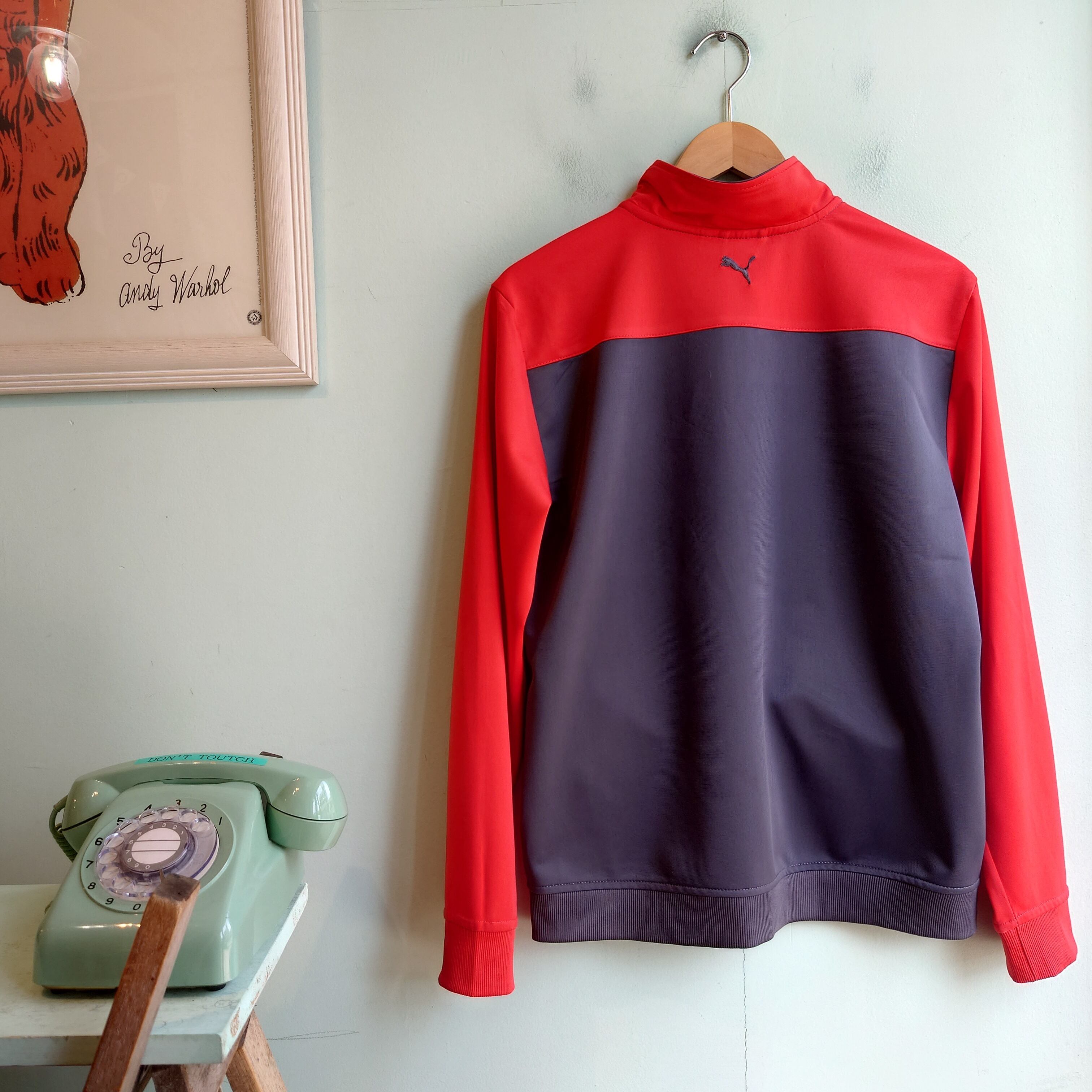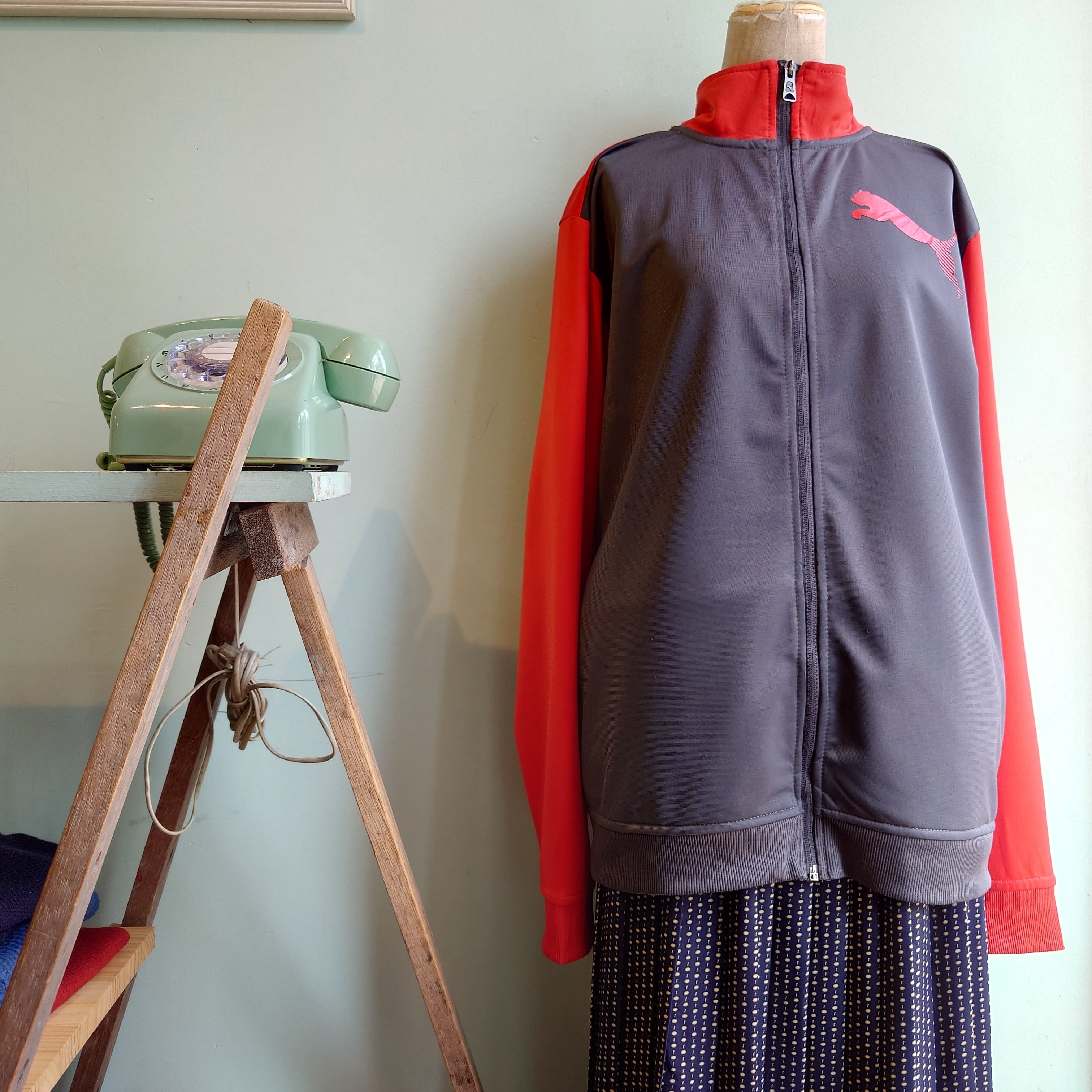 プーマのフルジップジャージ。フレッシュなレッドとグレーのコントラストが抜群の1枚。癖のない王道レトロなジャージらしいシルエットで、スウェット感覚で、レイヤードに、存分に着回せる1枚。キッズサイズ、レディースやメンズタイト派にも。
