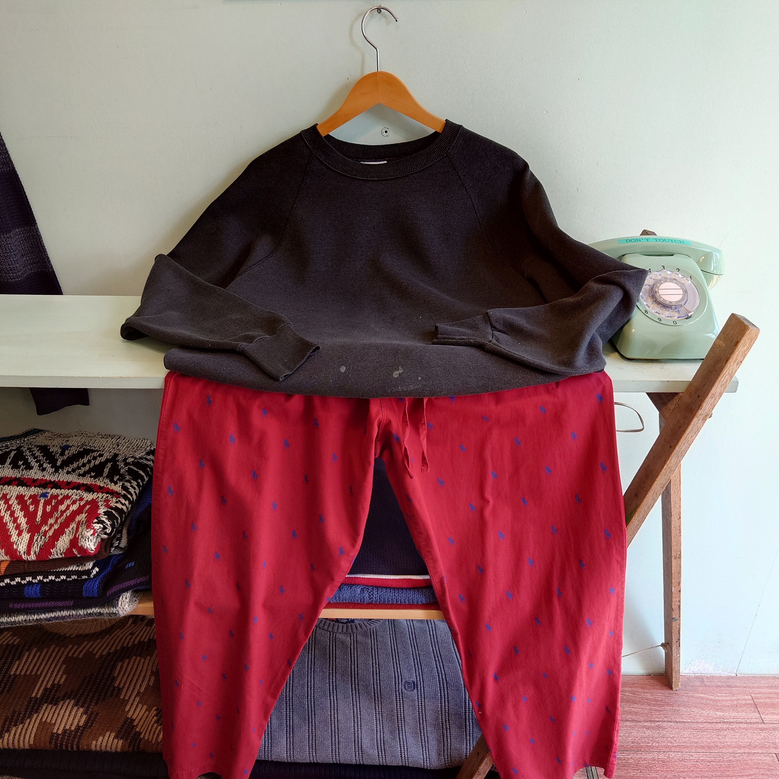 LEEの無地スウェット。レトロなラグランスリーブに、強い雰囲気が光る1枚。塗料やブリーチによるダメージが全体的にあり、単なる黒に収まらない絵になるかっこよさ。起毛も抜け気味でロンT+αの軽みもシーンによっては重宝しそう。
