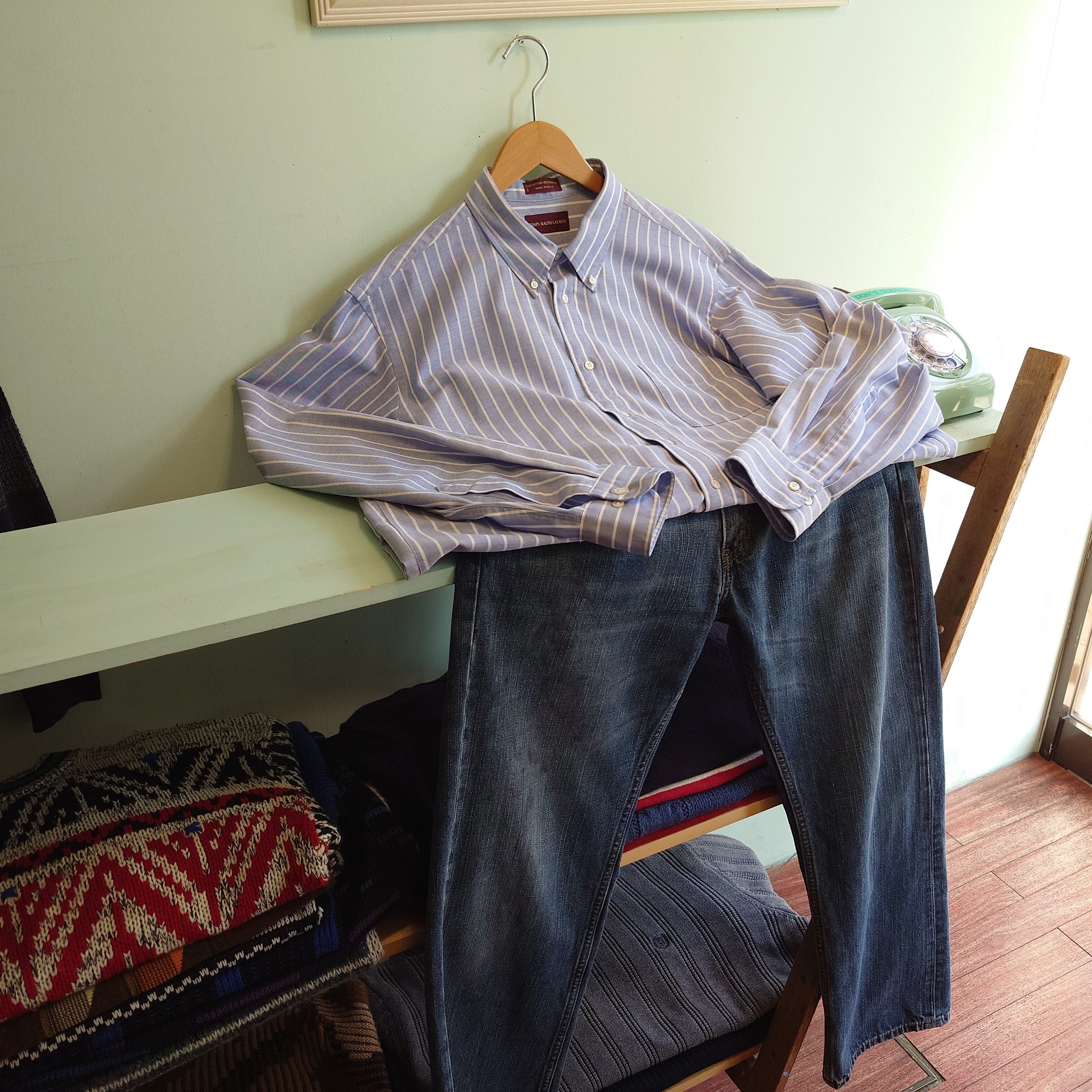 CHAPS RALPH LAURENのボタンダウンシャツ。サックス×ホワイトの伝統的なストライプも良し。プレッピー的スタイルから攻めたコーデまで、端正な雰囲気が着回し自在。