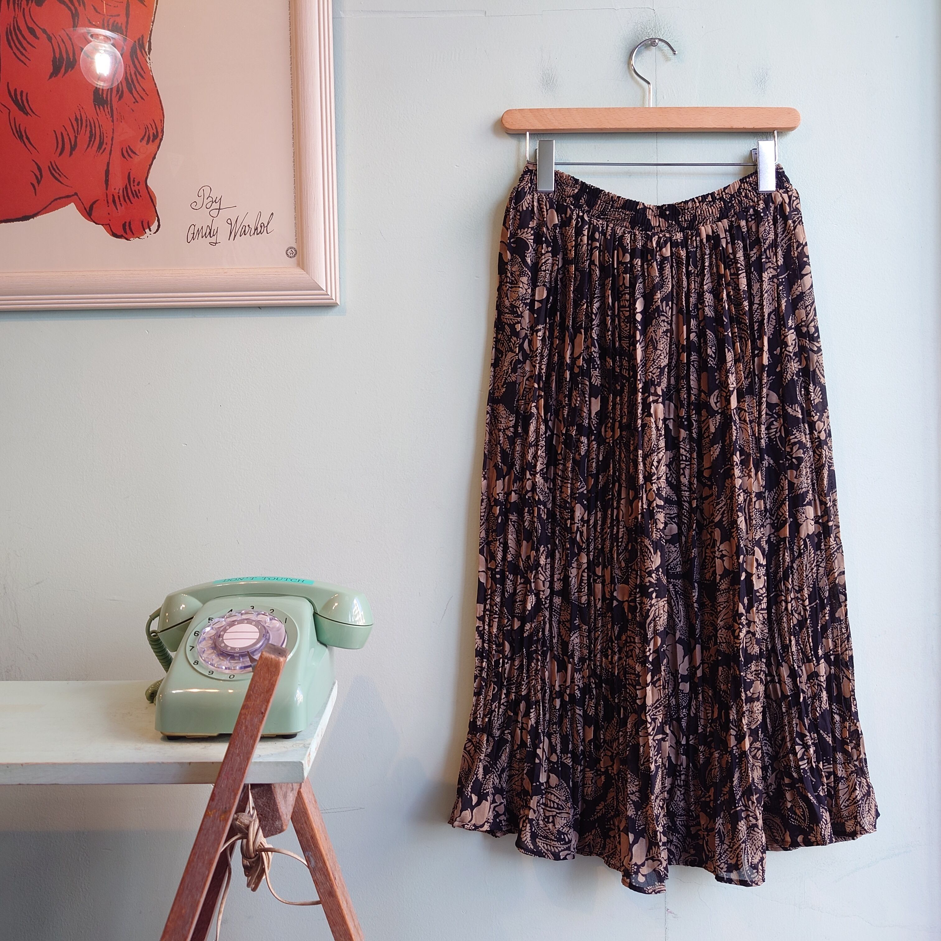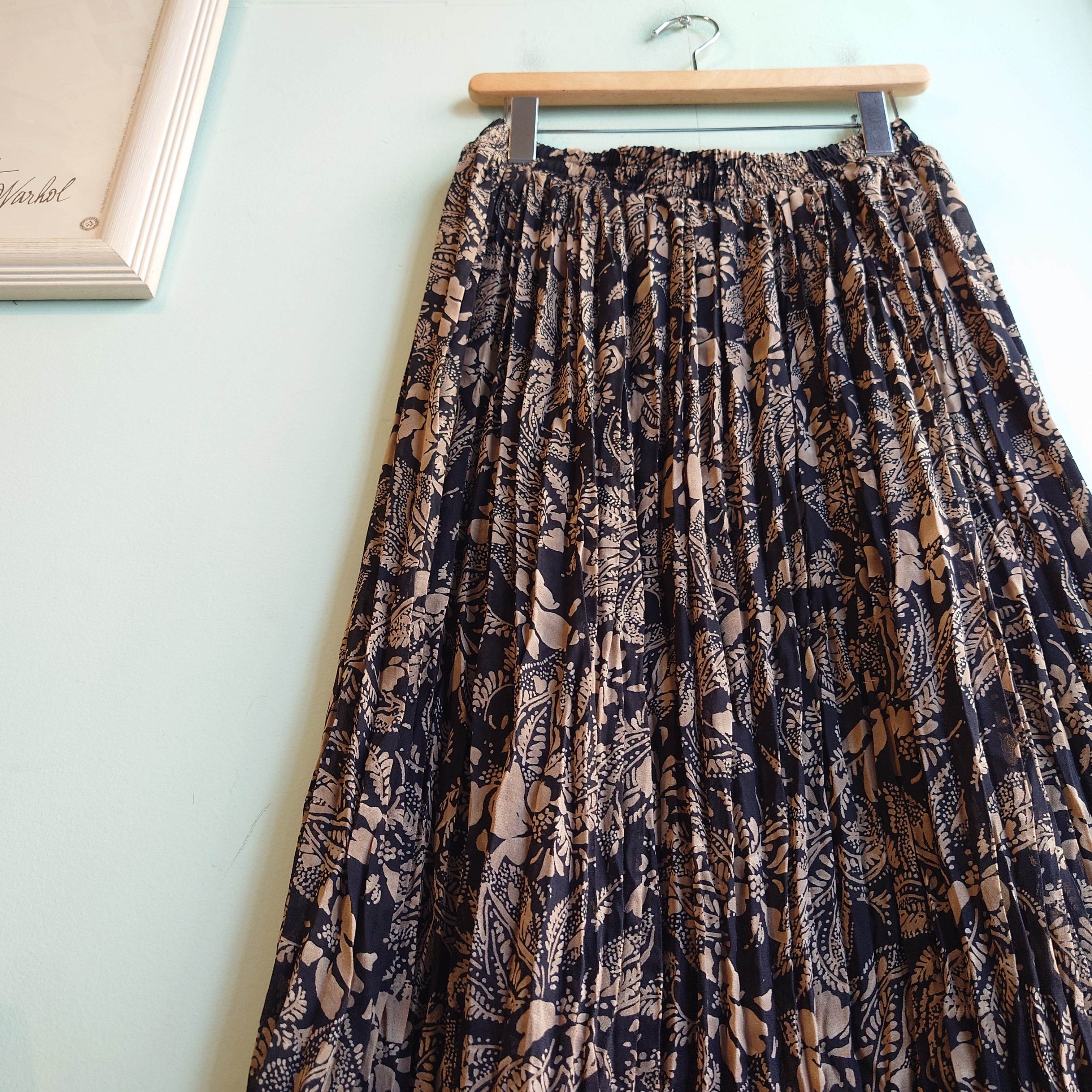 ピシッとしたプリーツでは無く、ランダムな"くせ'がついた織りのルーズな雰囲気がかわいい、ヴィンテージスカート。ブラックにベージュで描かれたペイズリーやフローラル系の総柄はドレッシーだけど、織りの雰囲気でアジアンやエスニック風よりに。ややシアー感があるのも抜群に大人っぽい。