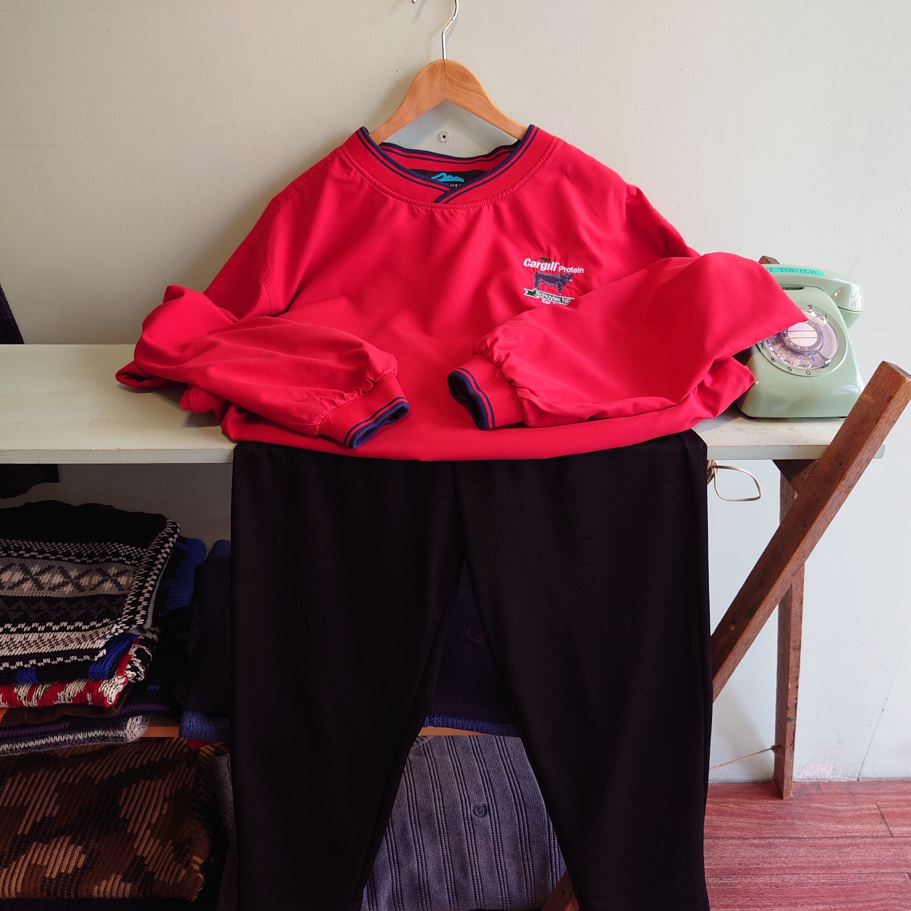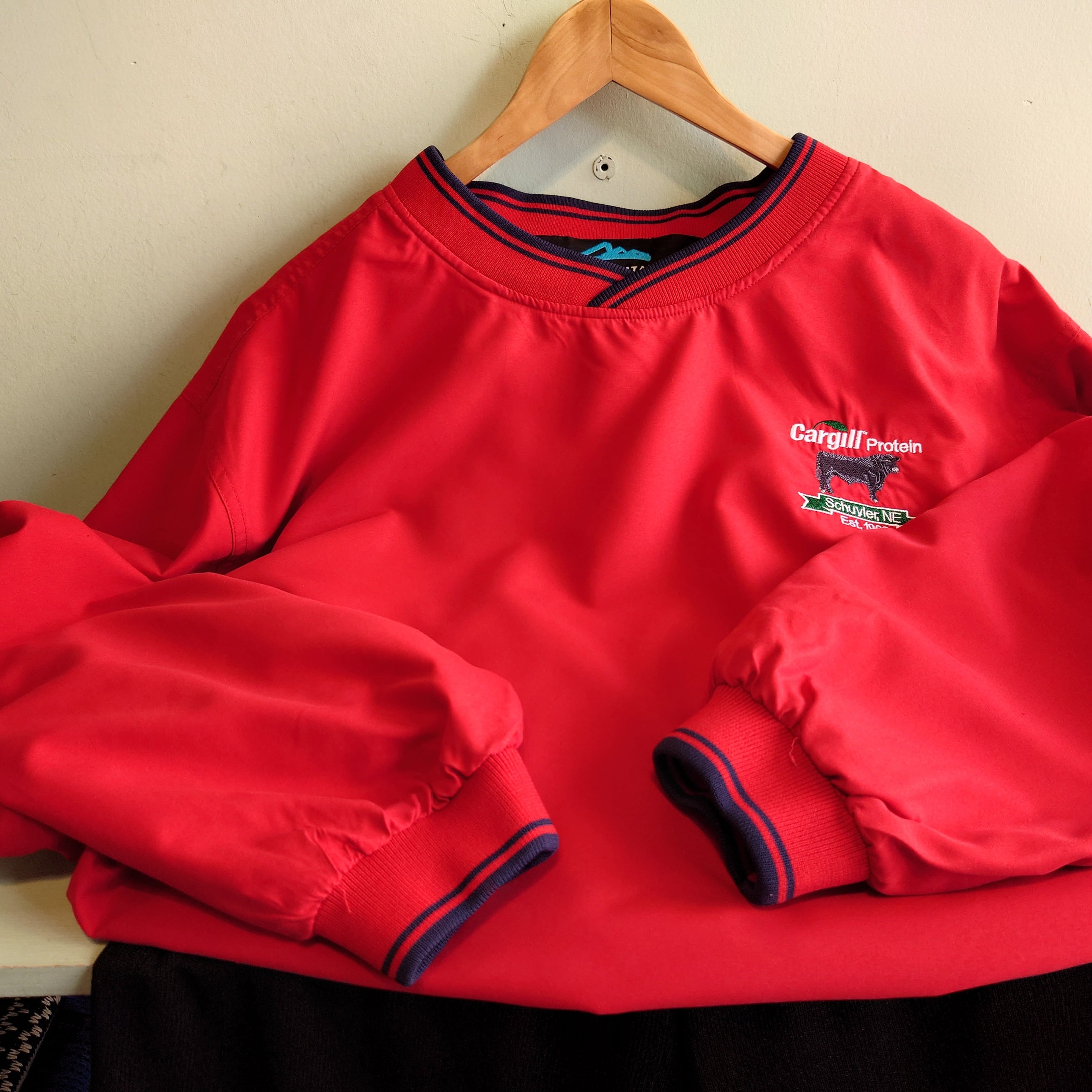 ★米国農業/畜産大手、カーギル社のプルオーバージャケット。黒い牛をモチーフにしたアニマル刺繍がかわいい。レッドはウォータープルーフ系の素材で、ほんのりスウェードをコーティングしたようなマット感も。両サイドにポケットあり◎、黒いリンガーの引き締まり感も抜群。