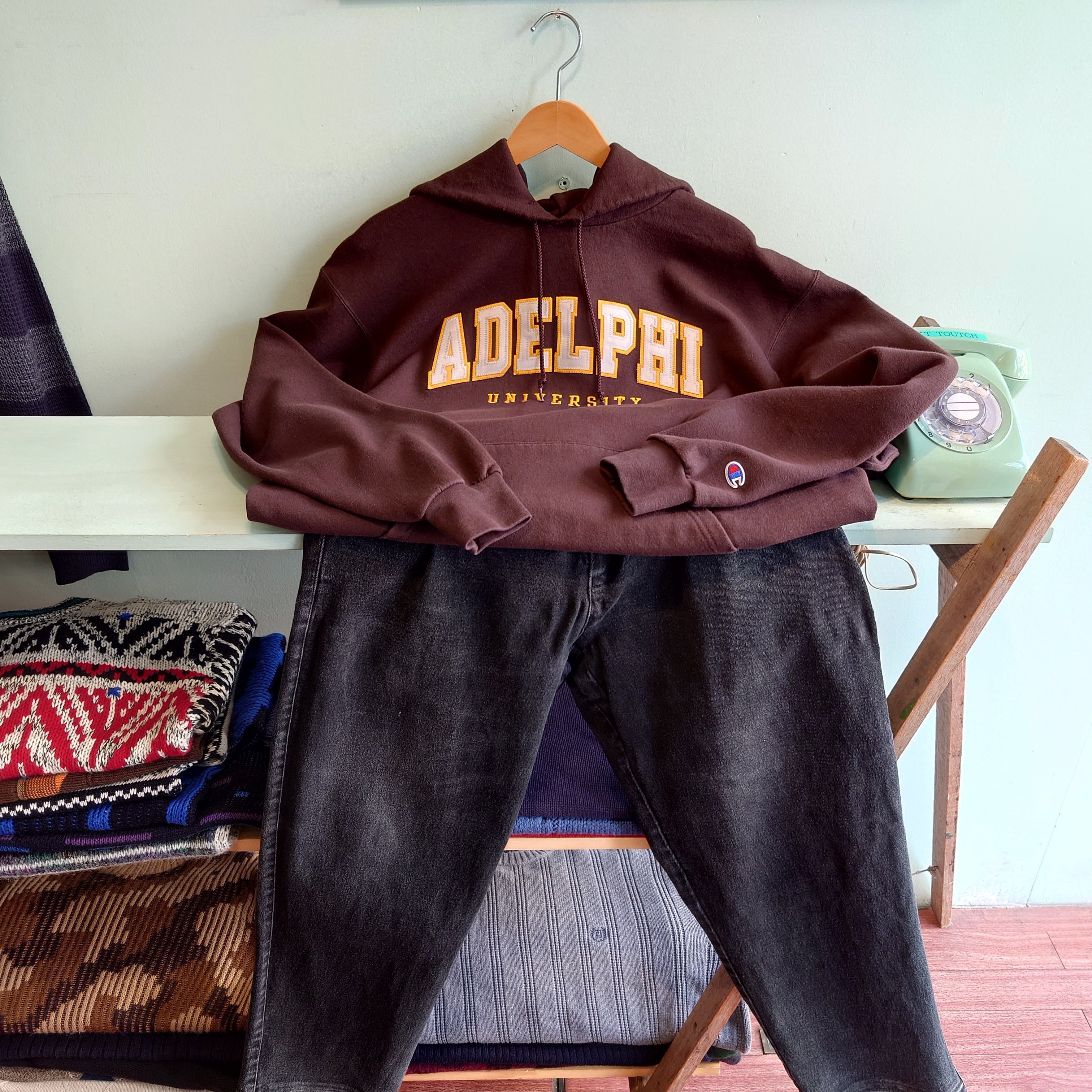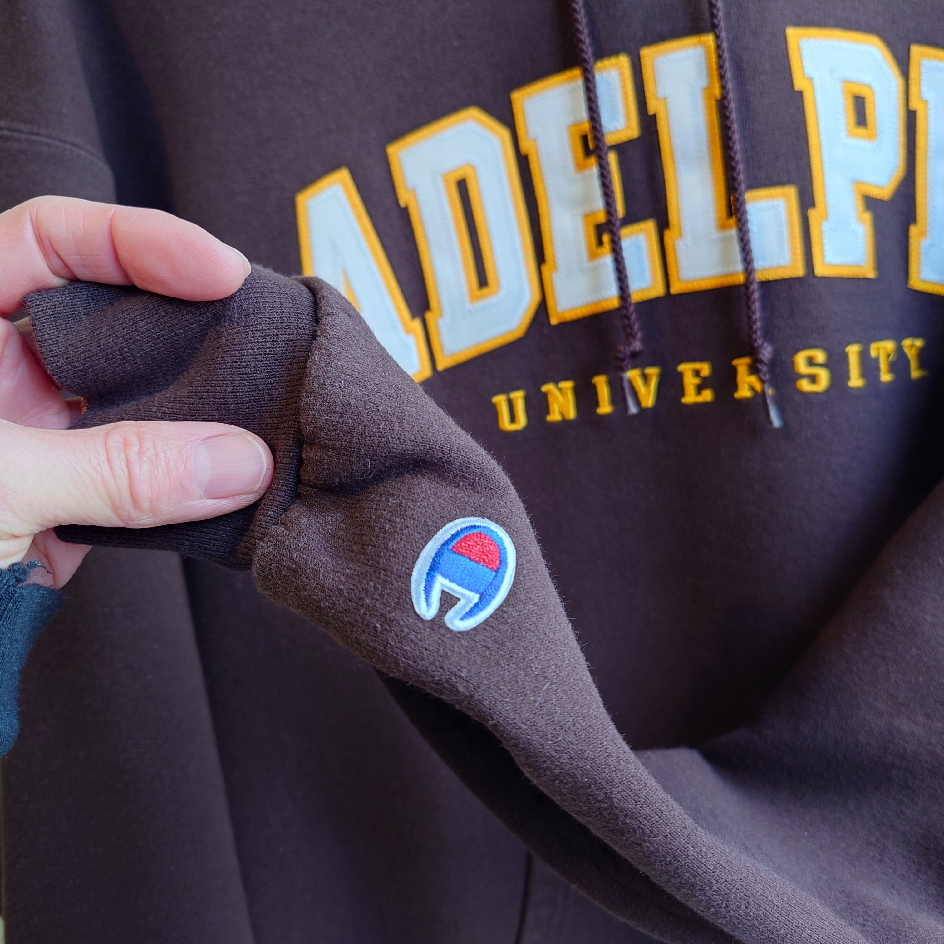 アデルファイ大学のカレッジ系スウェットパーカー。カレッジスウェットの中でもレアな、チョコレートブラウンがアーシーでかわいい。アップリケと刺繍の凸凹感も抜群で、Championらしいボディーに映える1枚。カレッジらしい元気さを大人っぽく合わせれるグッドアイテムです。