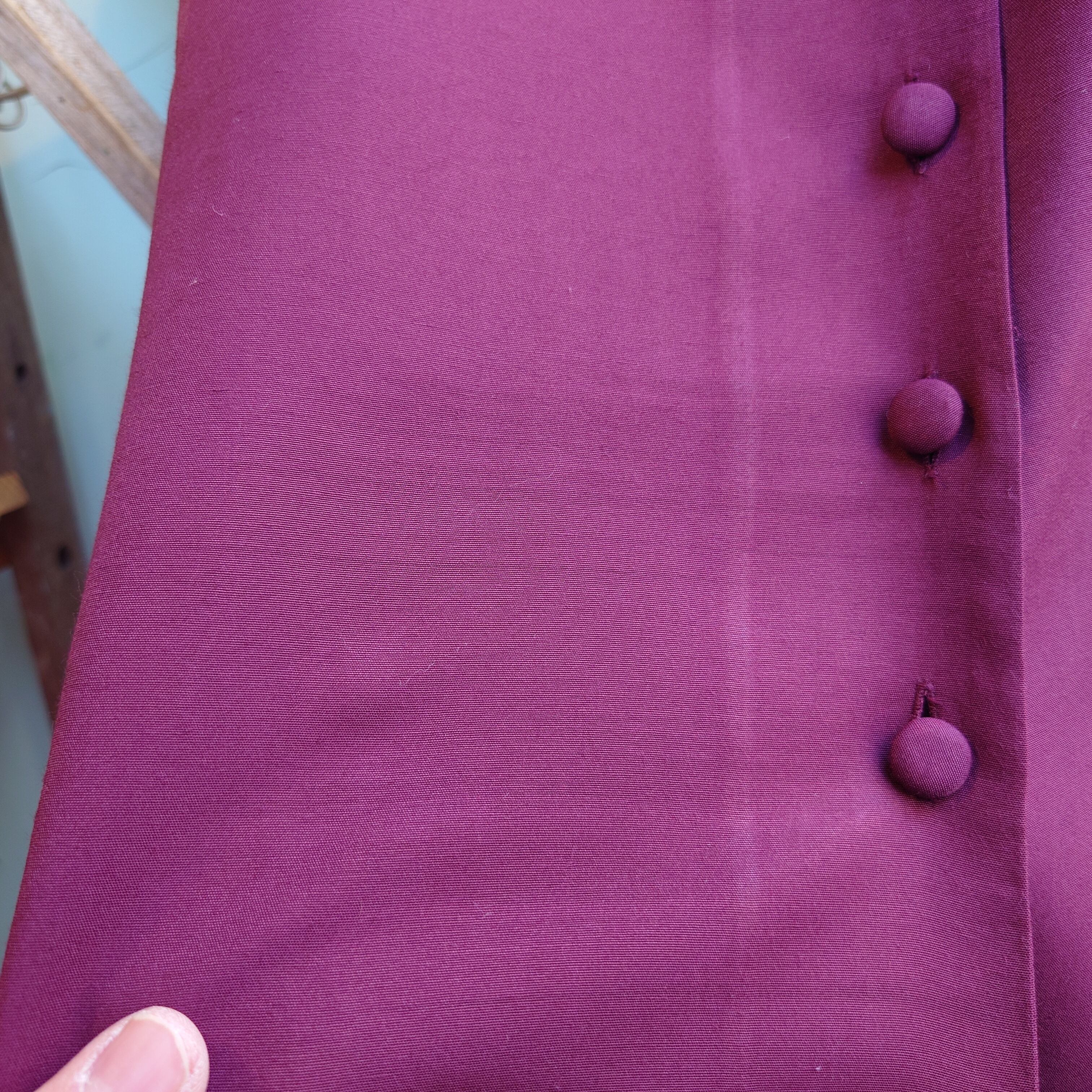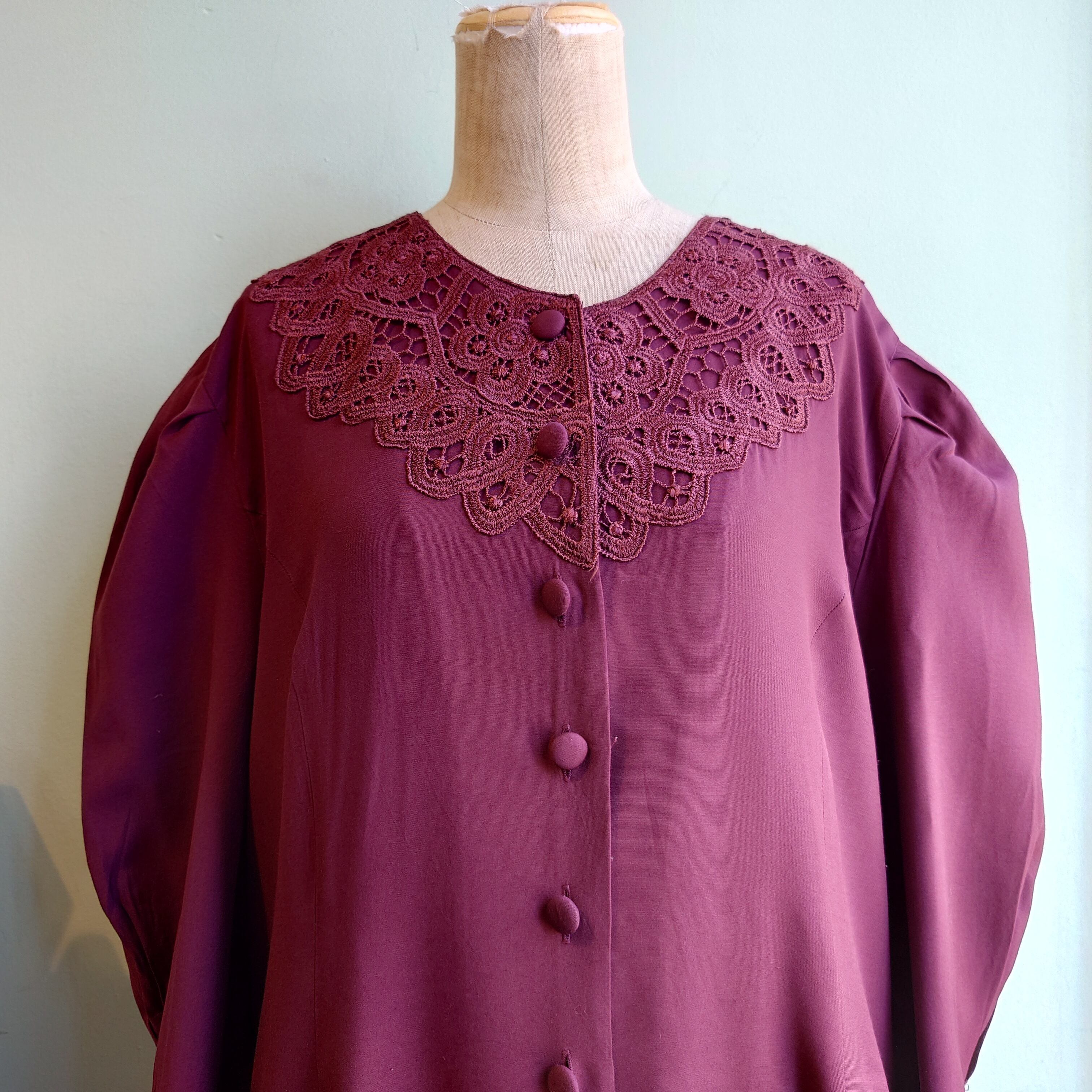ナイトウエアのようなドレッシーなサテン感があるボルドーがかわいいヴィンテージドレス。裾にかけてかなり強めにフレアするカーブは、紐でウエストマークすればより女子感強めに。レースの立体感やパフのニュアンスも絶妙。前開きスタイルでレイヤードも自在、紐は前でも後ろでもOK。