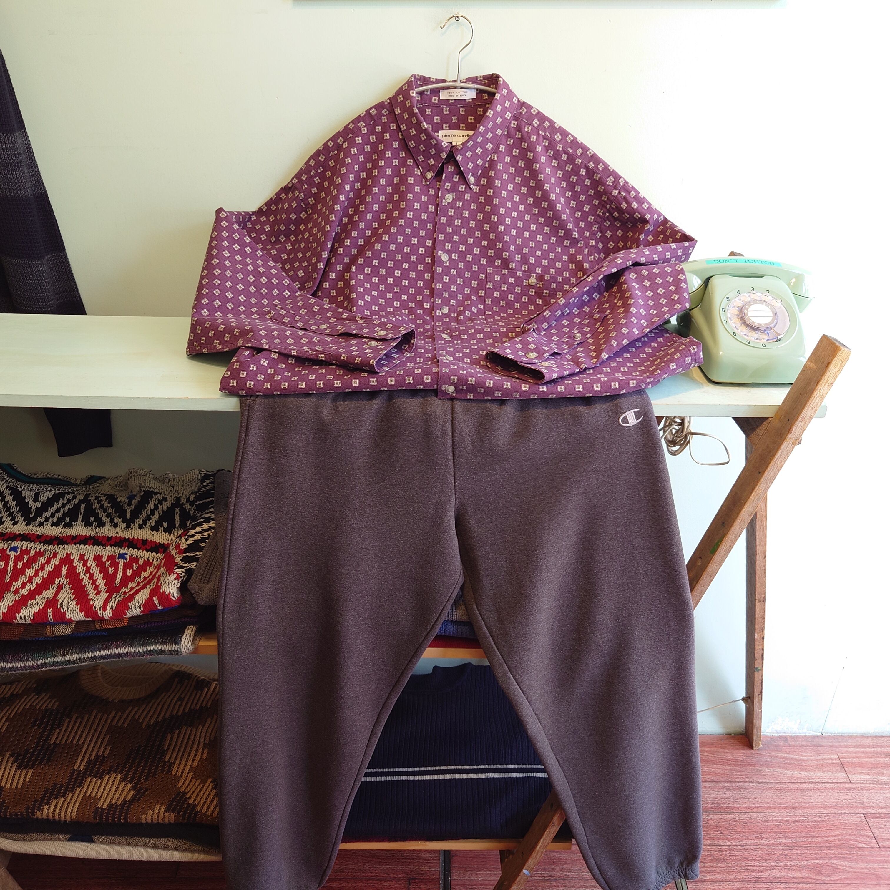Pierre Cardinの総柄ドレスシャツ。コットン素材ながら、スムースなタッチとミニマムなパターンがドレッシーな1枚。ストンしたボックスシルエットと、小豆やパープル味に近い色合いはナイトウエアのような雰囲気も。普段柄シャツを着ないお客様にも着やすい1枚です。