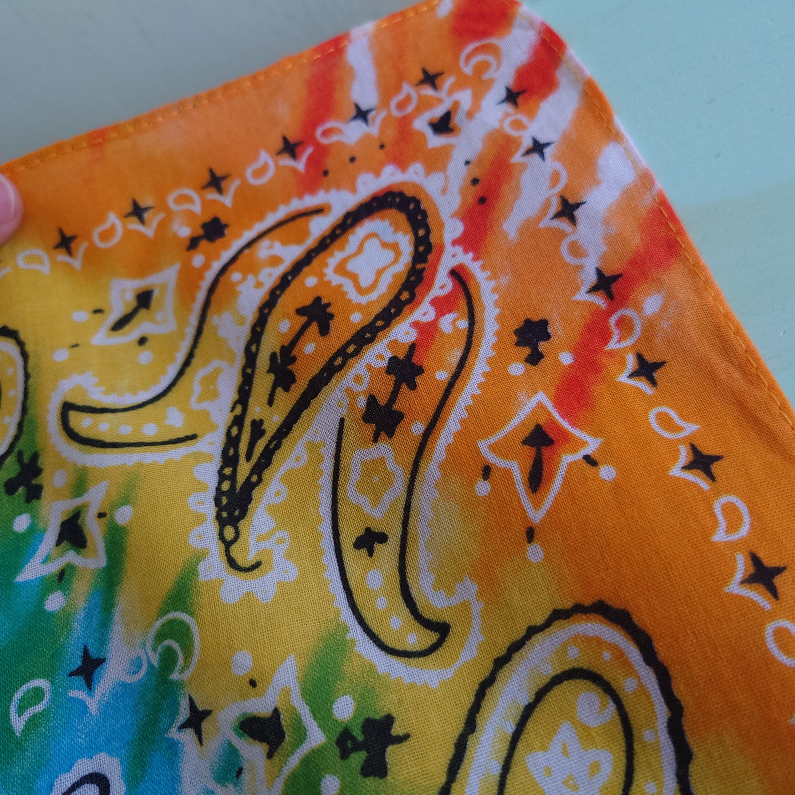 ★定番ペイズリー柄に、ハッピーなタイダイ染がリンクしたコットンバンダナ。ポケットからちらっと見えるだけでコーデを印象的にするやつです◎